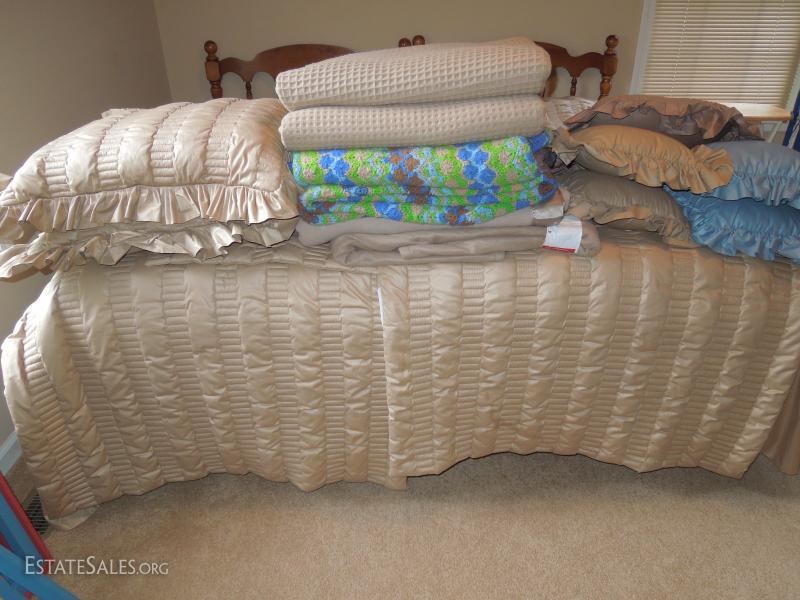 Pair of Ethan Allen Ruched Quilted Beige Bedspreads and matching pillow shams