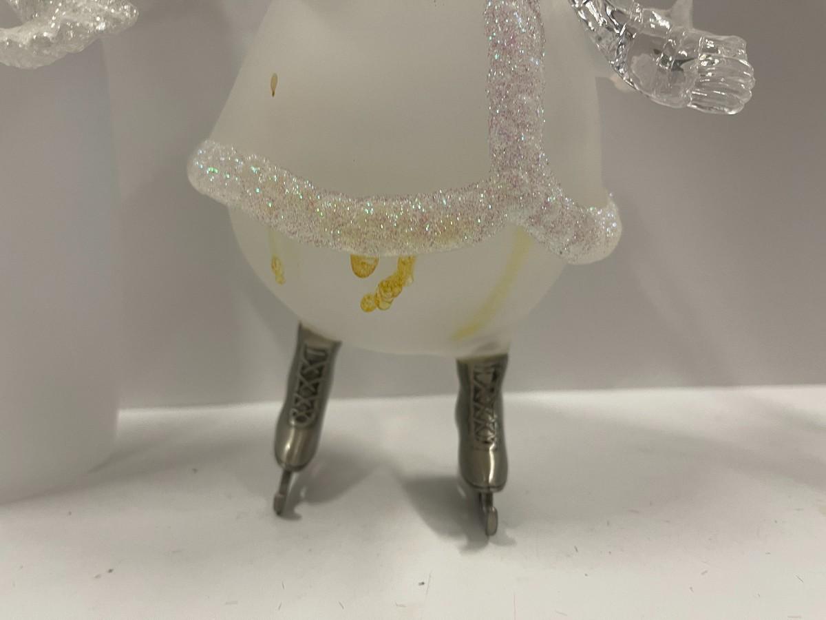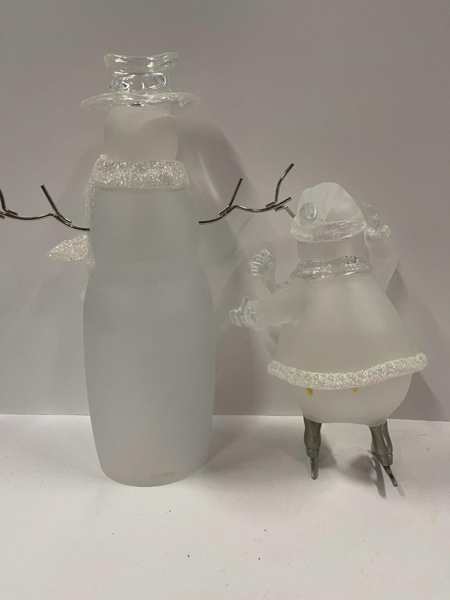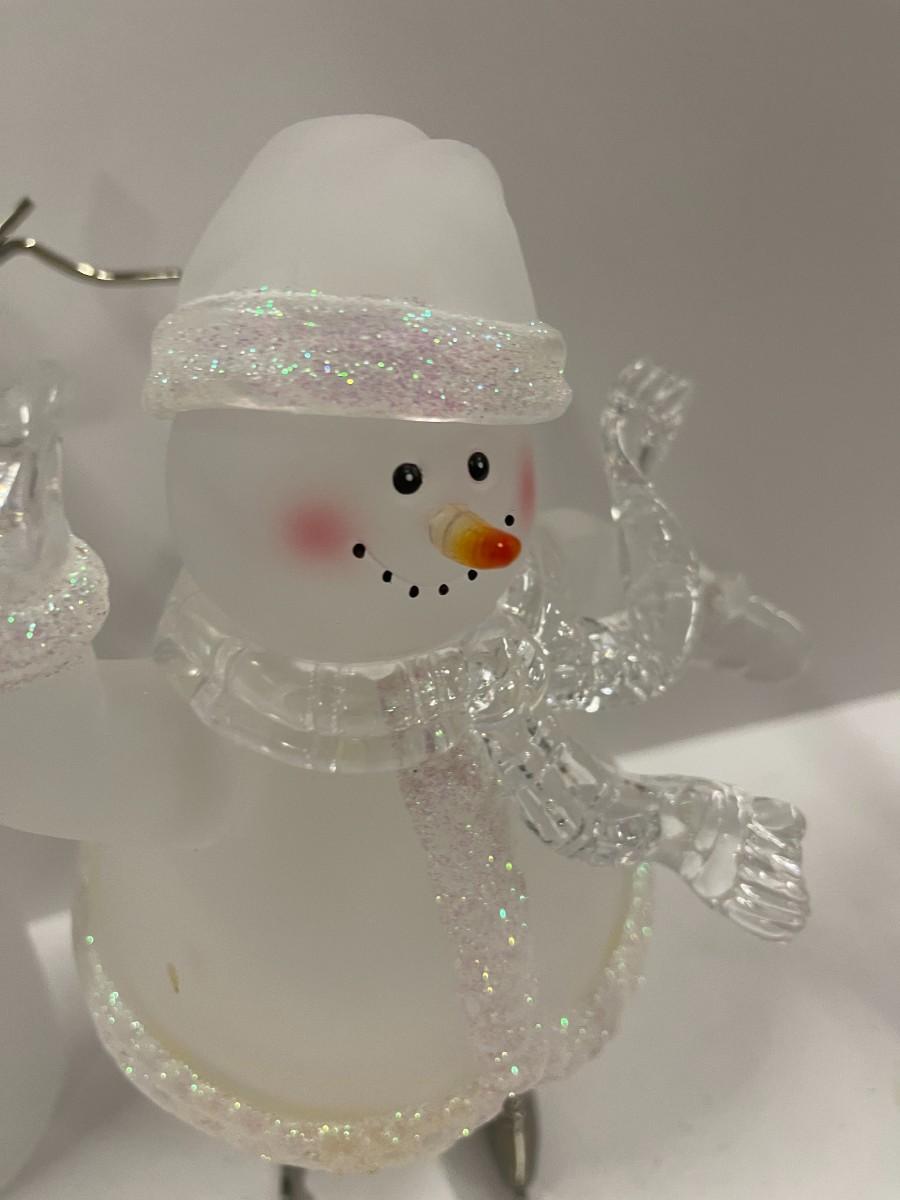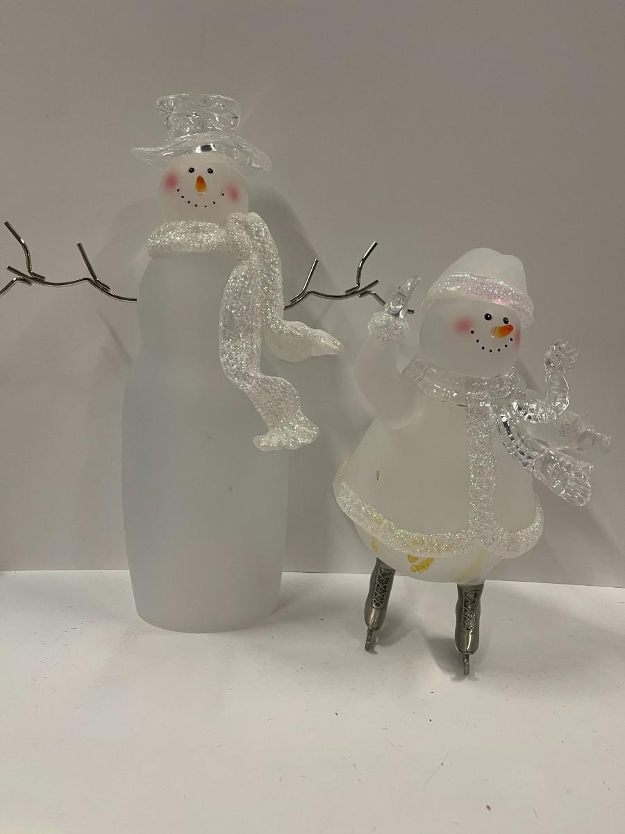Lot of 2 acrylic snowmen, one is House of Lloyd ice skating snowman (9 1/2") and the other has metal arms and glittering scarf (13). Please examine photos carefully for condition.