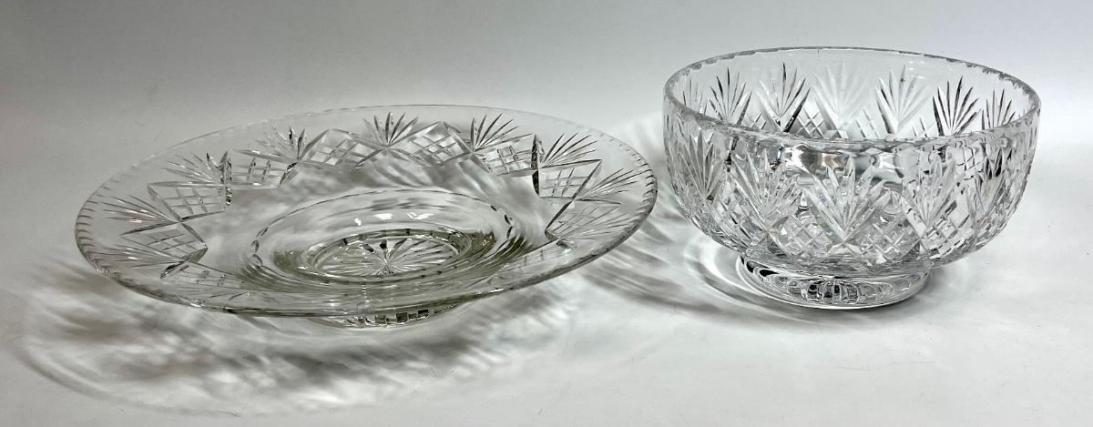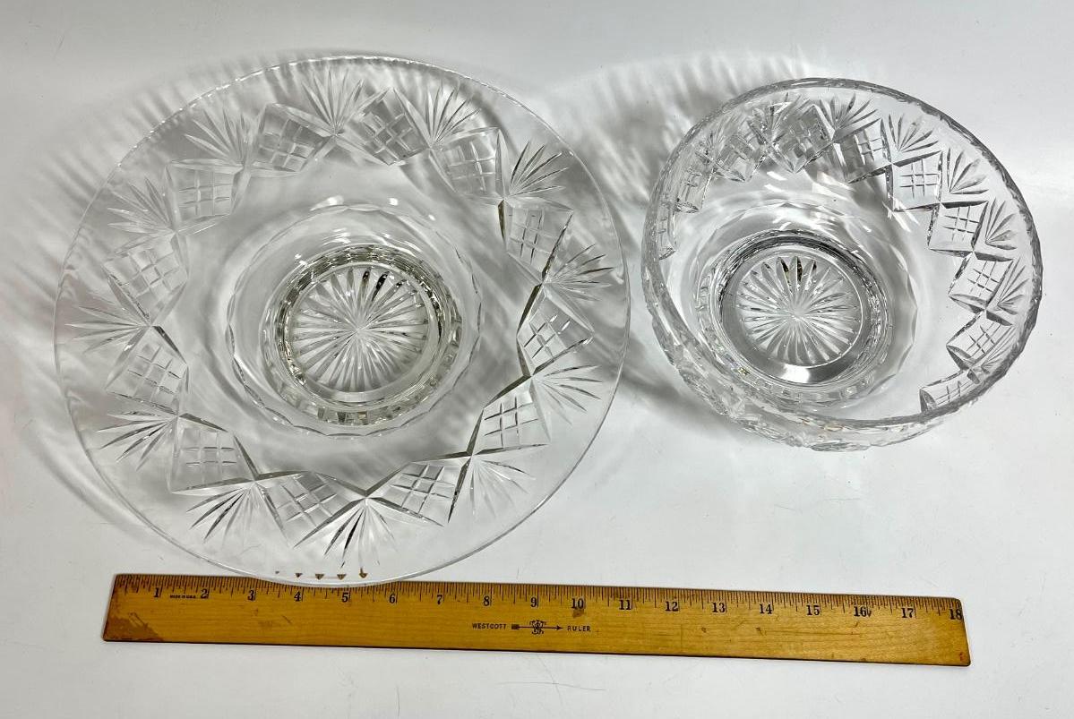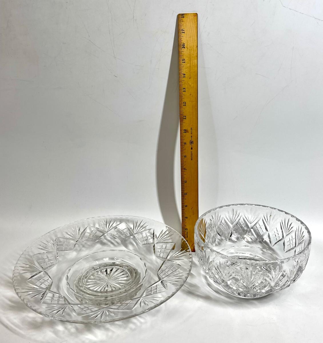 Two clear glass crystal bowl and platter plate. There is a name printed in white along bottom but we can’t make out what it says.