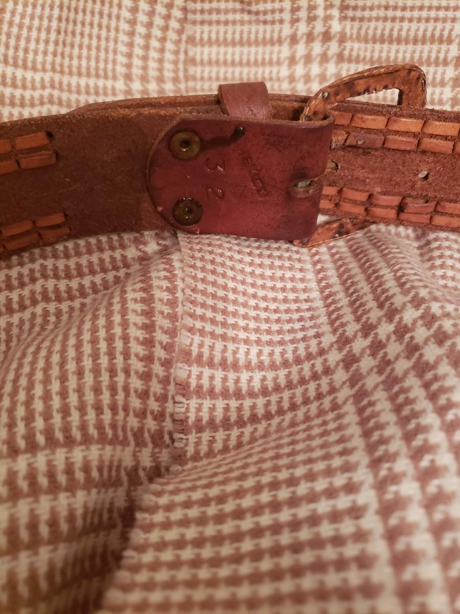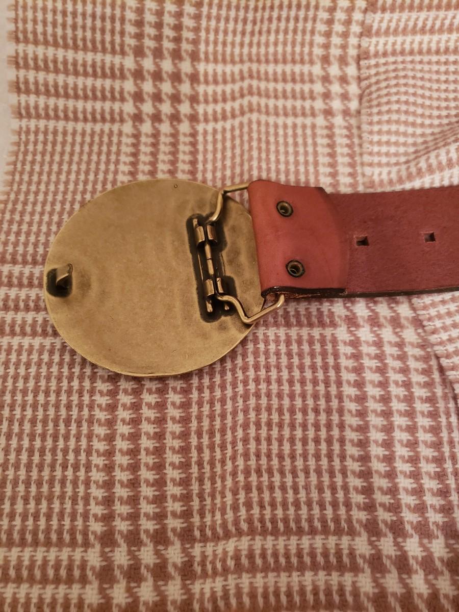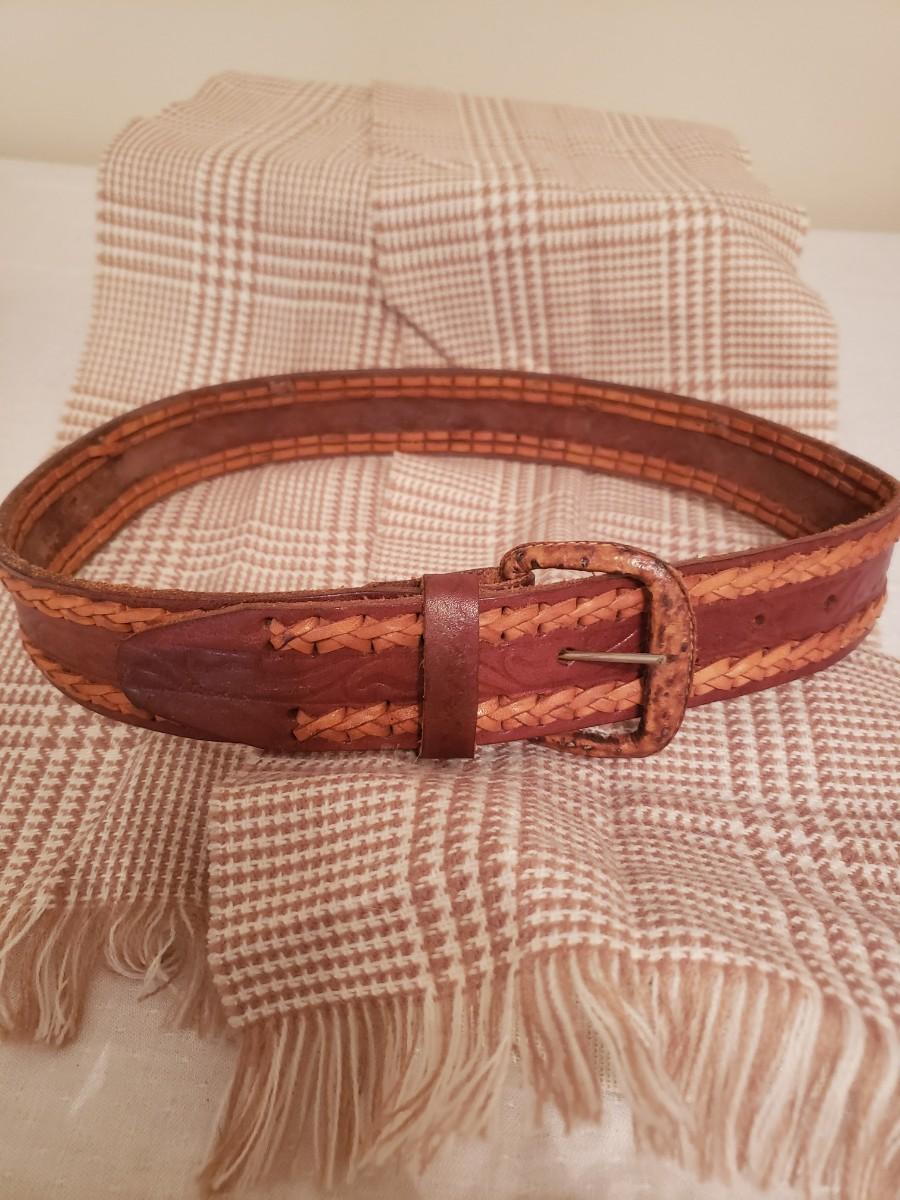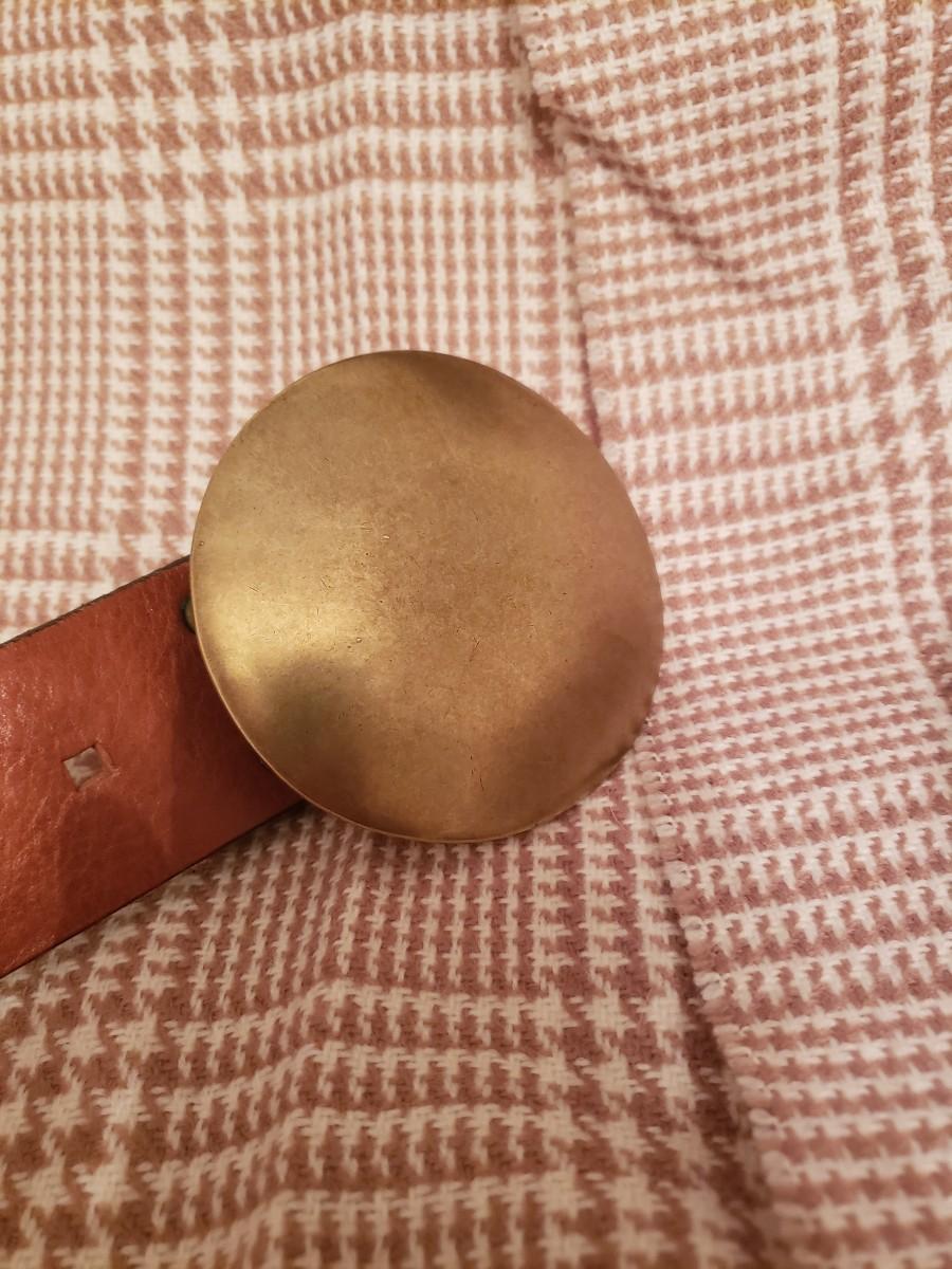 Lot of 2 vintage women's brown leather belts. First one is a leather belt with 3-1/2 " round disc brass buckle. Total length of leather is 39". The second one has a braided leather trim & is a size 32