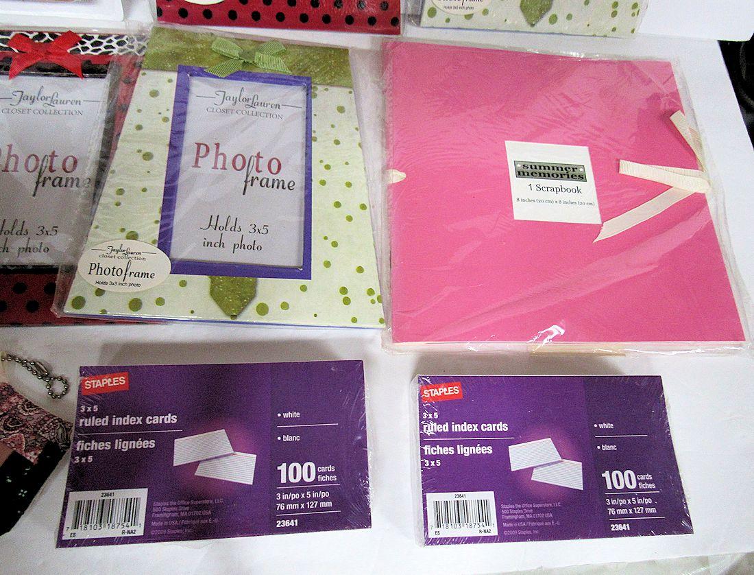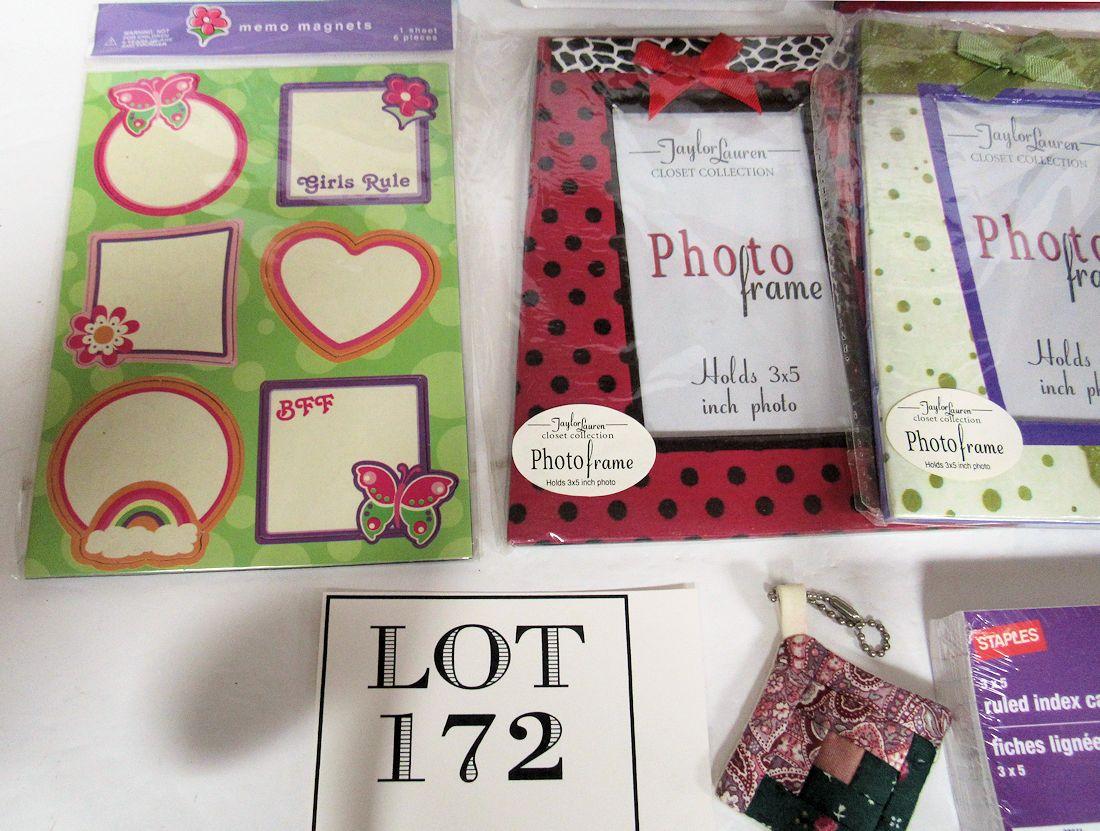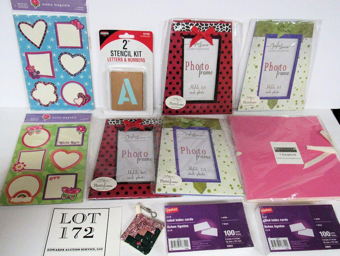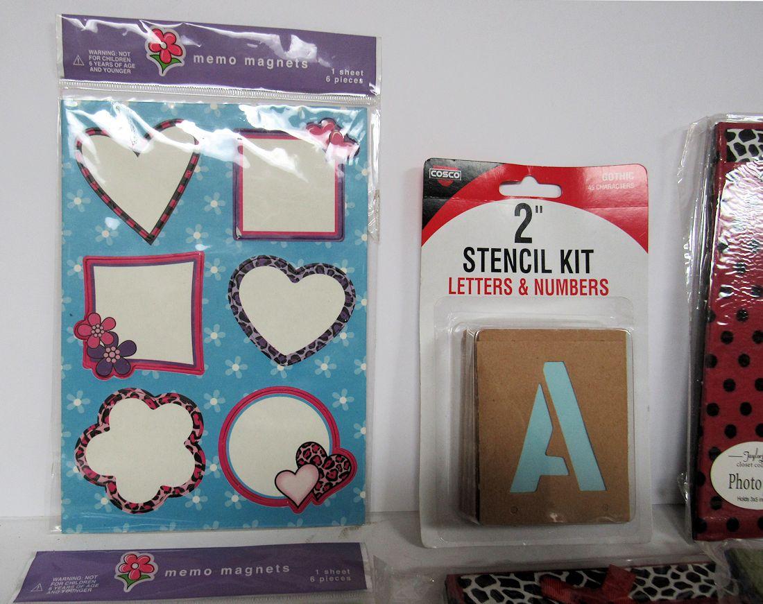 Magnets, photo frames, scrapbook, index cards, stencils, all in original package. Shipping is available at shipping cost plus $5.00 handling fee on up to 6 lots, $10.00 handling fee on 7 or more lots or two boxes. $15.00 handling fee on 3 boxes. Helps cover shipping materials and labor cost.