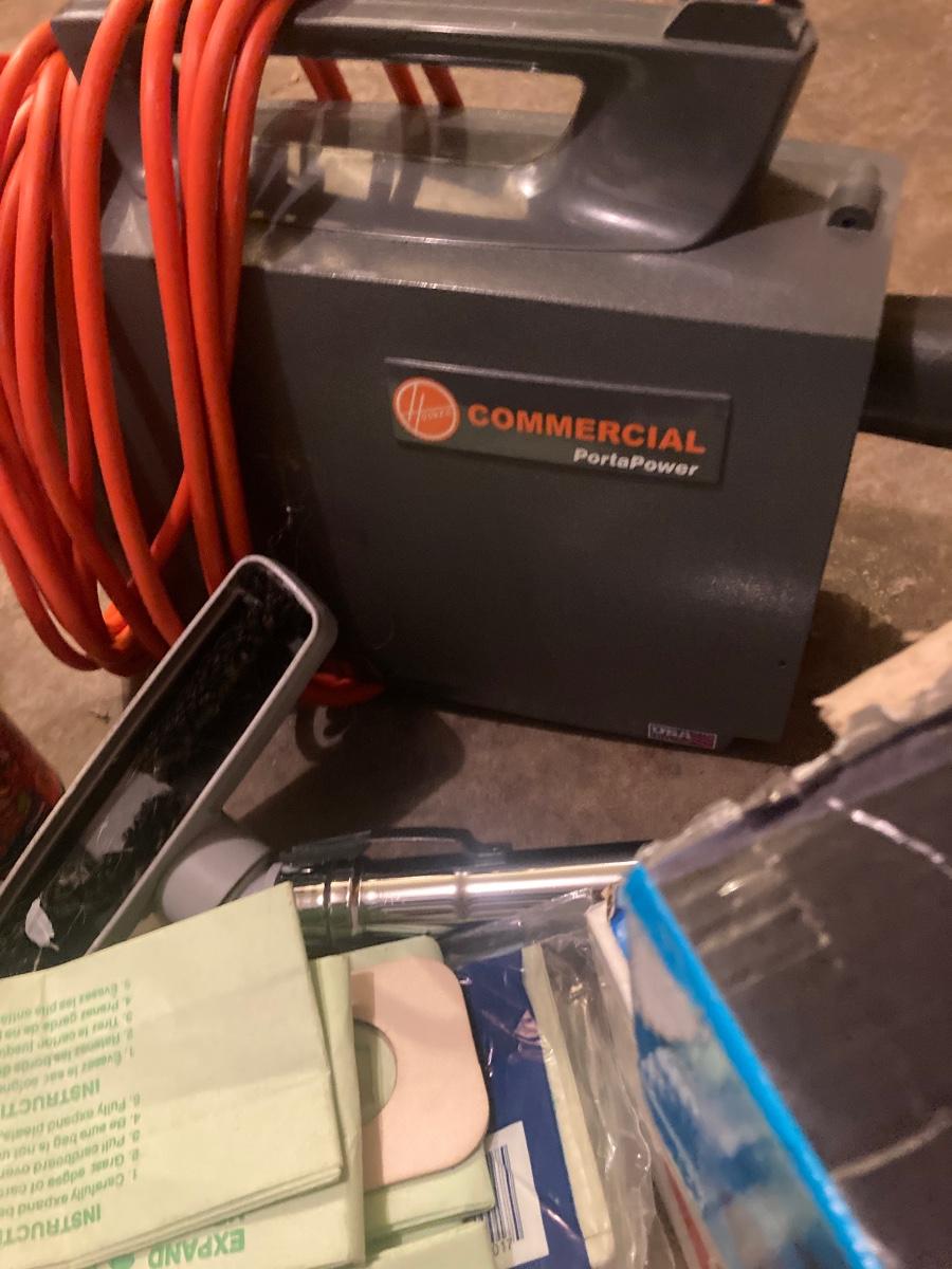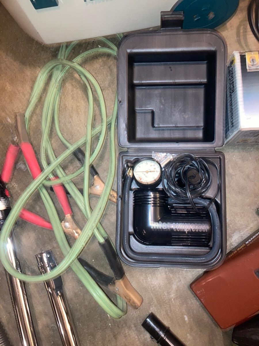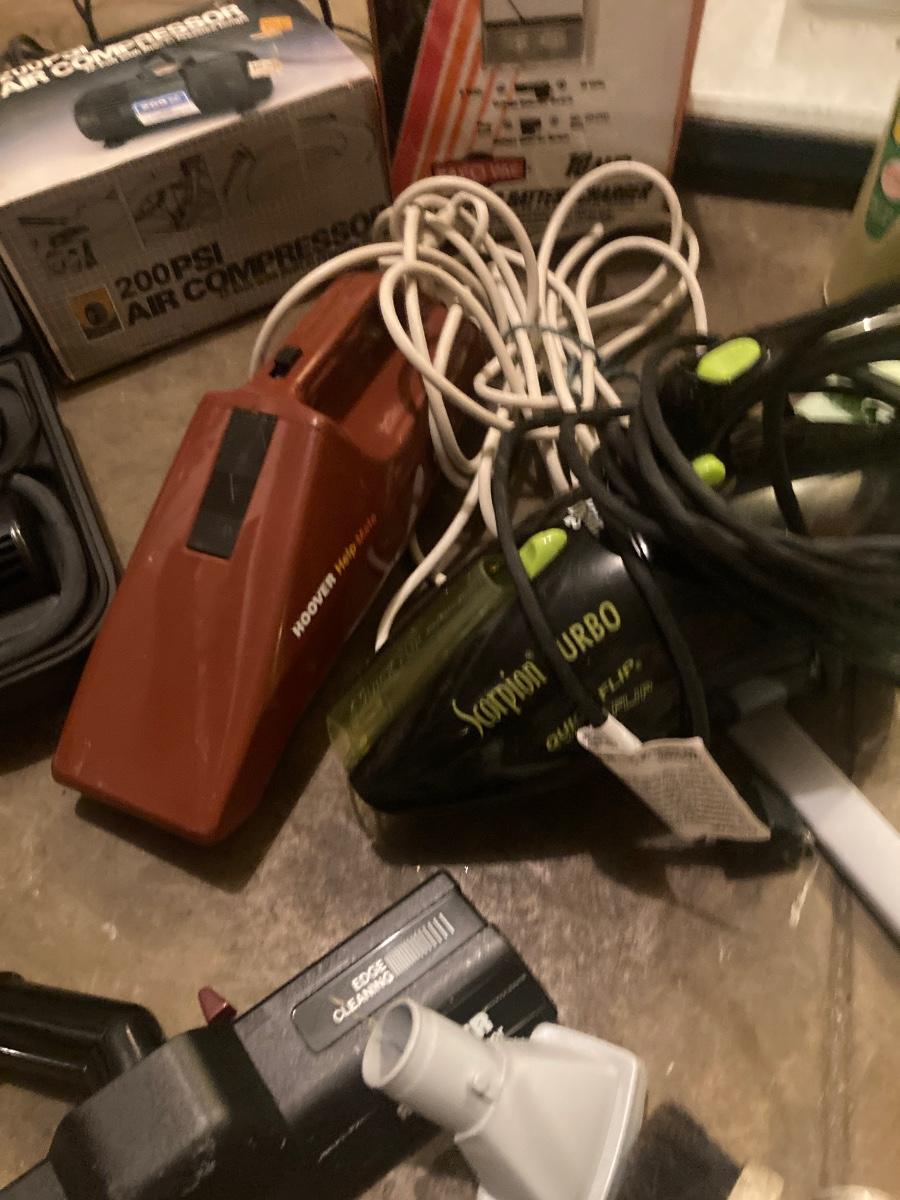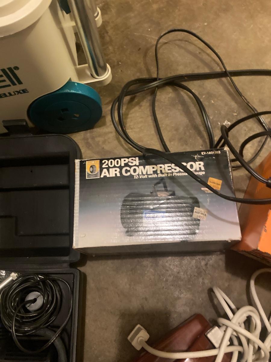 for tires, 200 psi compressor, carpet dress powder, upright Hoover with bags, commercial Hoover canister with bags, Boswell featherweight vacuum various attachments for mostly Hoover machines 2 hose attachments. Vintage Hankscraft vaporizer with box