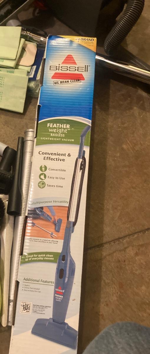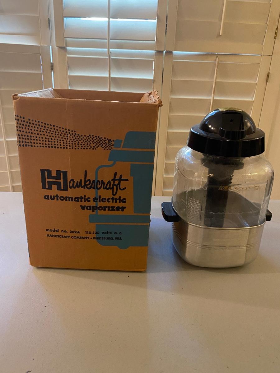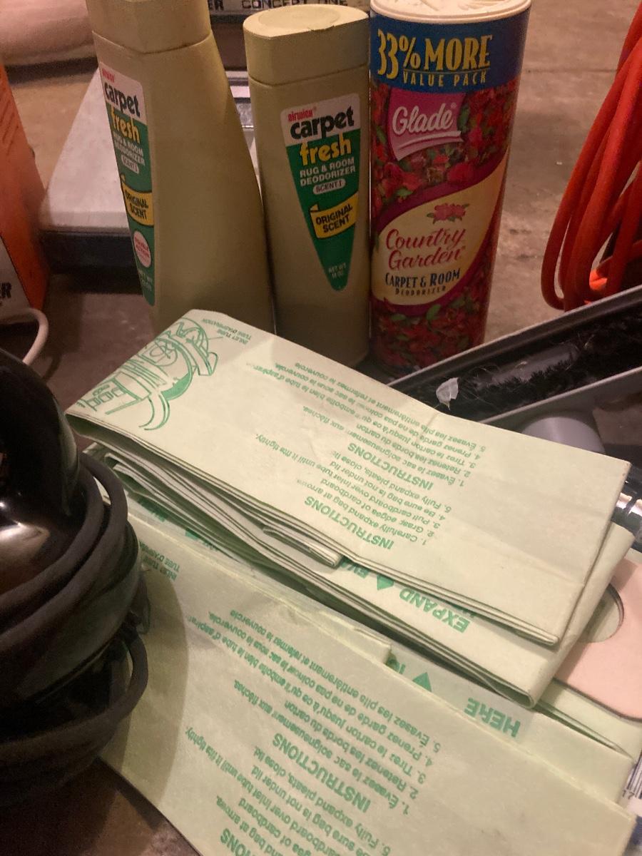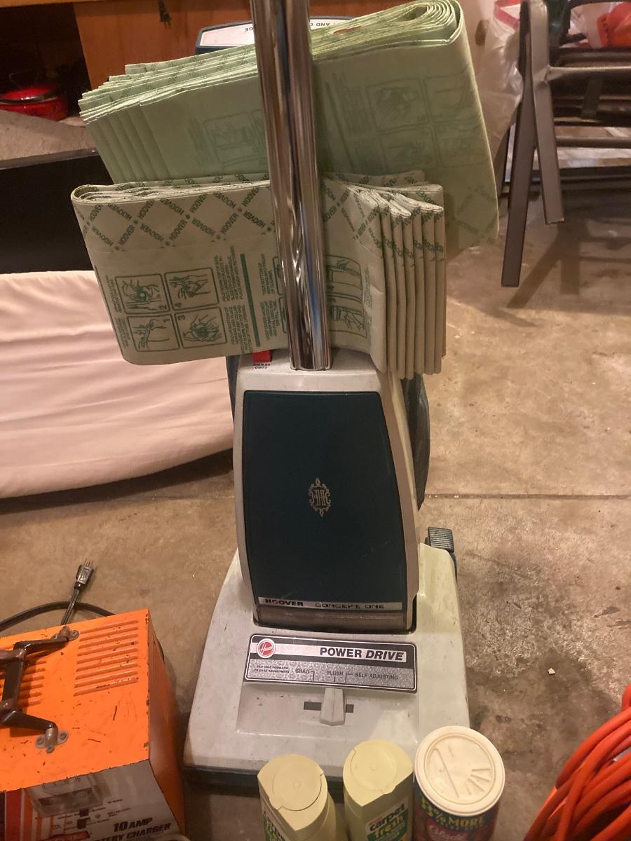 for tires, 200 psi compressor, carpet dress powder, upright Hoover with bags, commercial Hoover canister with bags, Boswell featherweight vacuum various attachments for mostly Hoover machines 2 hose attachments. Vintage Hankscraft vaporizer with box