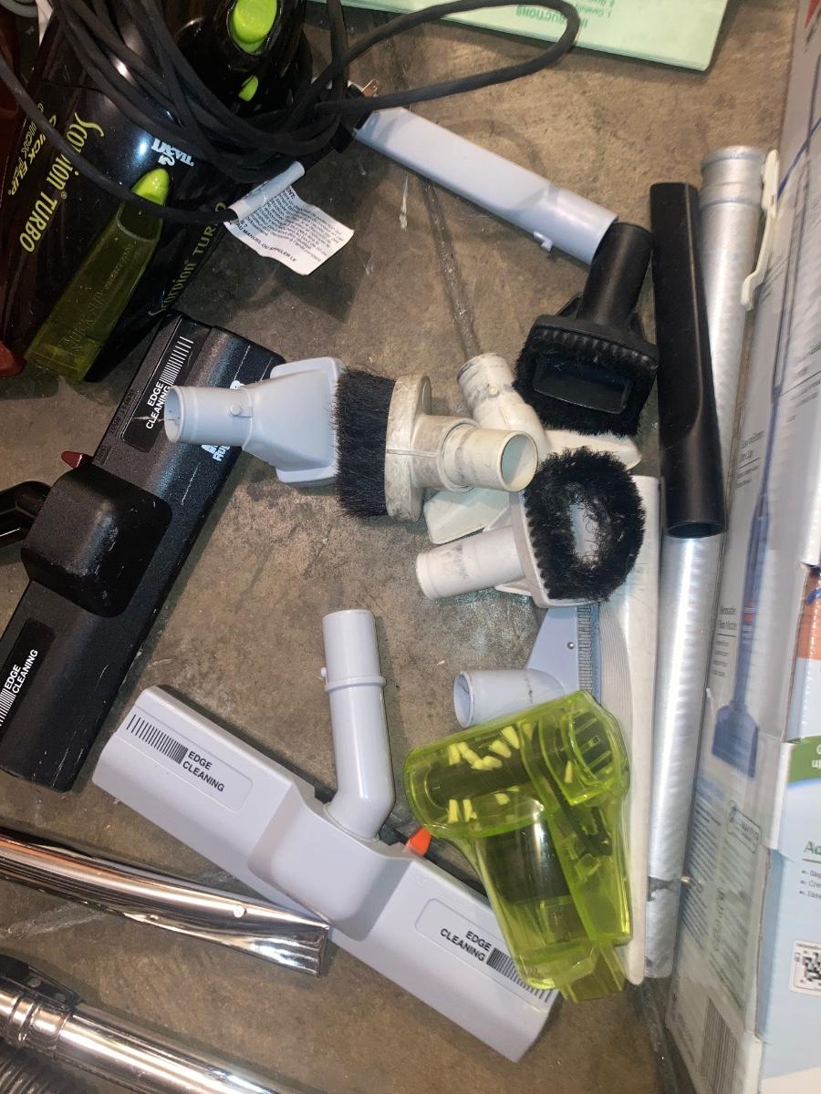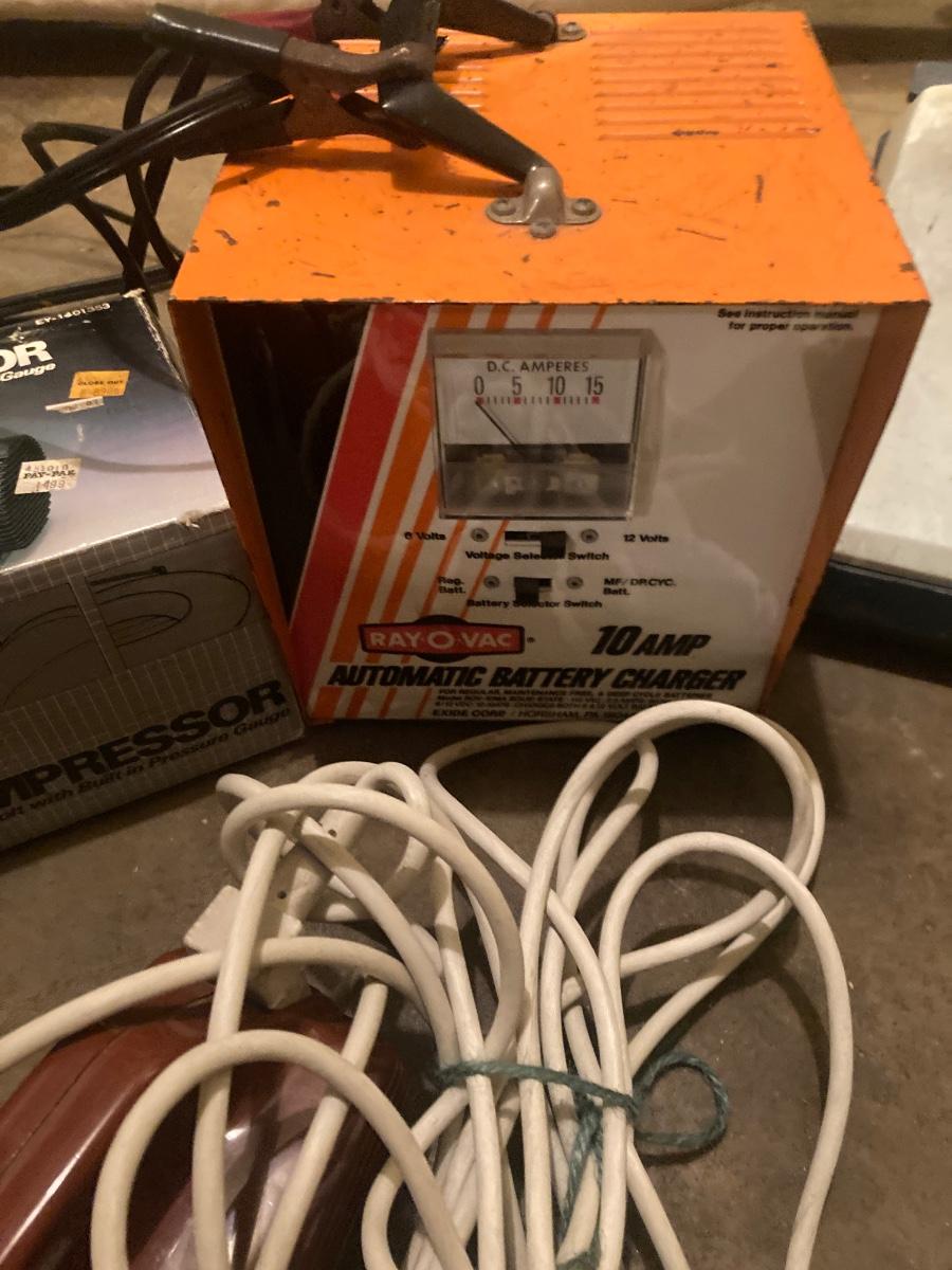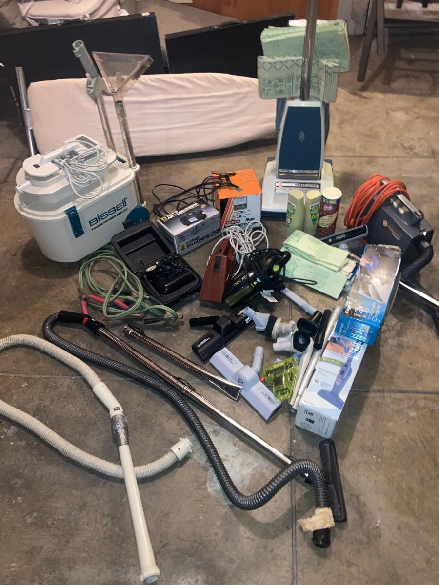 A large lot of various types of vacuum cleaners. Full-size ironing board a carpet steamer (coupler on the trigger is broken) battery charger, jumper cables, compressor