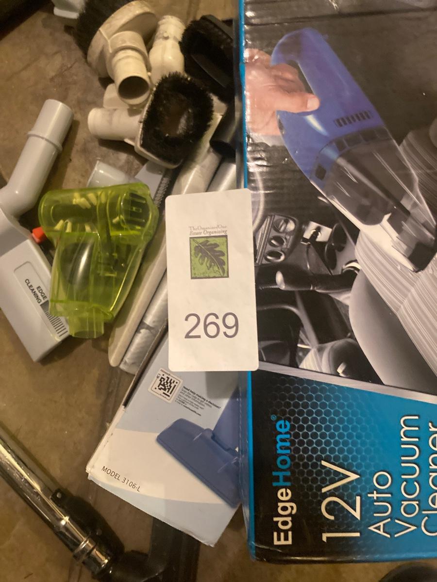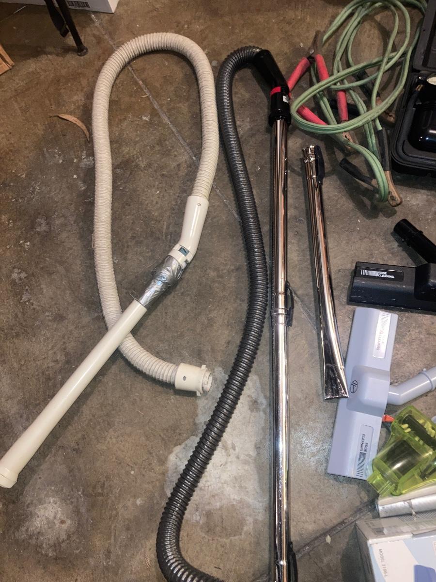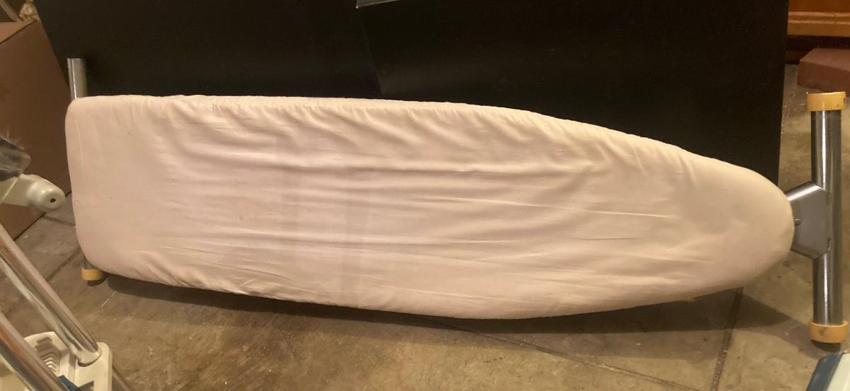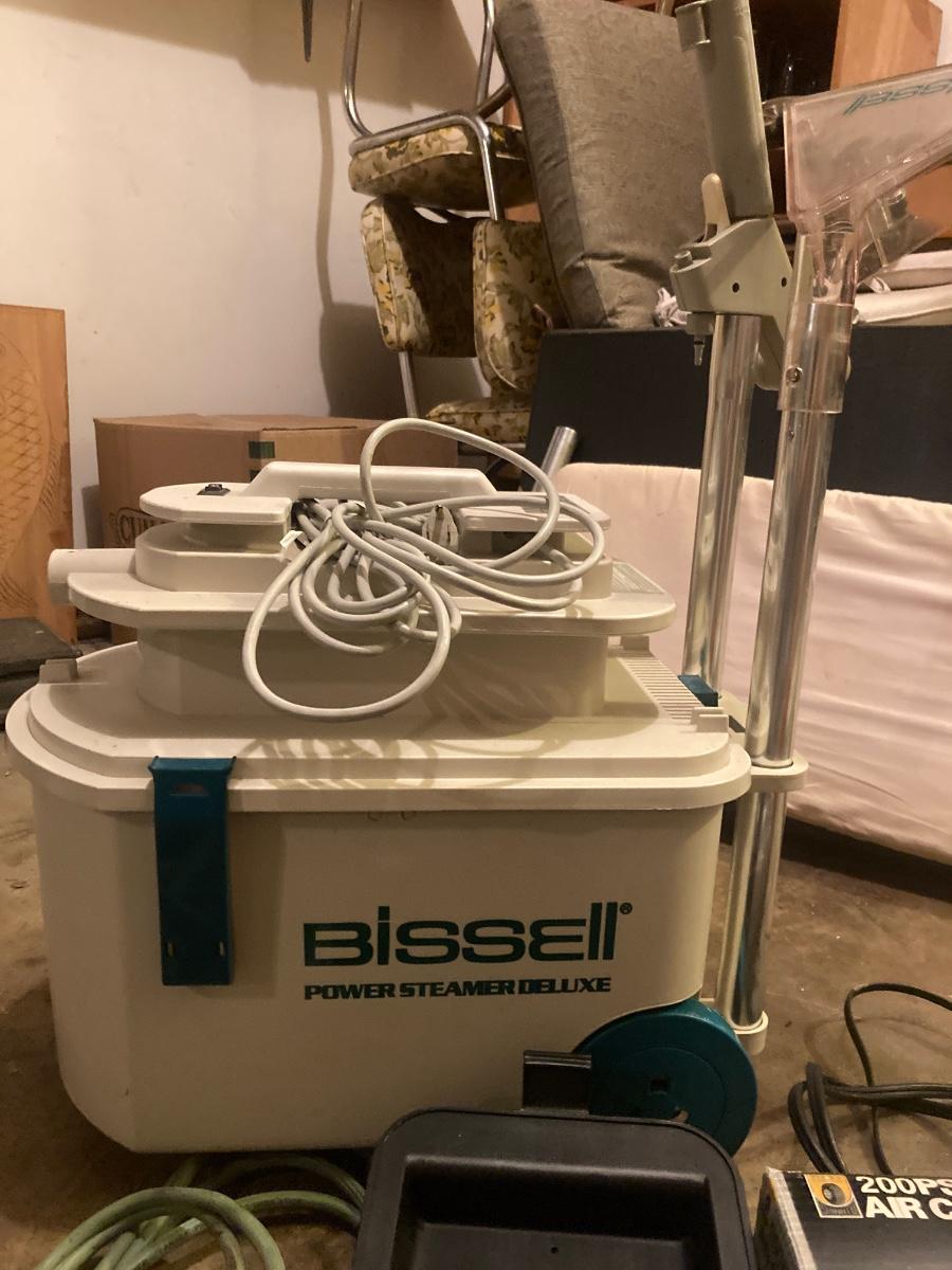 A large lot of various types of vacuum cleaners. Full-size ironing board a carpet steamer (coupler on the trigger is broken) battery charger, jumper cables, compressor