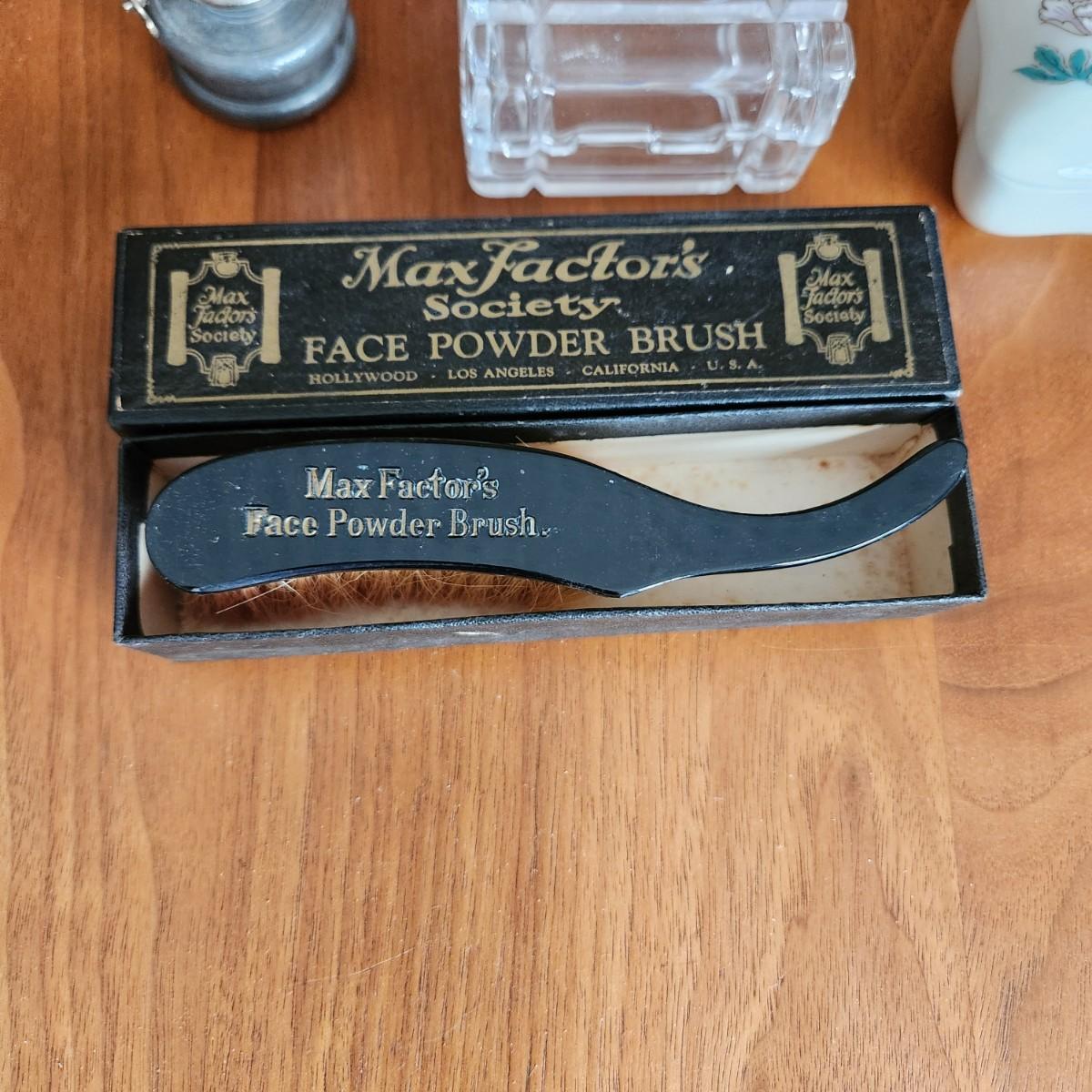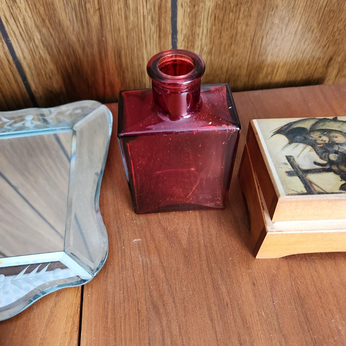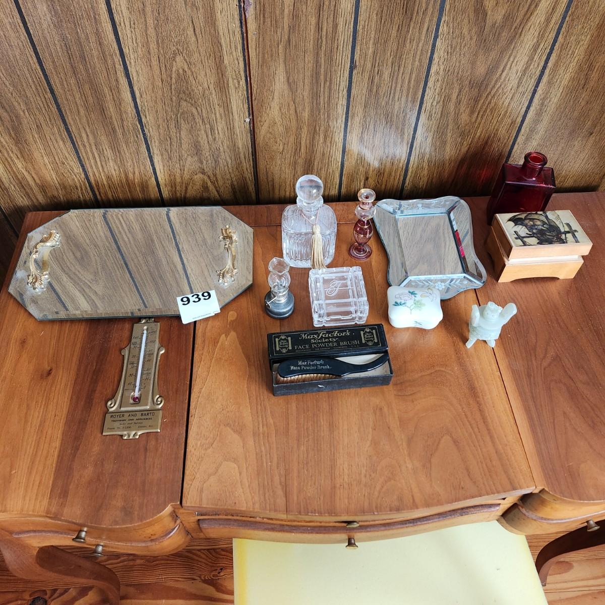 Mirror Trays, Easton Business Thermometer, MaxFactor Face Powder brush, Music box, mini oil lamp and more.