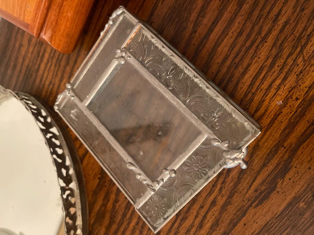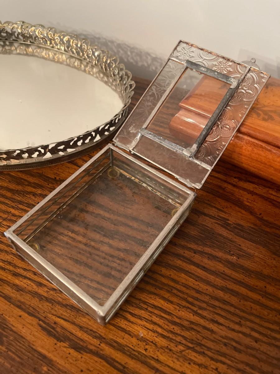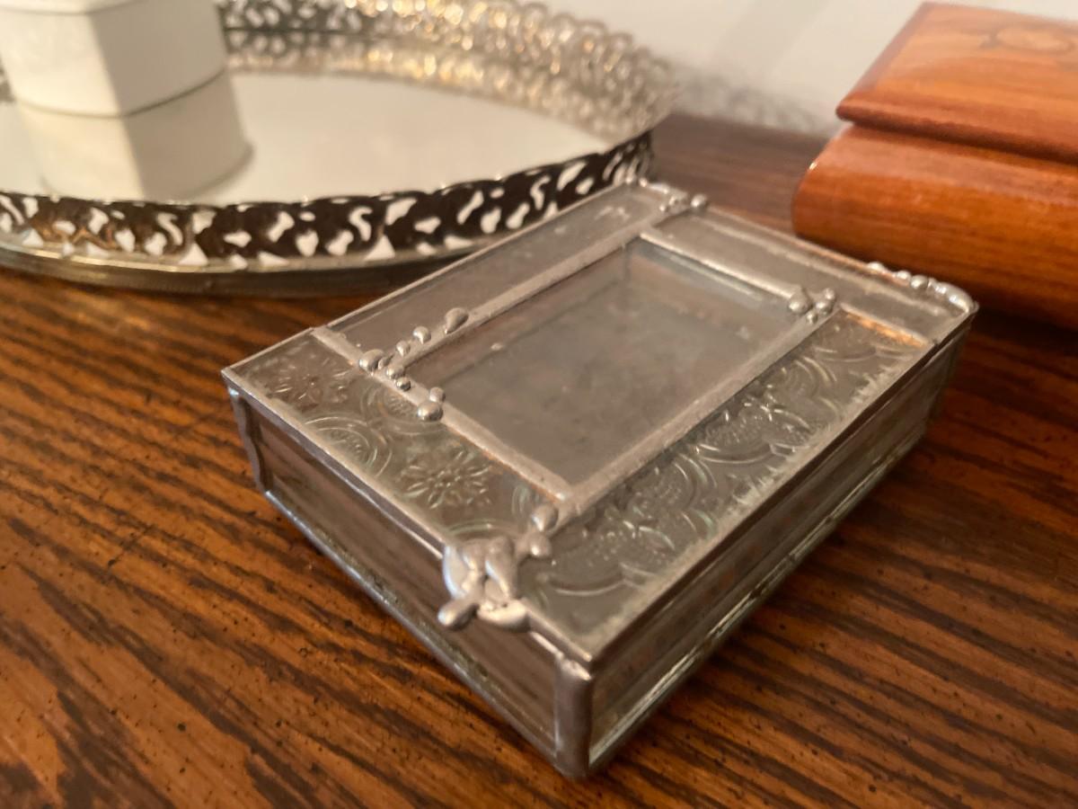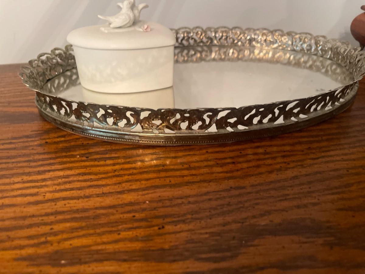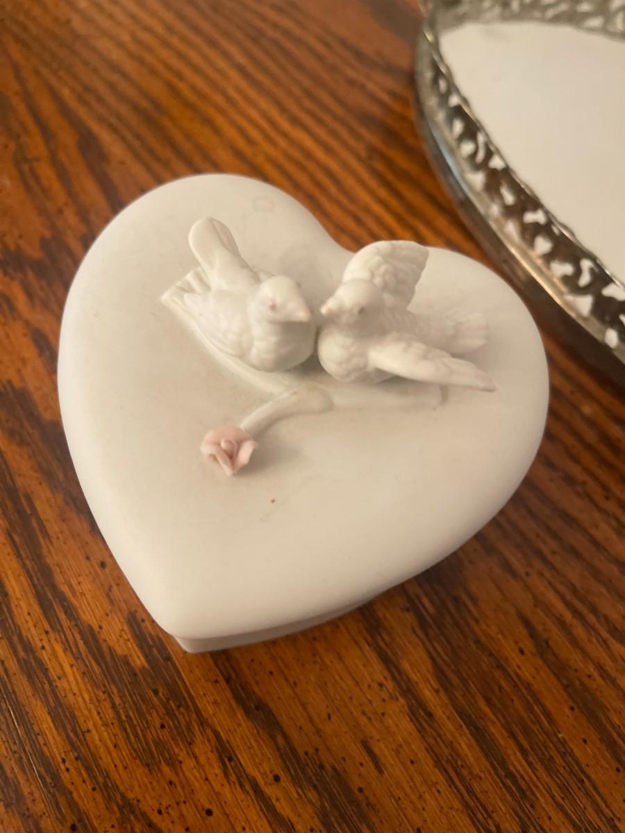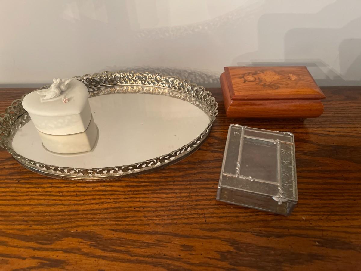 Includes: Vintage oval mirrored vanity tray with metal rim, inlaid marquetry musical jewelry box, leaded glass box and heart shaped porcelain box.