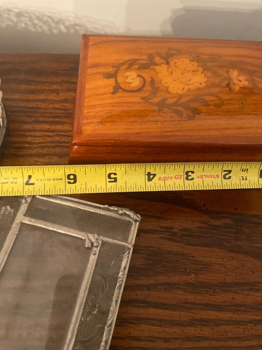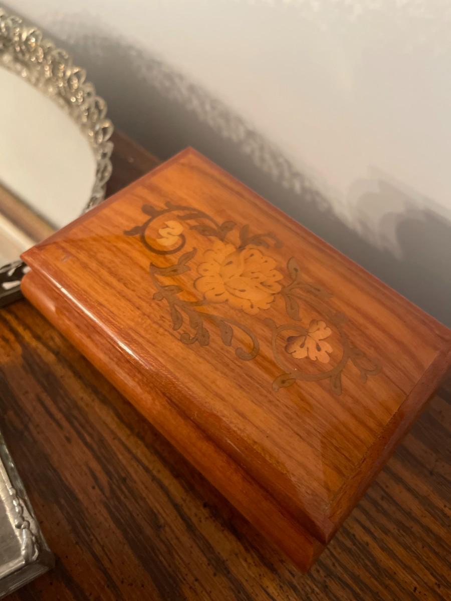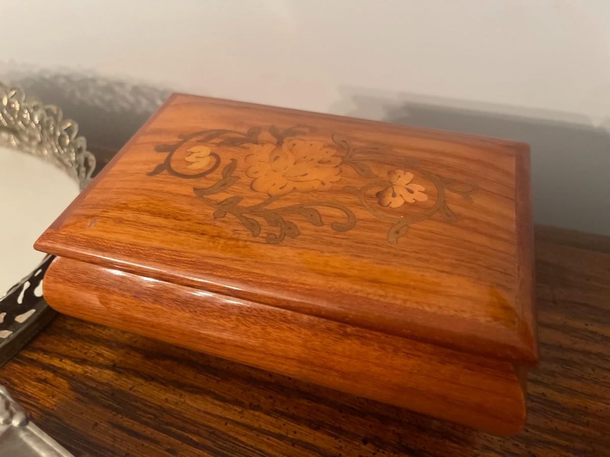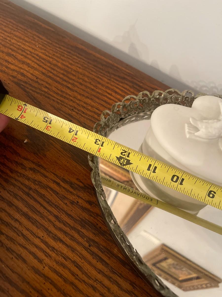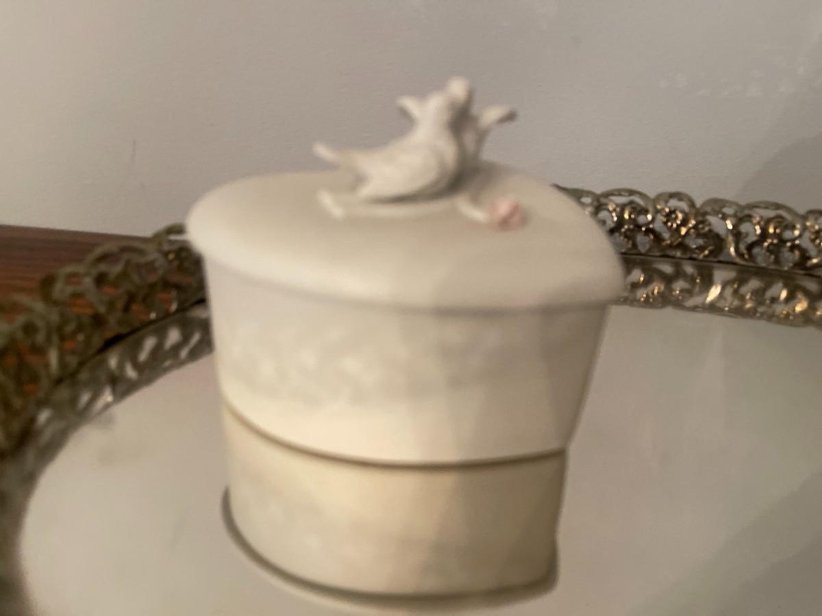 Includes: Vintage oval mirrored vanity tray with metal rim, inlaid marquetry musical jewelry box, leaded glass box and heart shaped porcelain box.