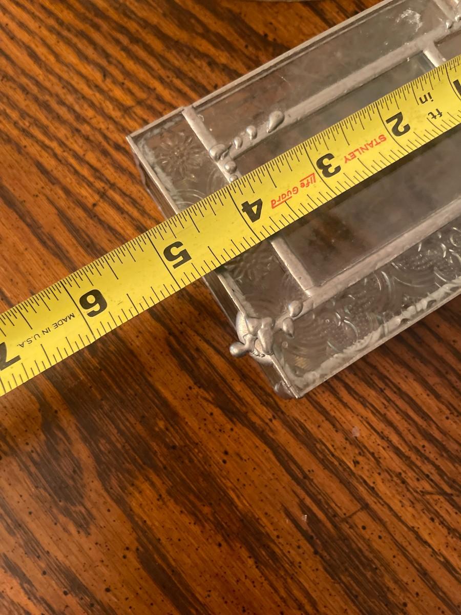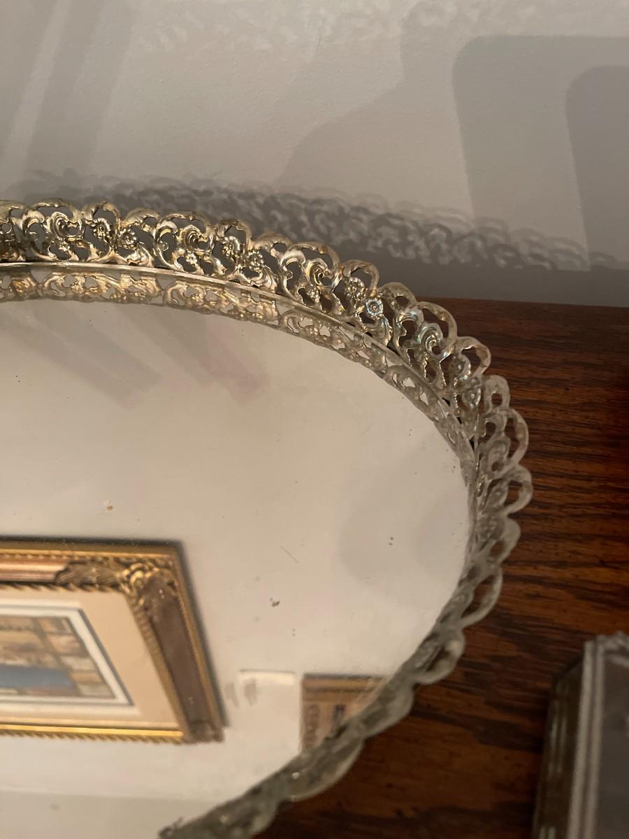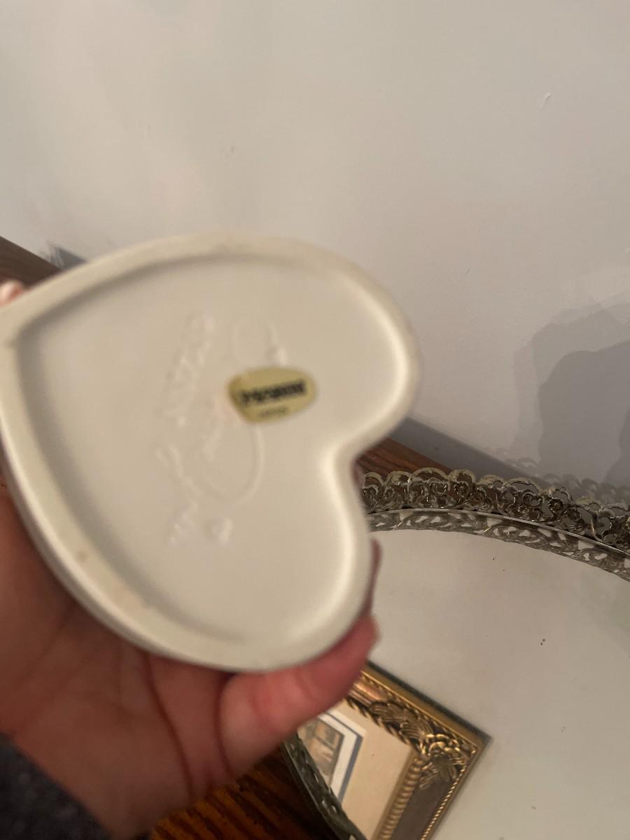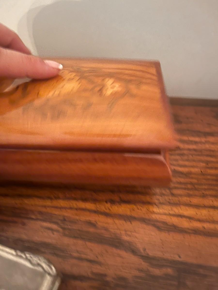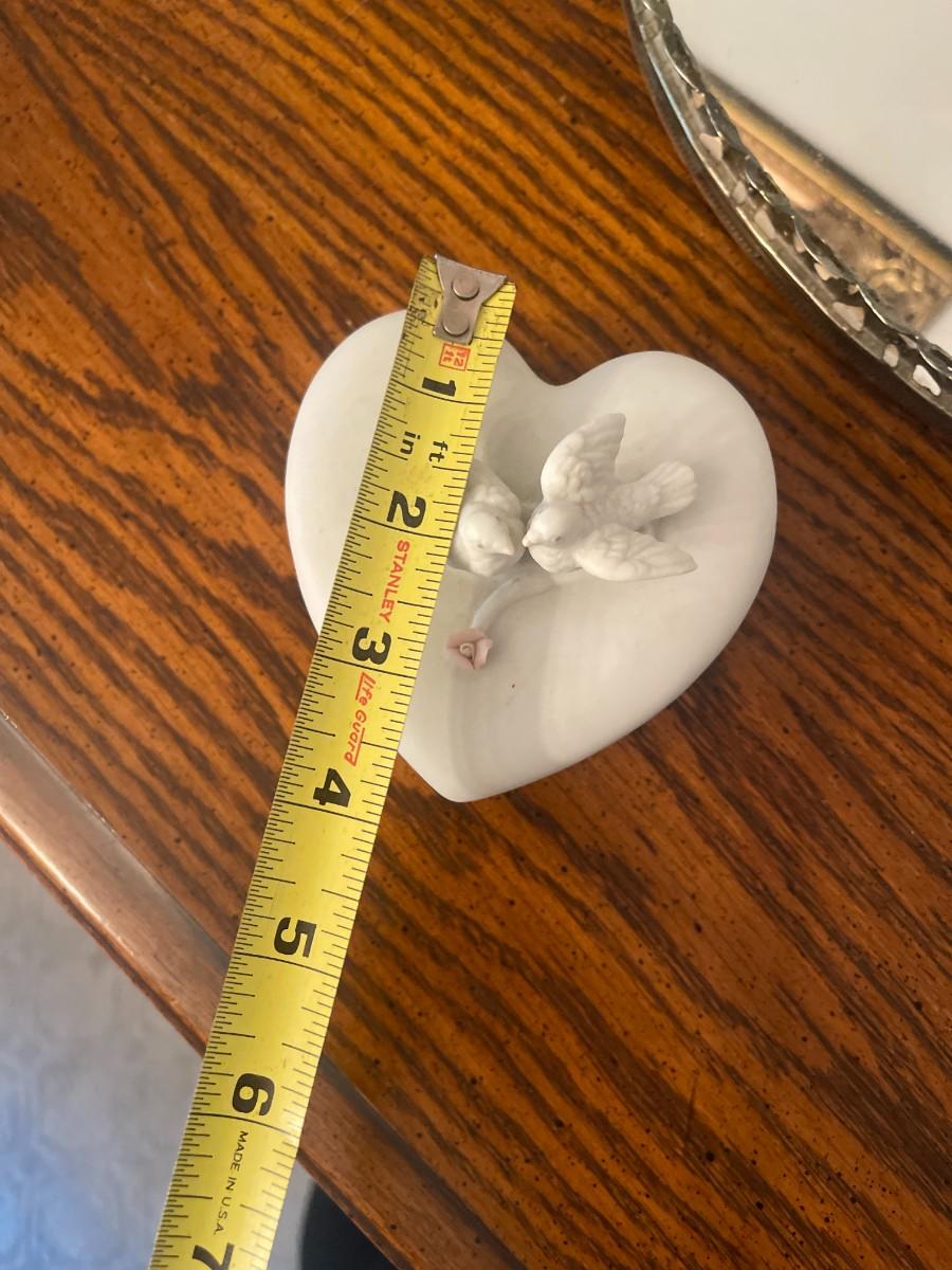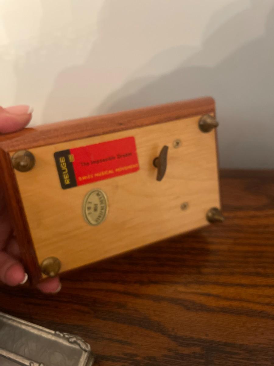 Includes: Vintage oval mirrored vanity tray with metal rim, inlaid marquetry musical jewelry box, leaded glass box and heart shaped porcelain box.