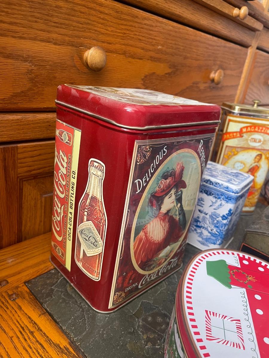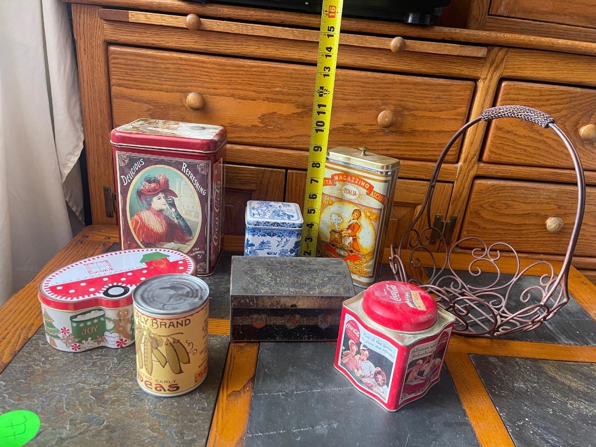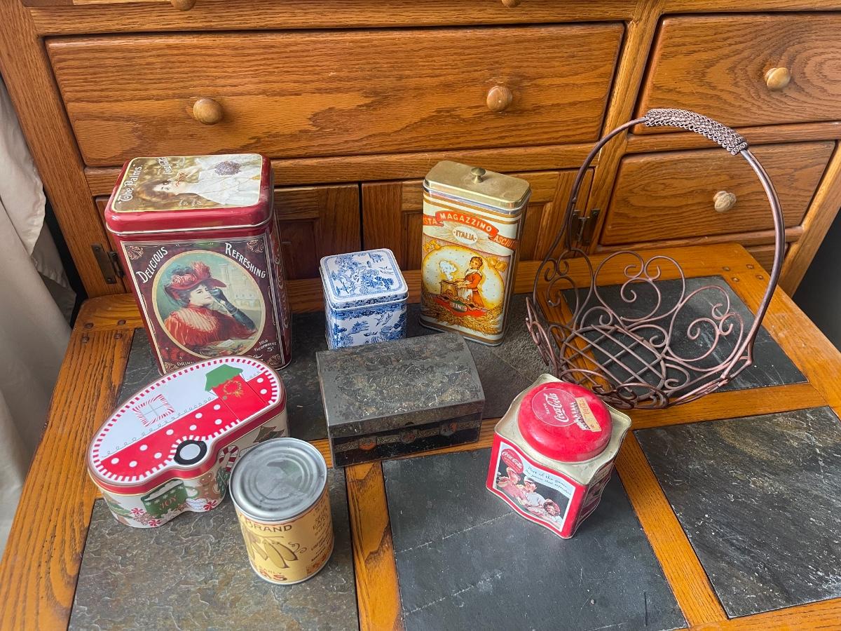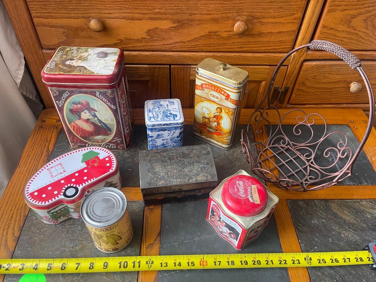 Lot of Various Antique Metal Vessels (Lot of 8). One basket and several tin boxes. 2 Coca Cola boxes and one italian pasta box.