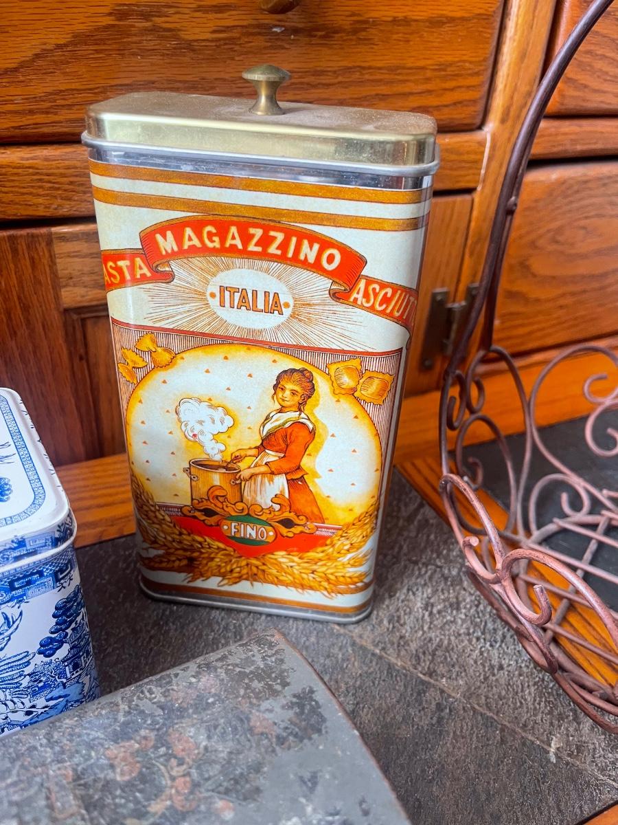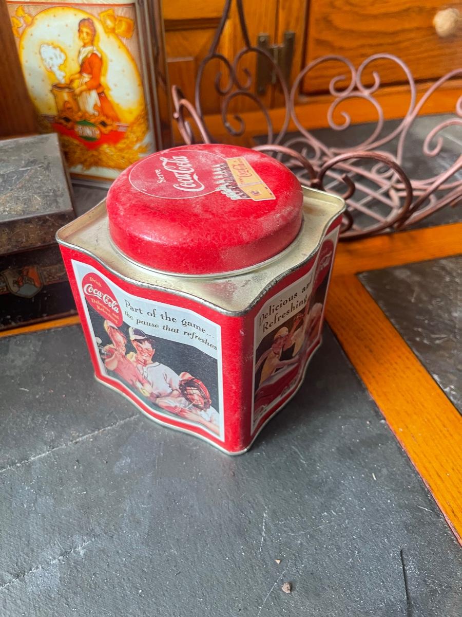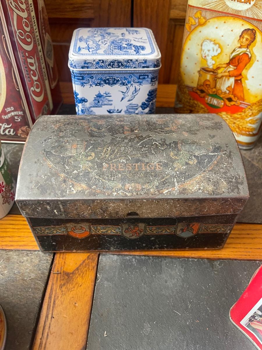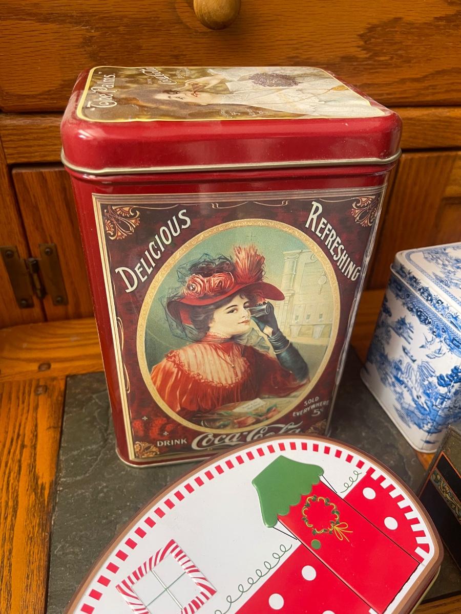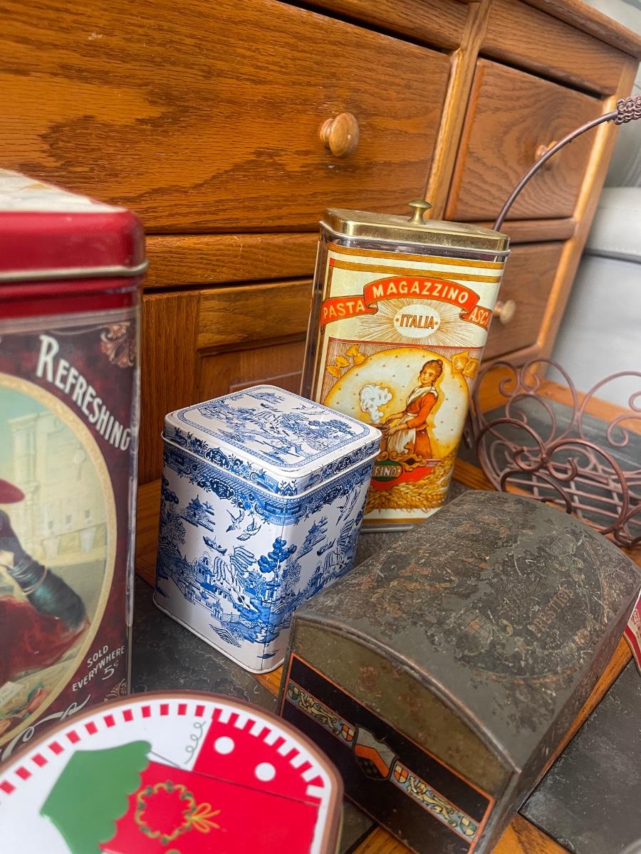 Lot of Various Antique Metal Vessels (Lot of 8). One basket and several tin boxes. 2 Coca Cola boxes and one italian pasta box.