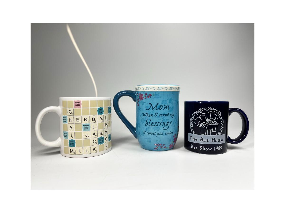 Lot of Various Ceramic Coffee Tea Mugs Scrabble, Mother's Day, & More, there is no significant chips or cracks to the any of the mugs and is in good useable condition. Check pictures for more details and for sizing.
