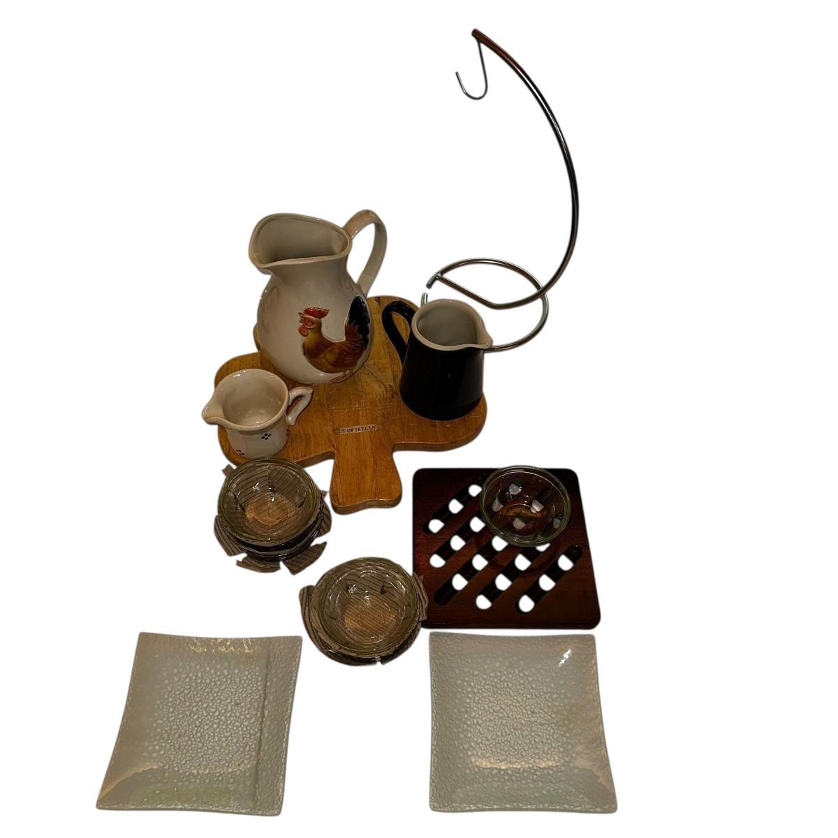 Lot of Various Kitchen/Household Items- banana hanger, cutting board, glass plates, trivet, glass bowls +