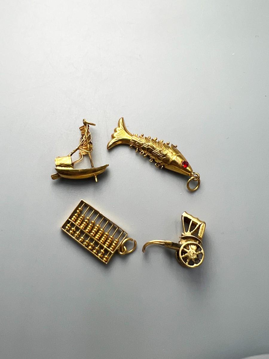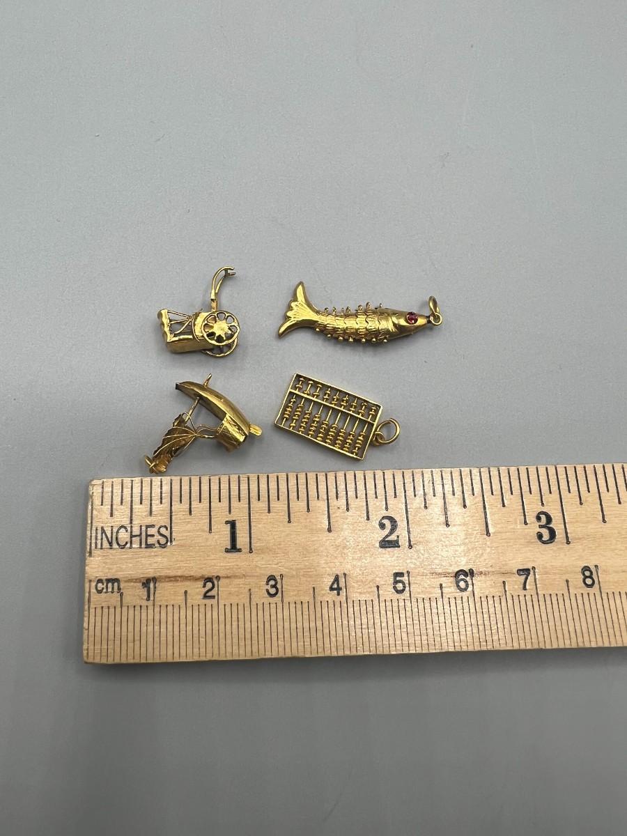 Lot of Vintage 14k Gold Small Trinket Charms Abacus, Rickshaw, Asian Styled Boat, & Articulate Fish with Gem Eyes
