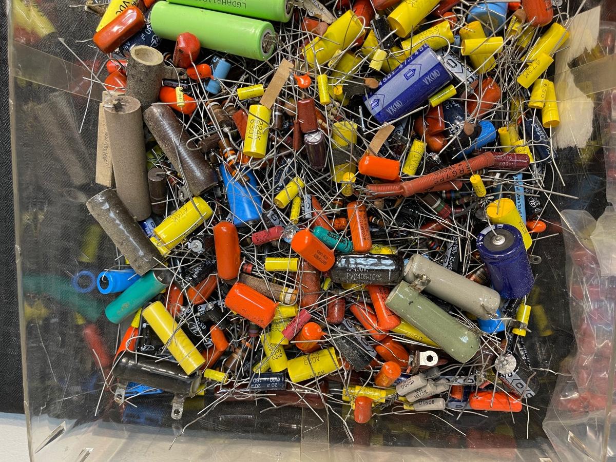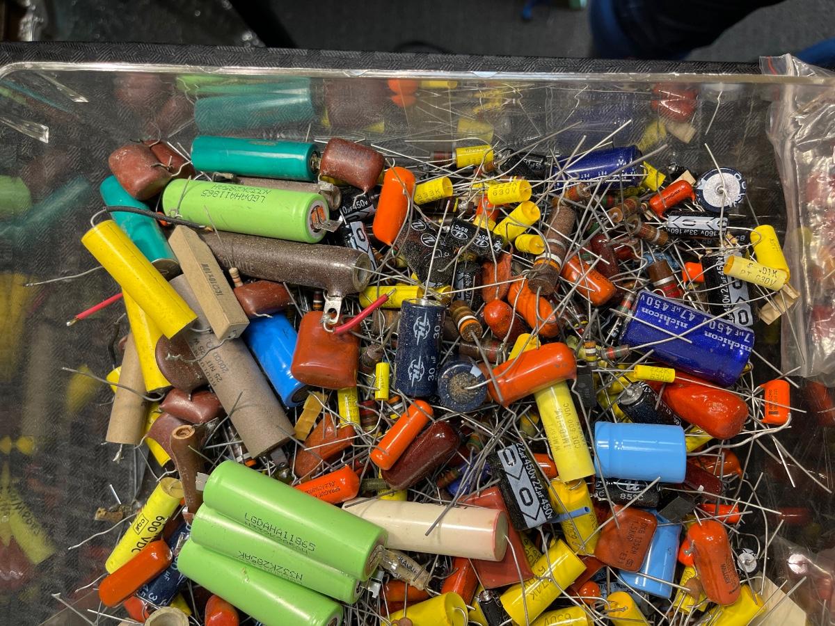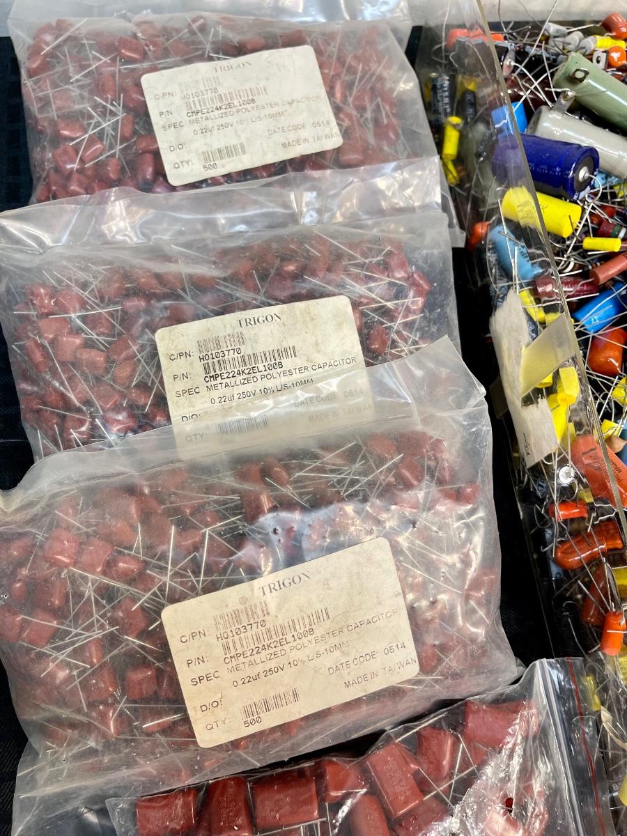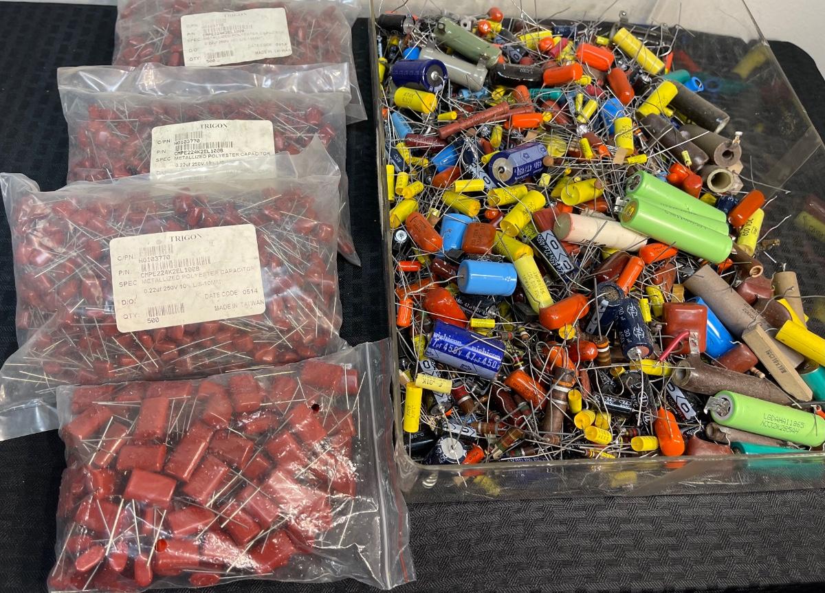 Mixed Variety Lot of Vintage Electronic Capacitors. Some are unused still in shipping bags, the mixed box of capacitors may be a mix of used and unused.