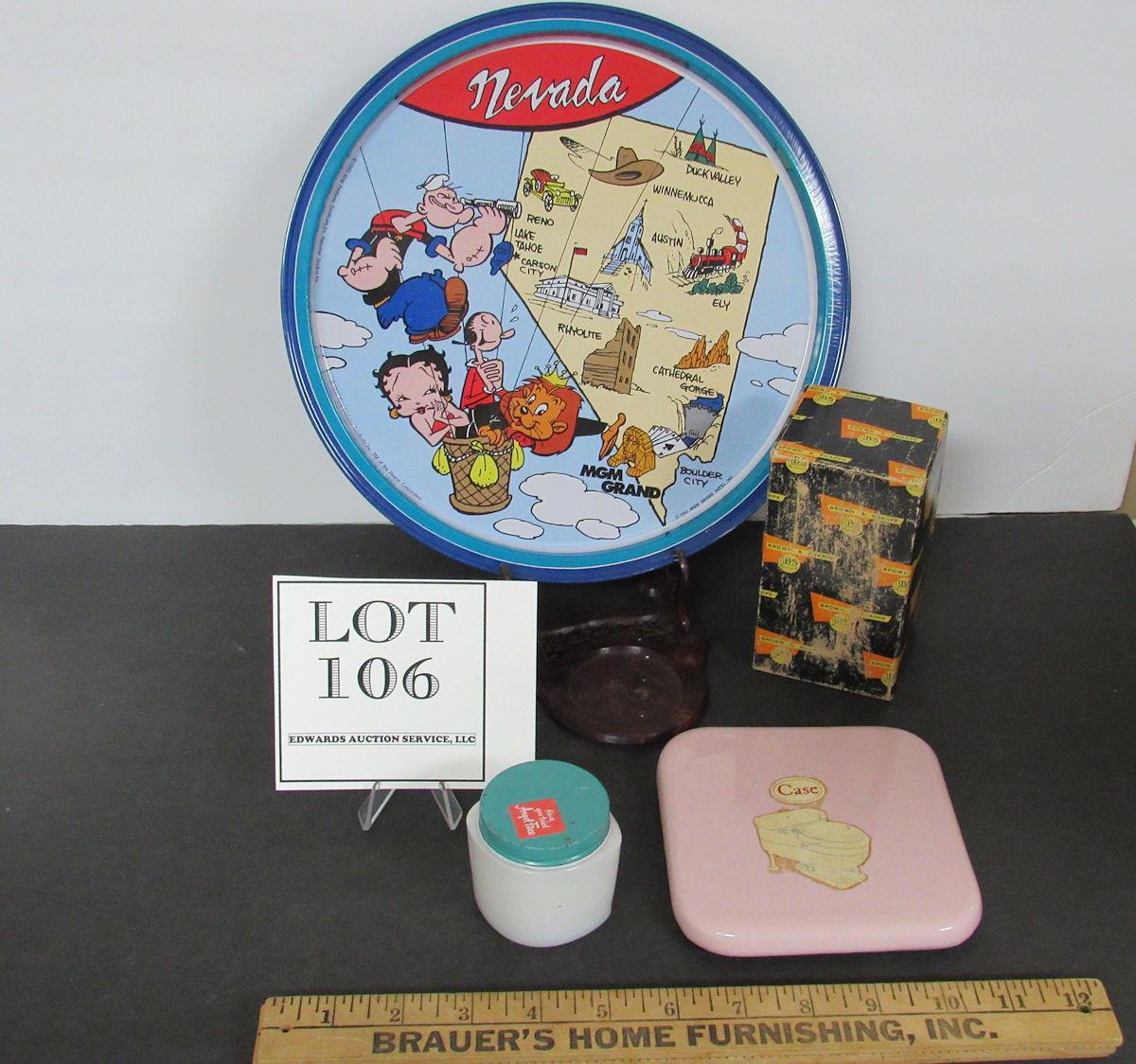 Lot of Vintage Advertising: Nevada Tray, Case Bathroom Tile, Ponds Jar, Brown and Sharp Empty Box