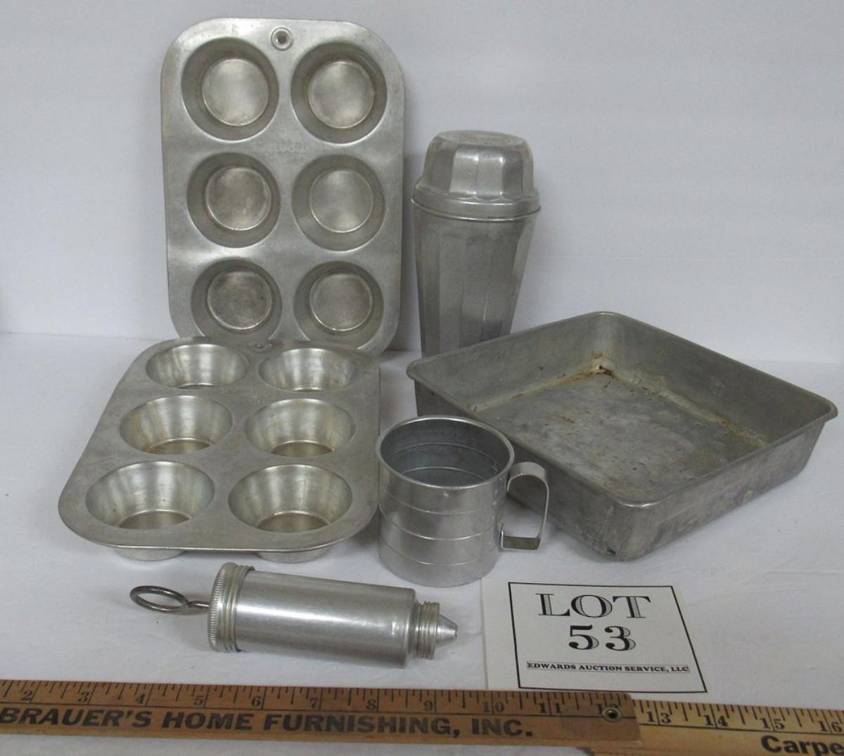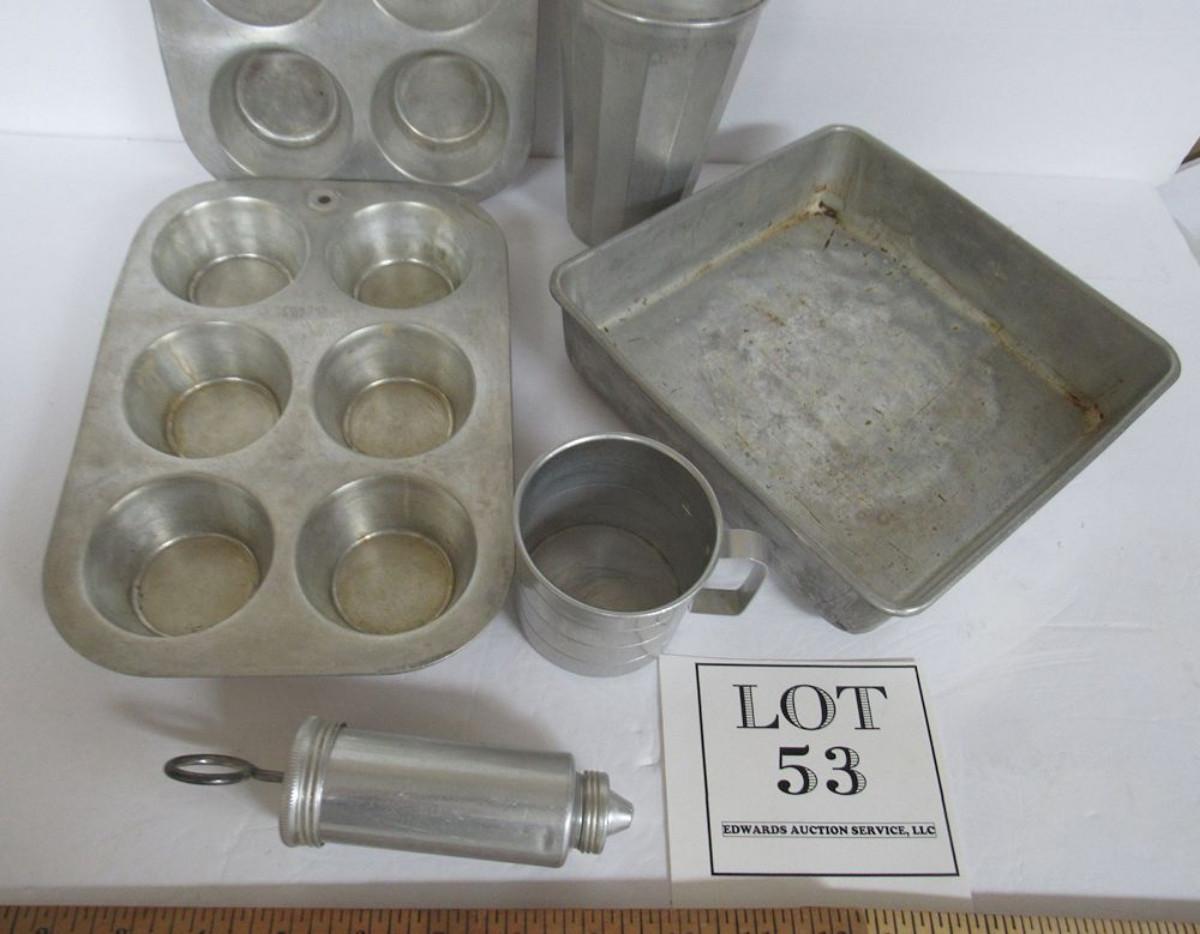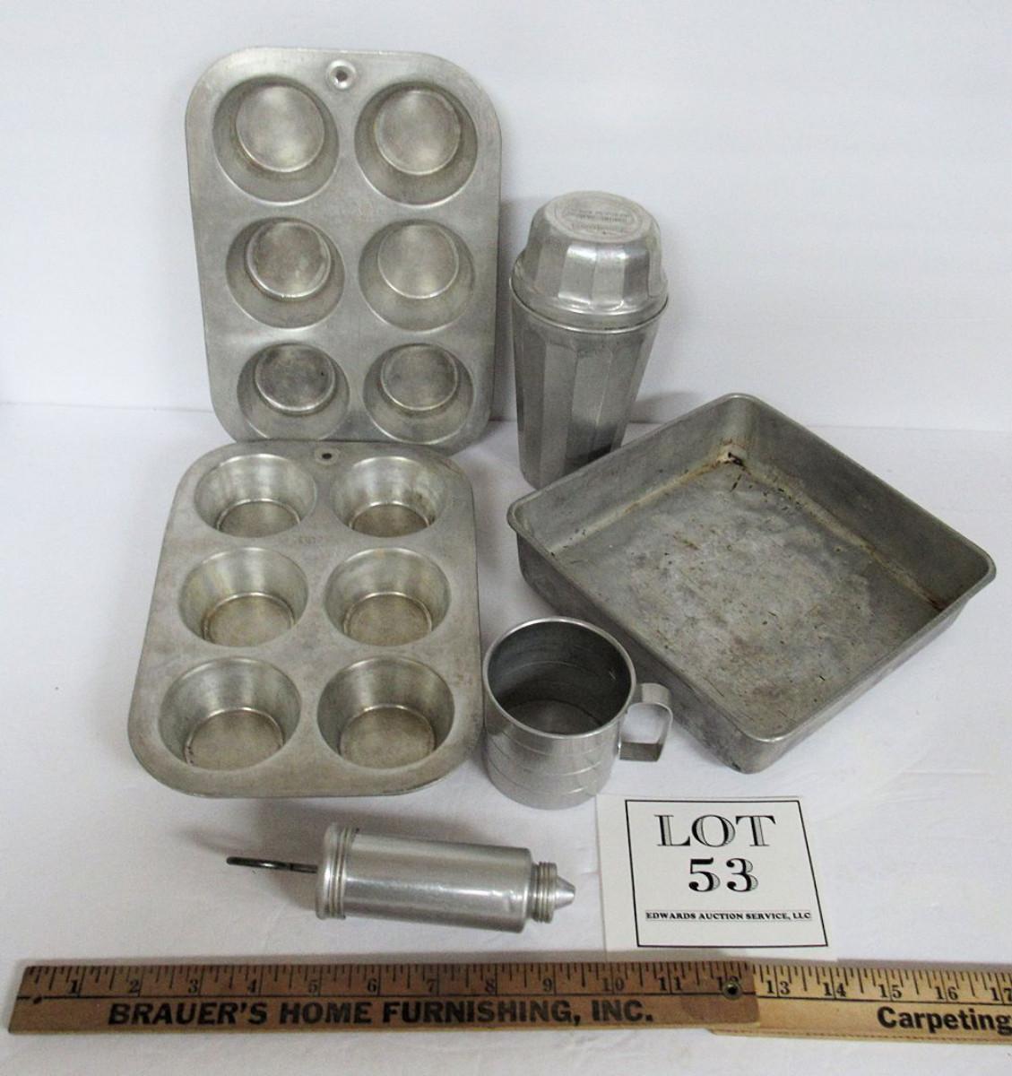 Lot of Vintage Aluminum Ware, Chilton Ware Muffin Tins, 1 Cup Measure, Thompson's Double Malted Milk Shaker, More