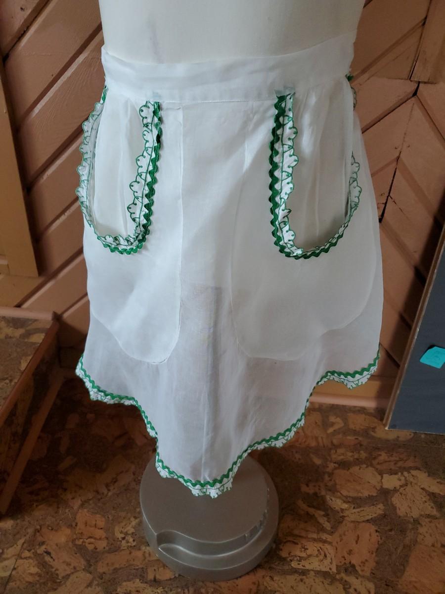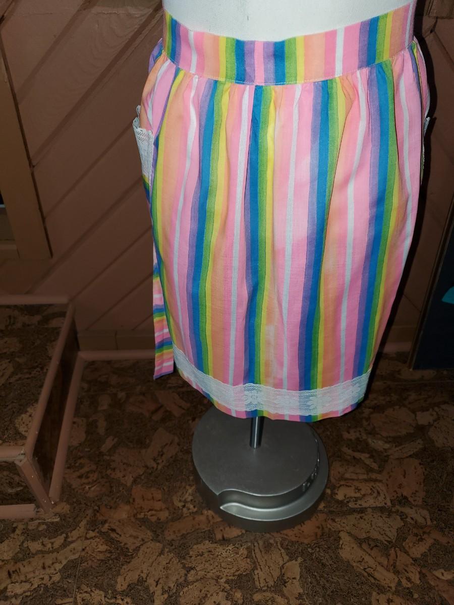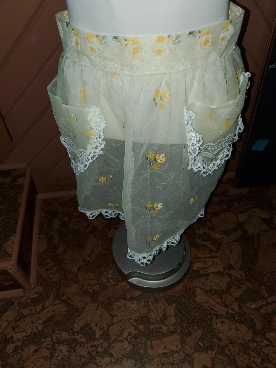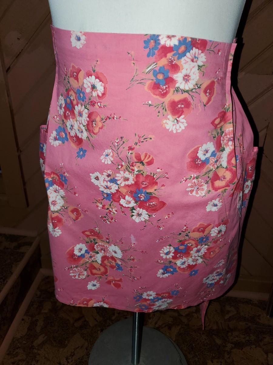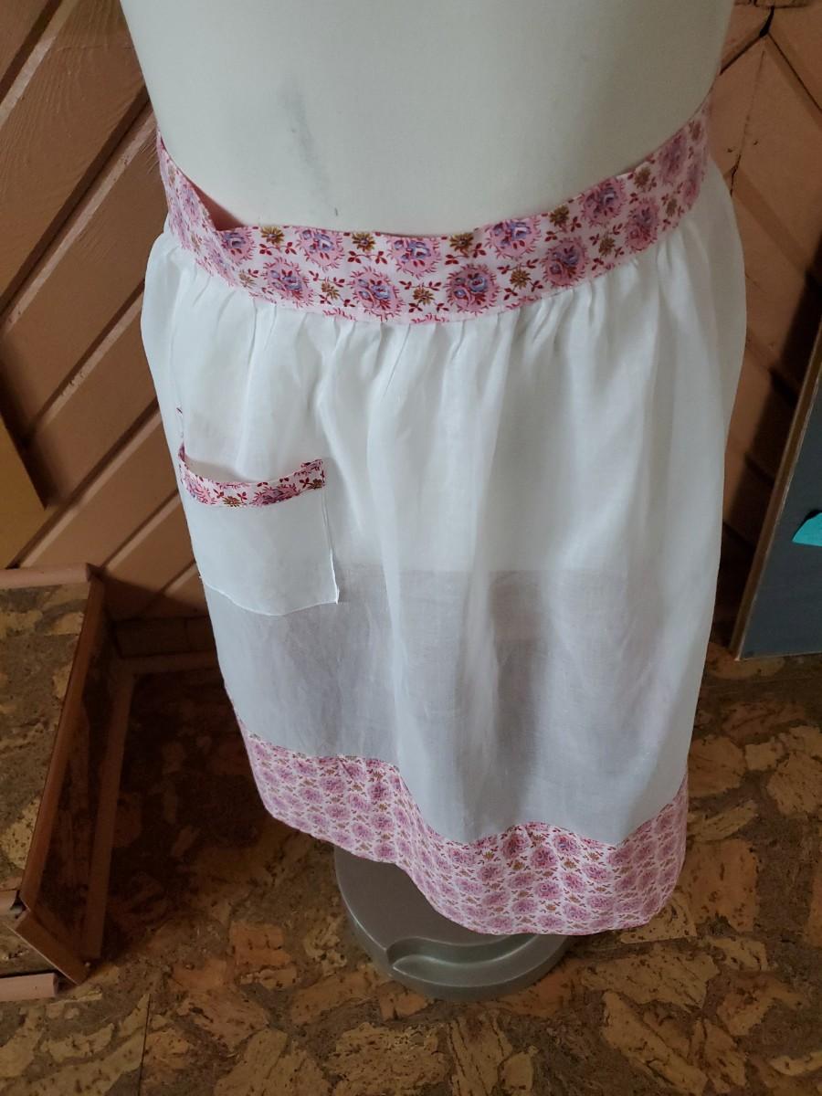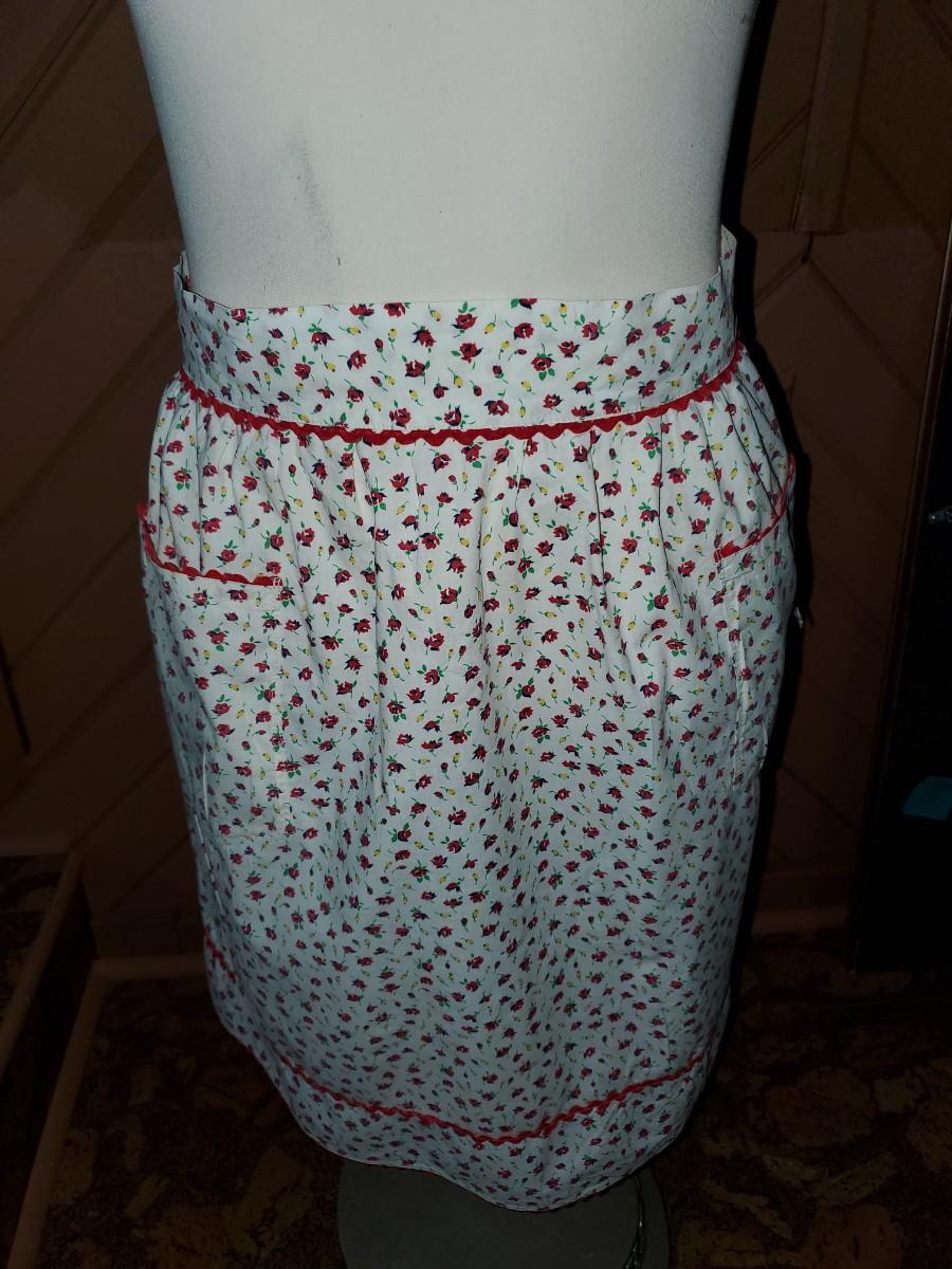 2 pretty old full aprons; The rest are half aprons. All handmade by a talented seamstress. All are in wearable condition. Some are small and short; others for a bigger person. They are old and they've all been worn to one degree or another so some do have minor faults.