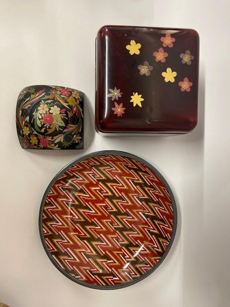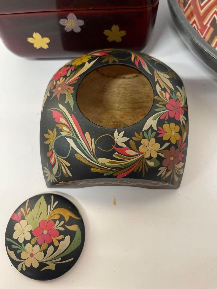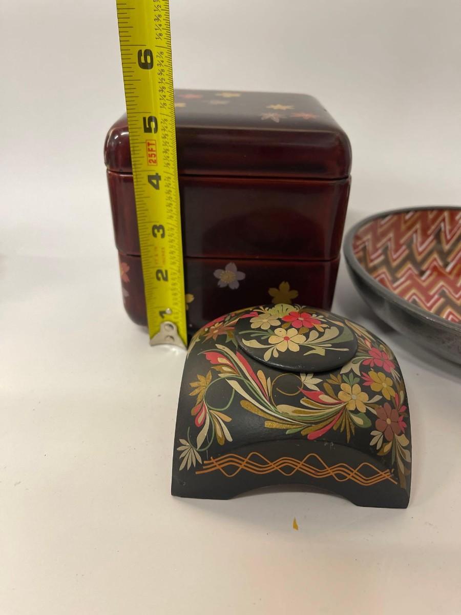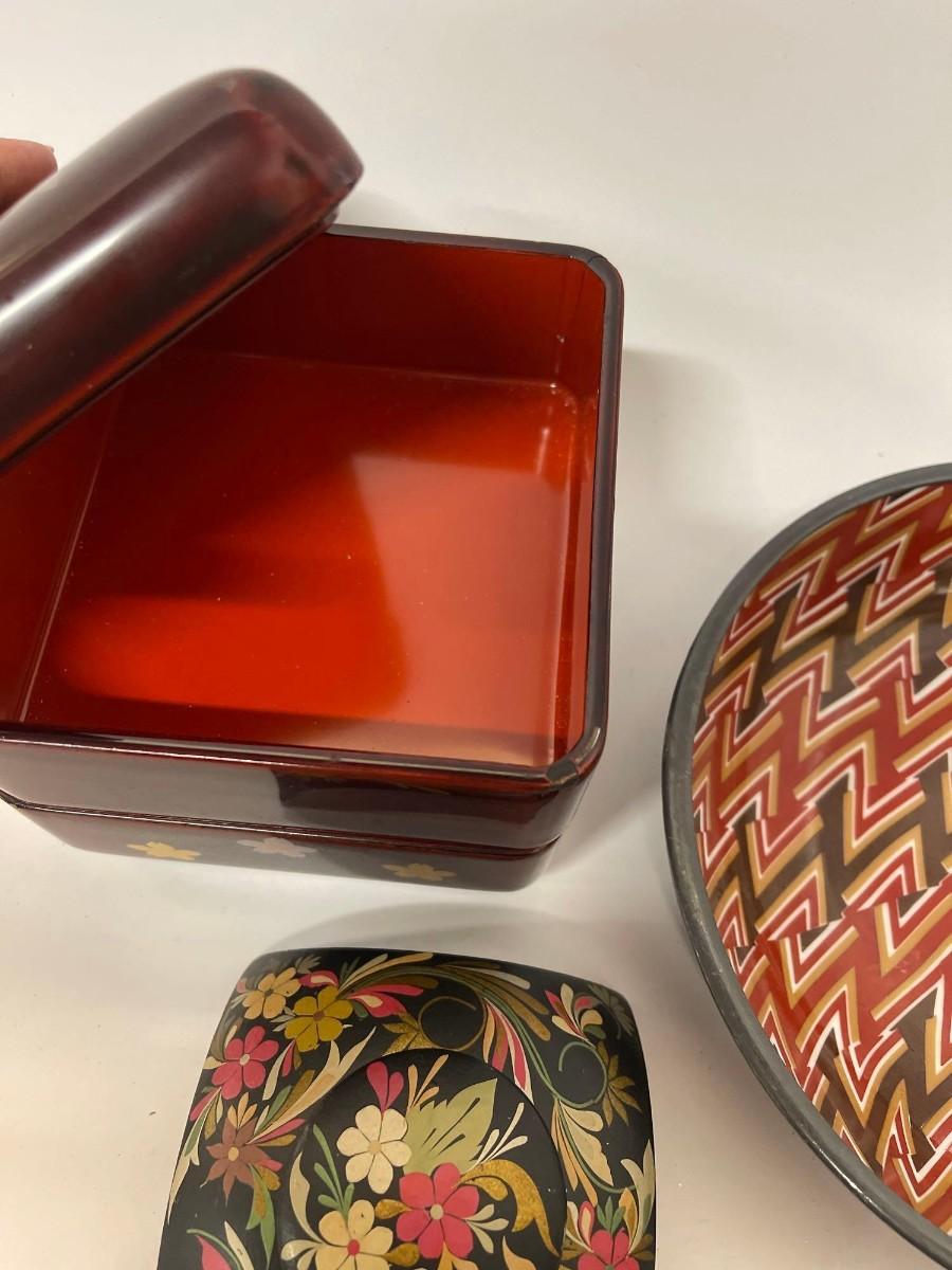<p>Includes Nieman Marcus pewter lined porcelain bowl, hand painted wood trinket dish with lid, and lacquered two tier box with lid. </p>