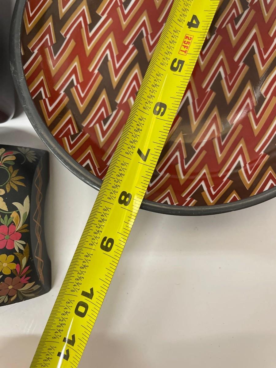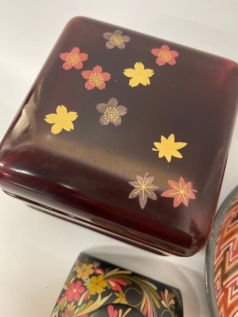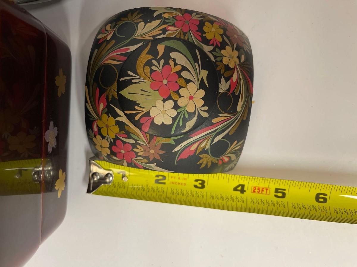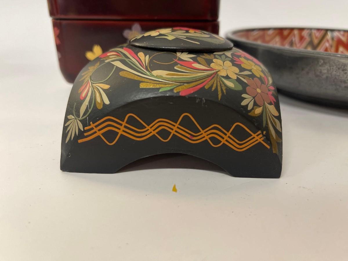 <p>Includes Nieman Marcus pewter lined porcelain bowl, hand painted wood trinket dish with lid, and lacquered two tier box with lid. </p>