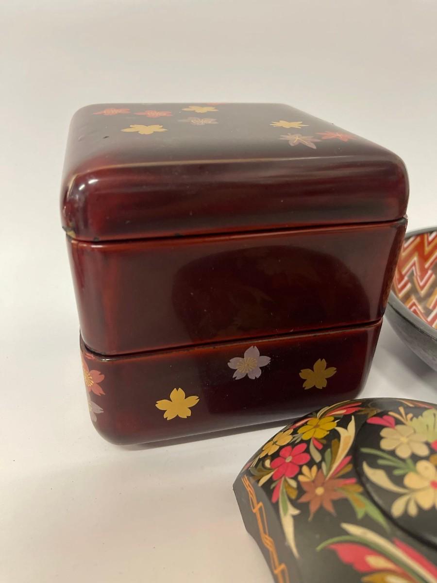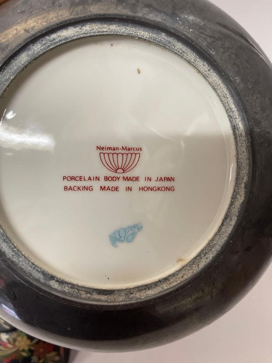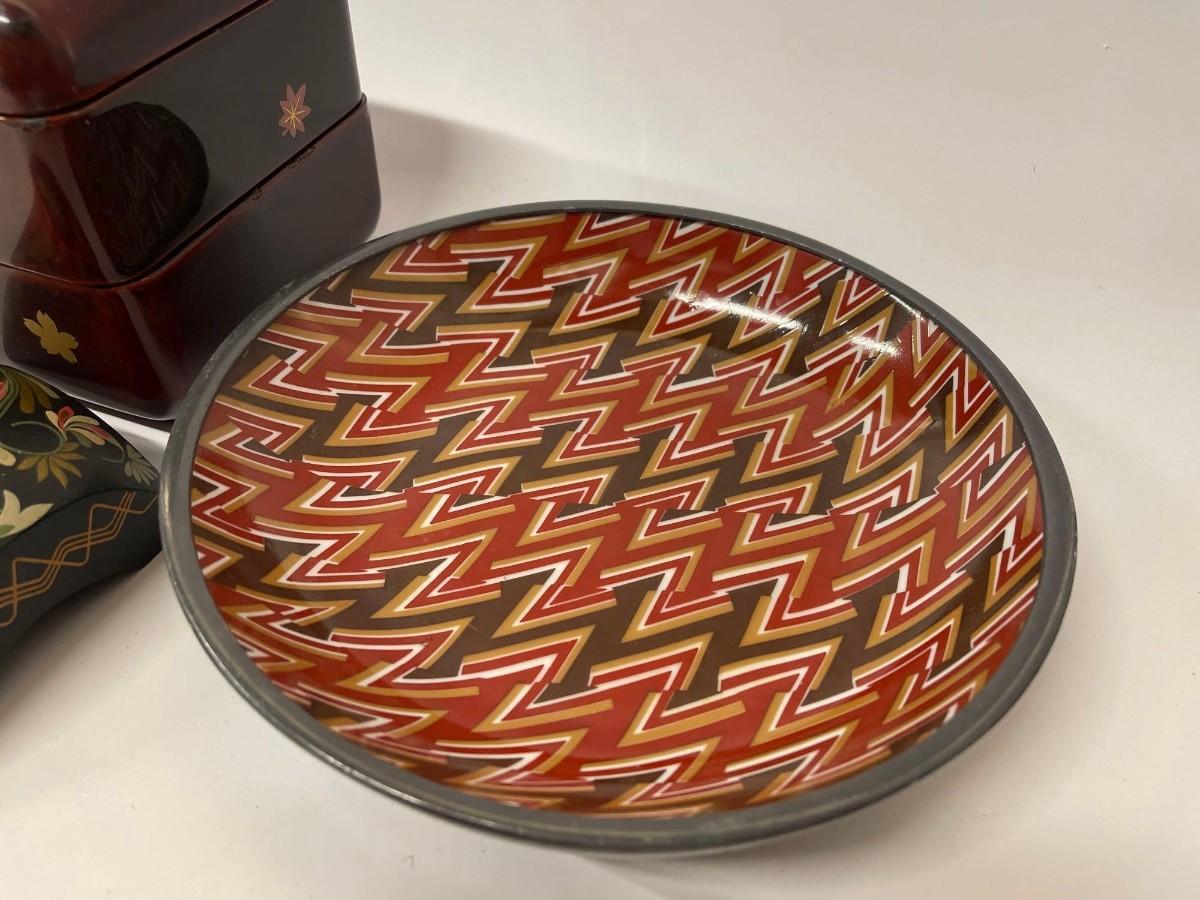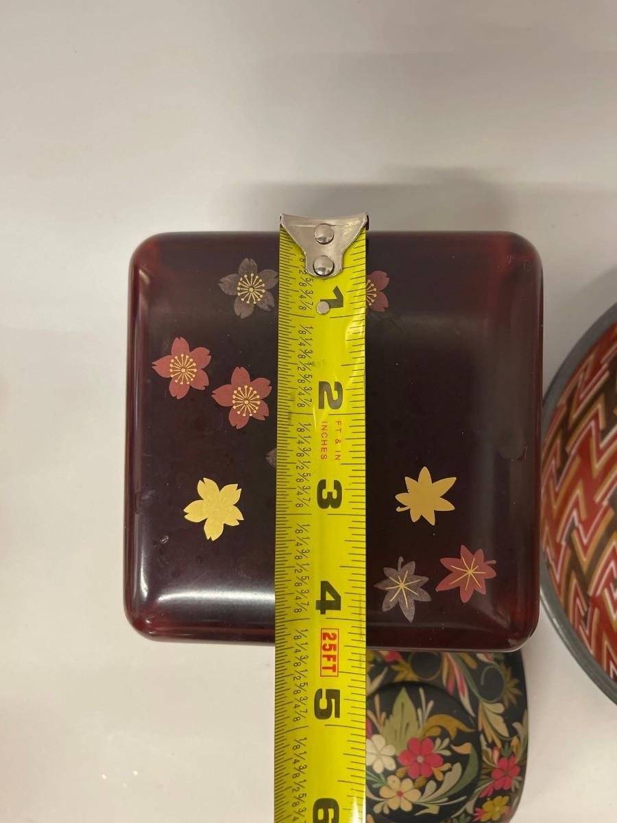 <p>Includes Nieman Marcus pewter lined porcelain bowl, hand painted wood trinket dish with lid, and lacquered two tier box with lid. </p>