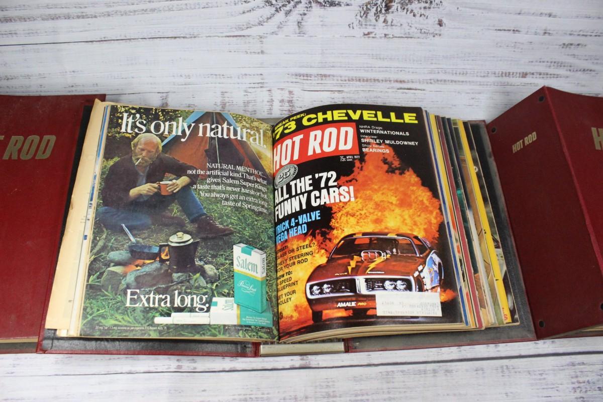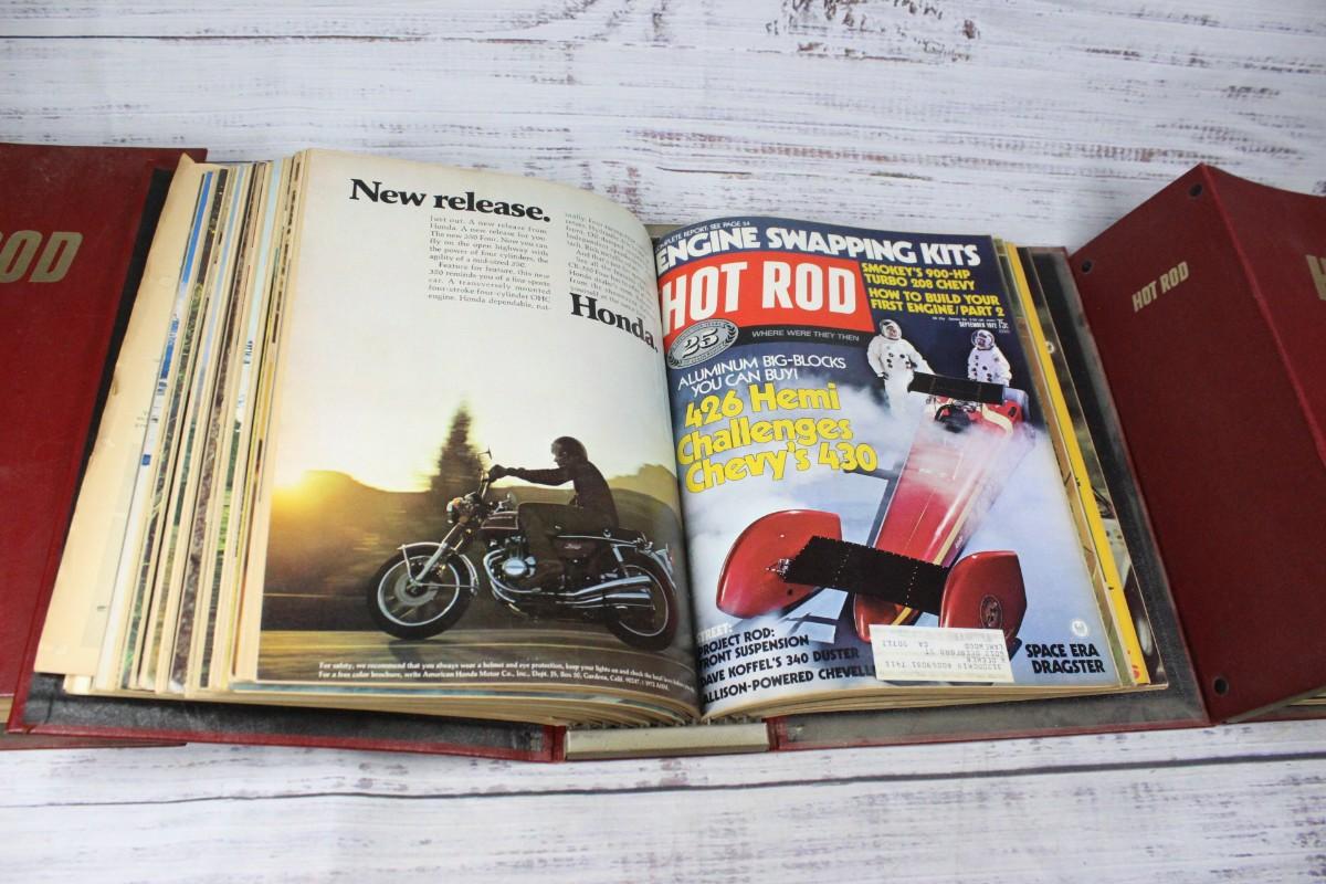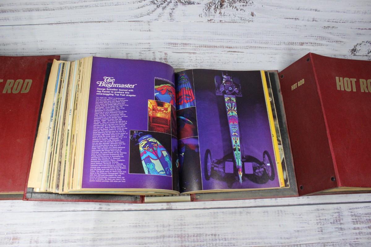 Lot of Vintage Binders of Hot Rod Magazines, there's no significant rips or tears to any of the pages or binders. Check pictures for more details and for sizing. Each bidder contains one year of magazines.