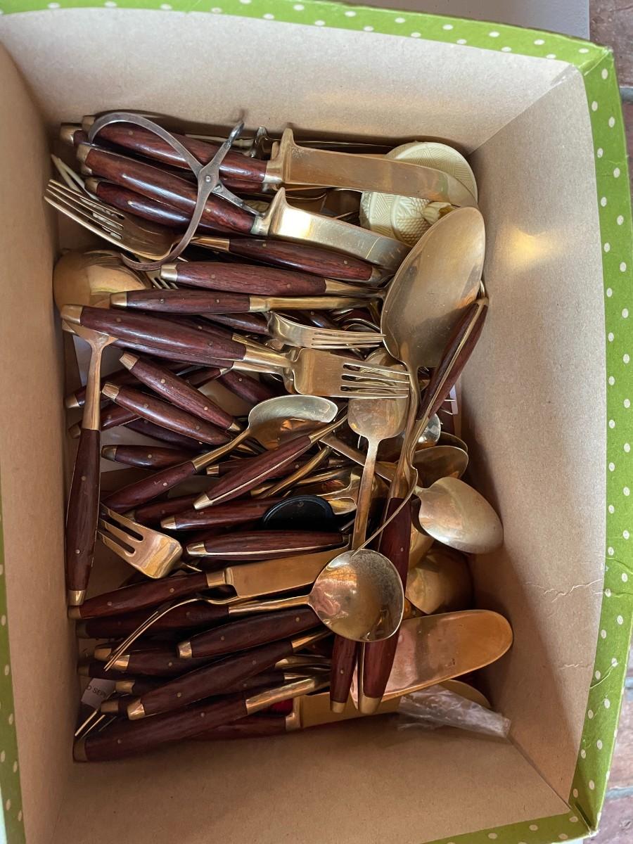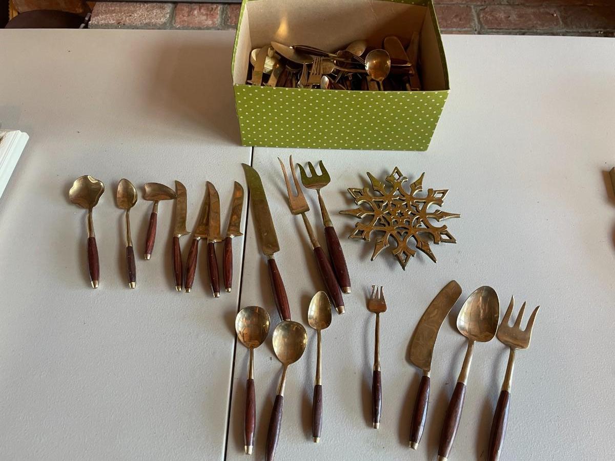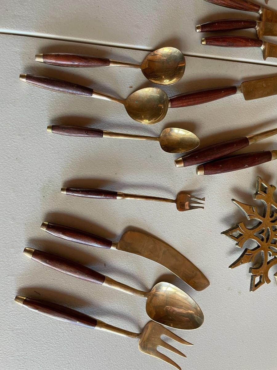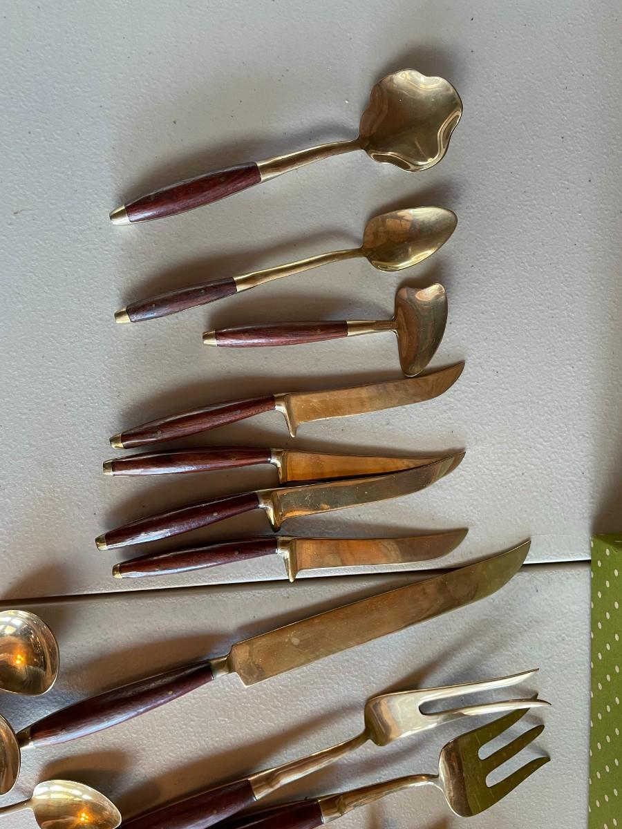 Beautiful Vintage Complete set of flatware. Lot includes a large quantity of several brass kitchen items also.