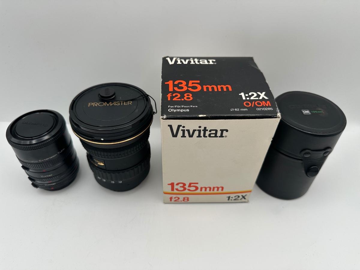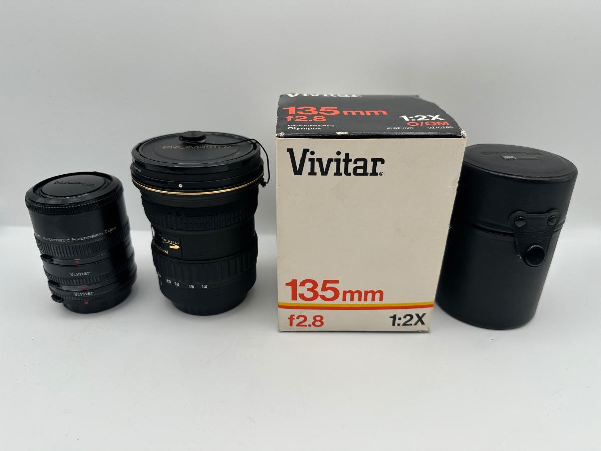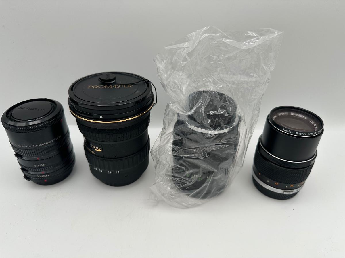 Lot of Vintage Camera Lenses – Vivitar 135mm f/2.8, Olympus OM-System 135mm, Promaster AF 12-24mm, Vivitar Extension Tube