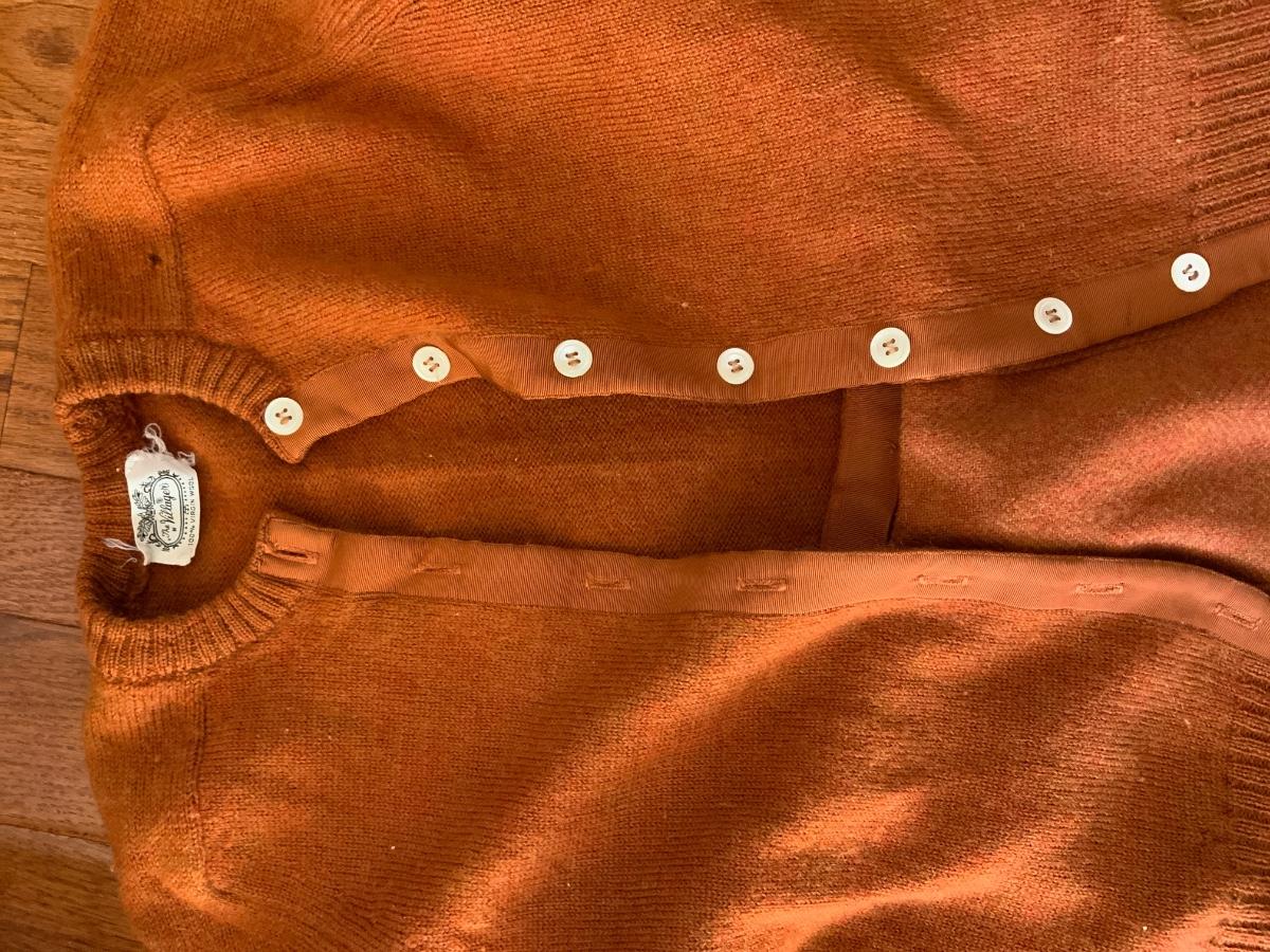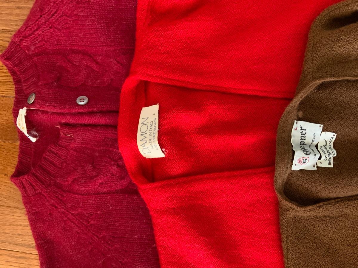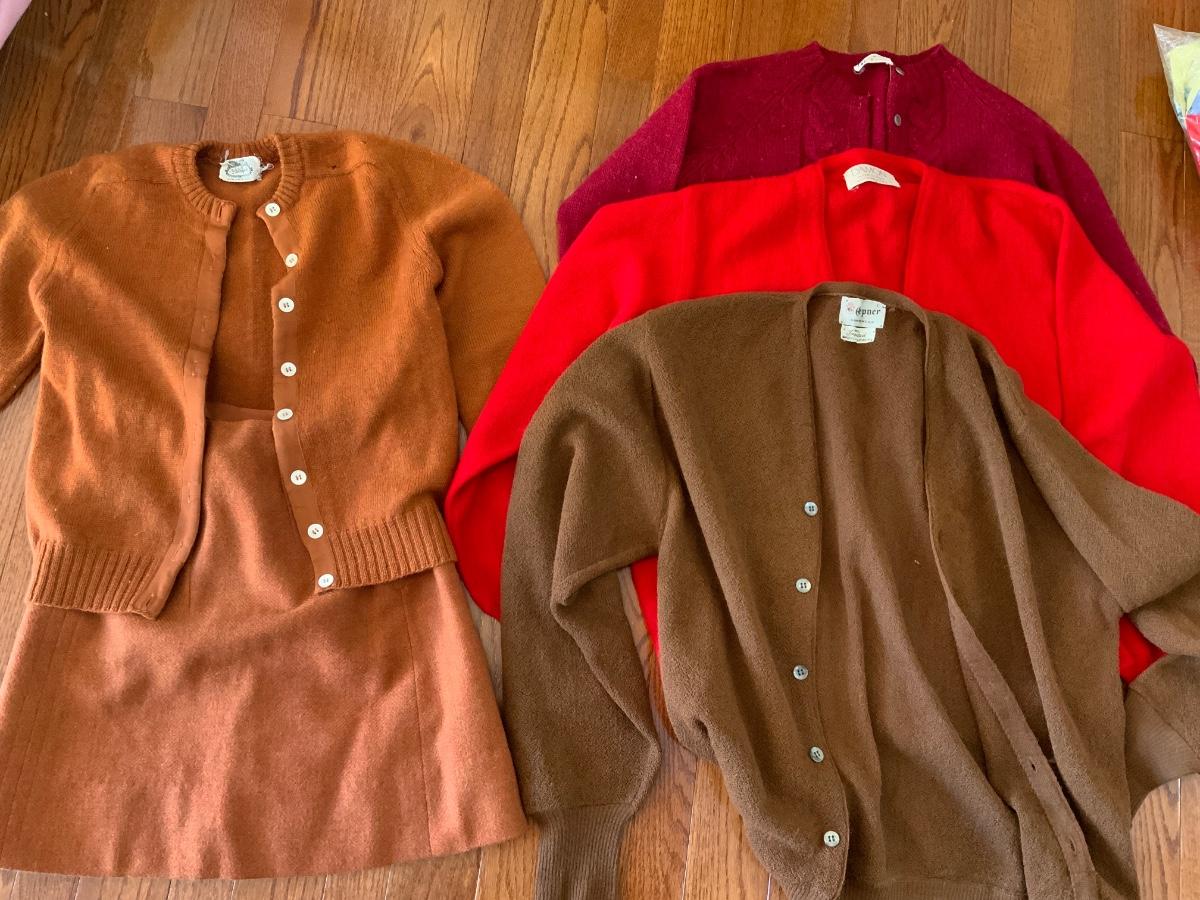 Lot of Vintage Cardigans one with matching Skirt. Including made from Alpaca. Note, Rust colored sweater does have a few holes.