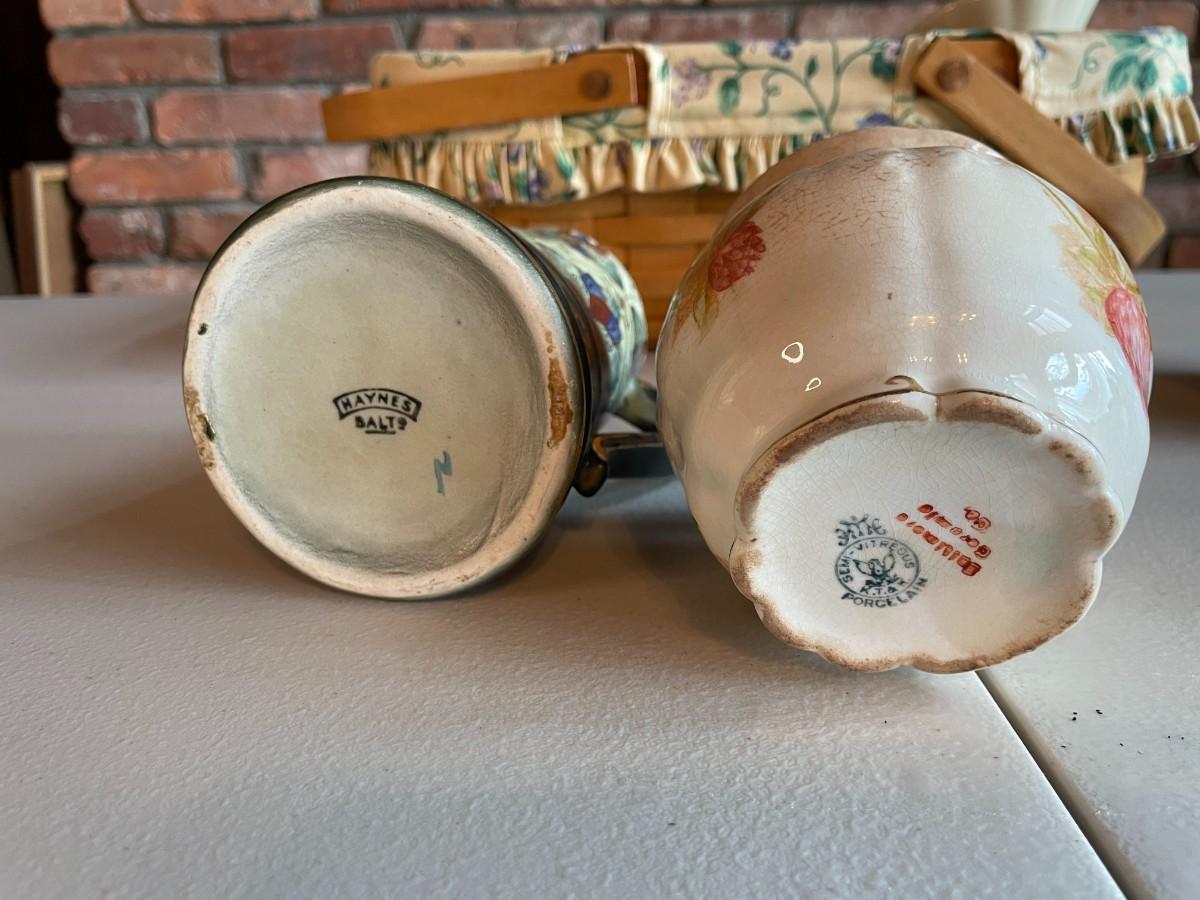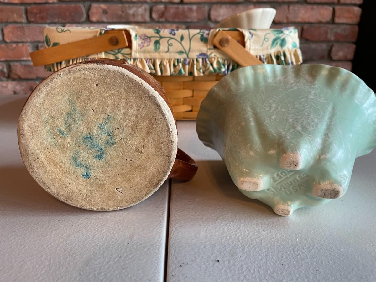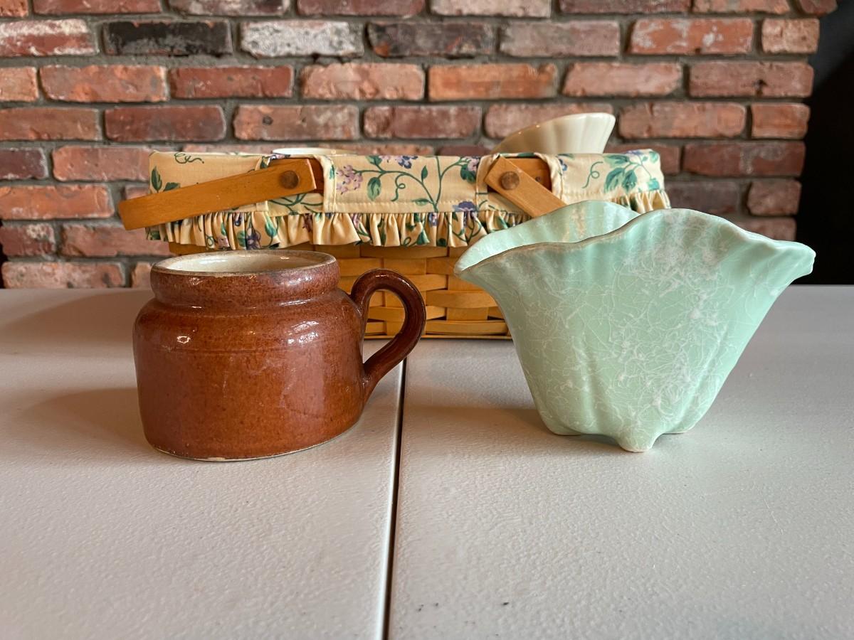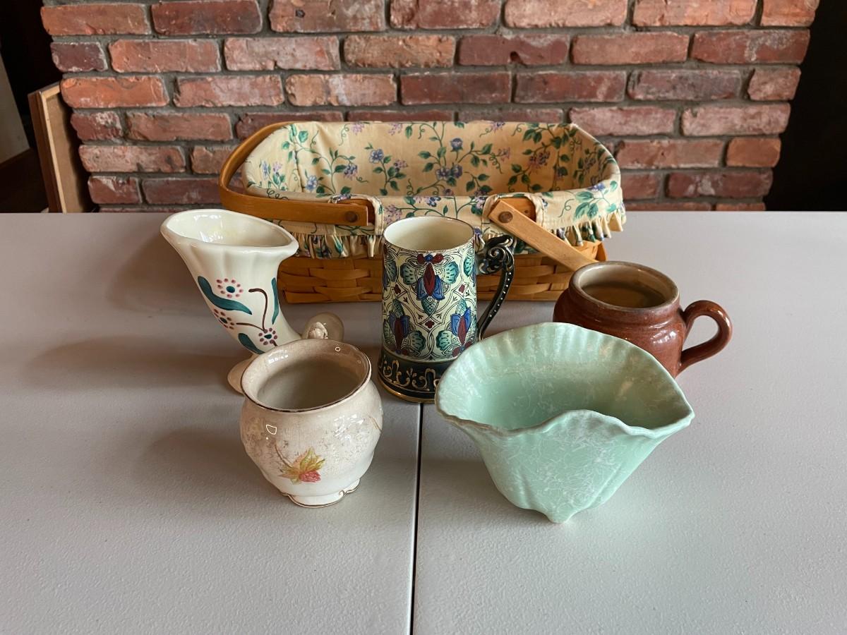 Lot of Vintage Ceramic and Pottery Vases, Jugs, and a Lined Wicker Basket