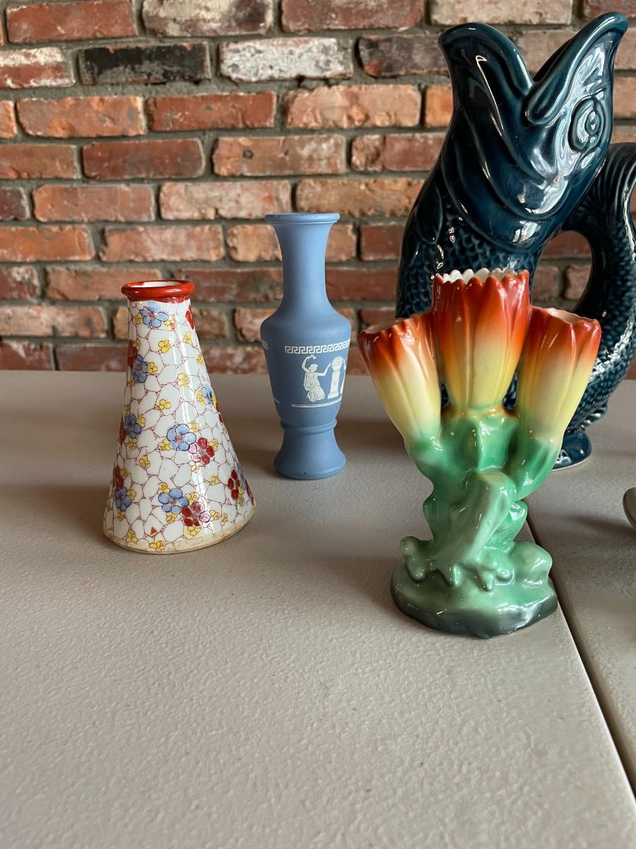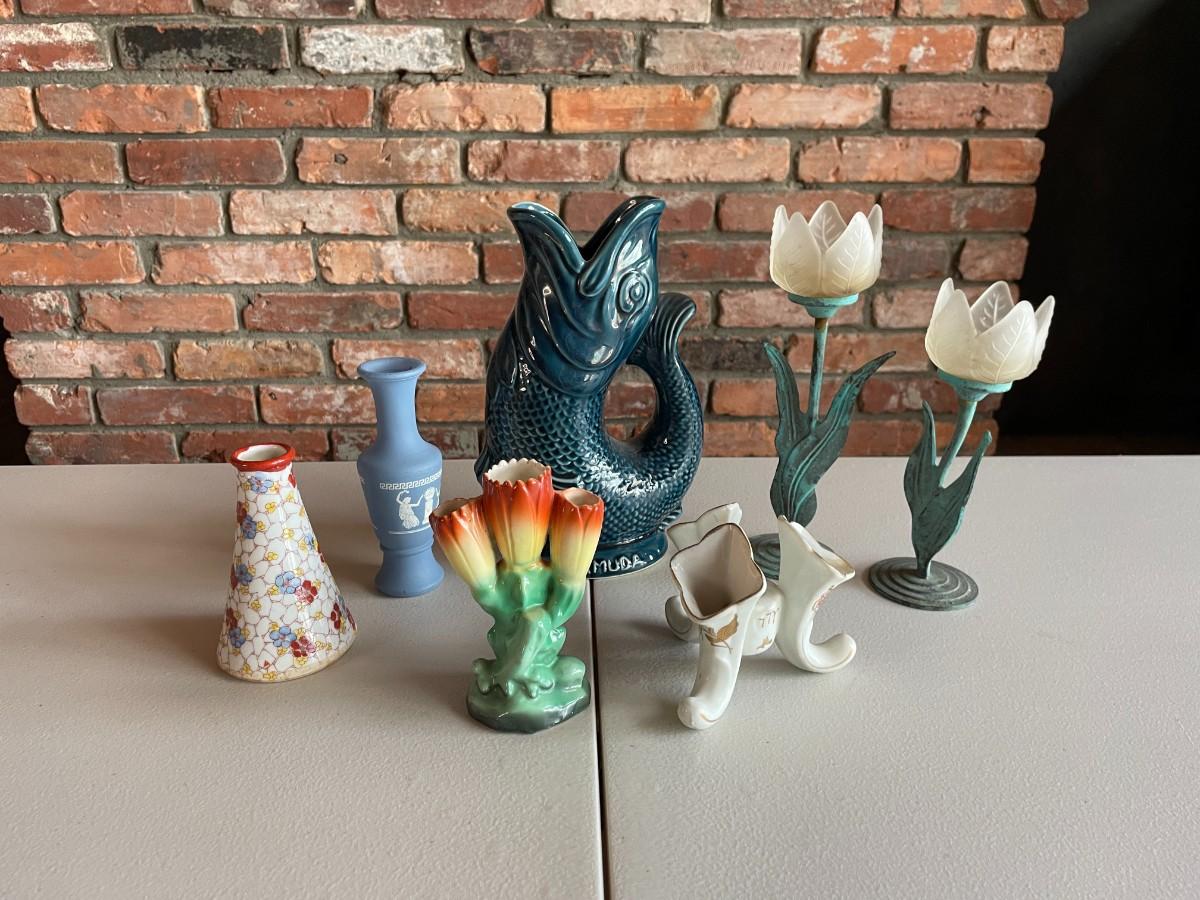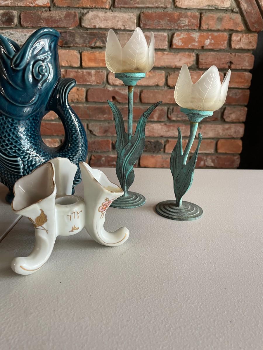 2 Brass steam frosted glass tulip candle holeder. Floral candle stick holder/ Vase. Vintage Dartmouth pottery blue fish jug etc. Fish: 6W x 9h