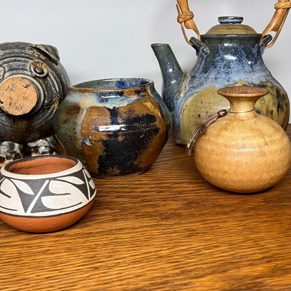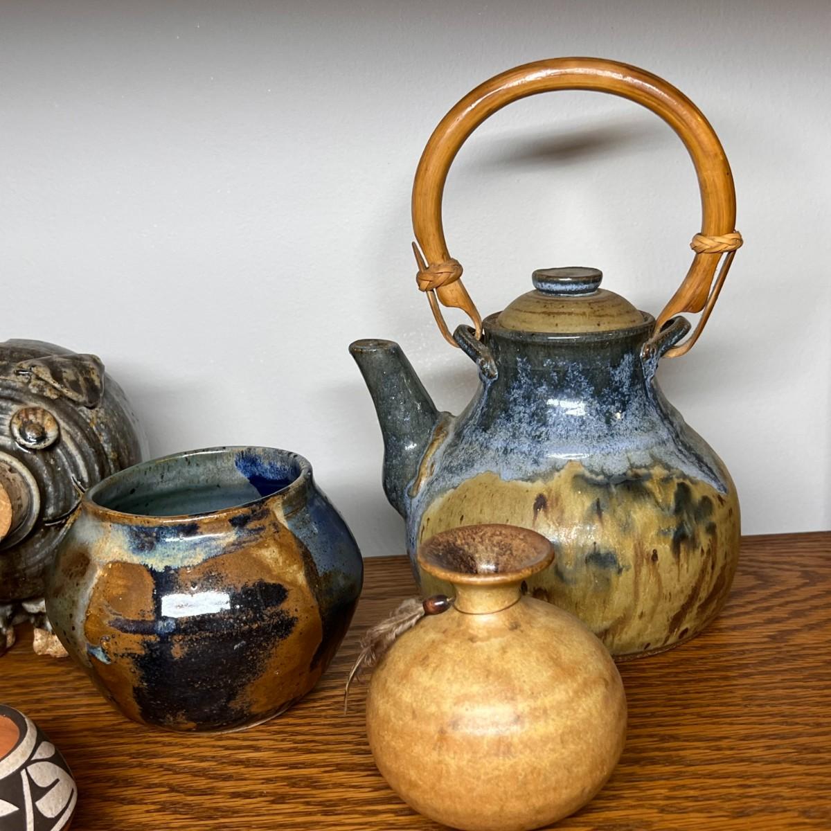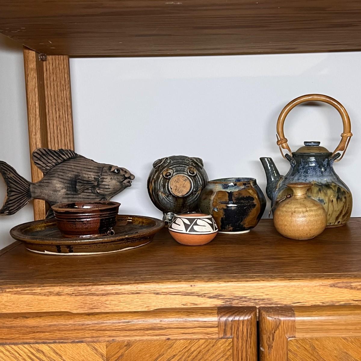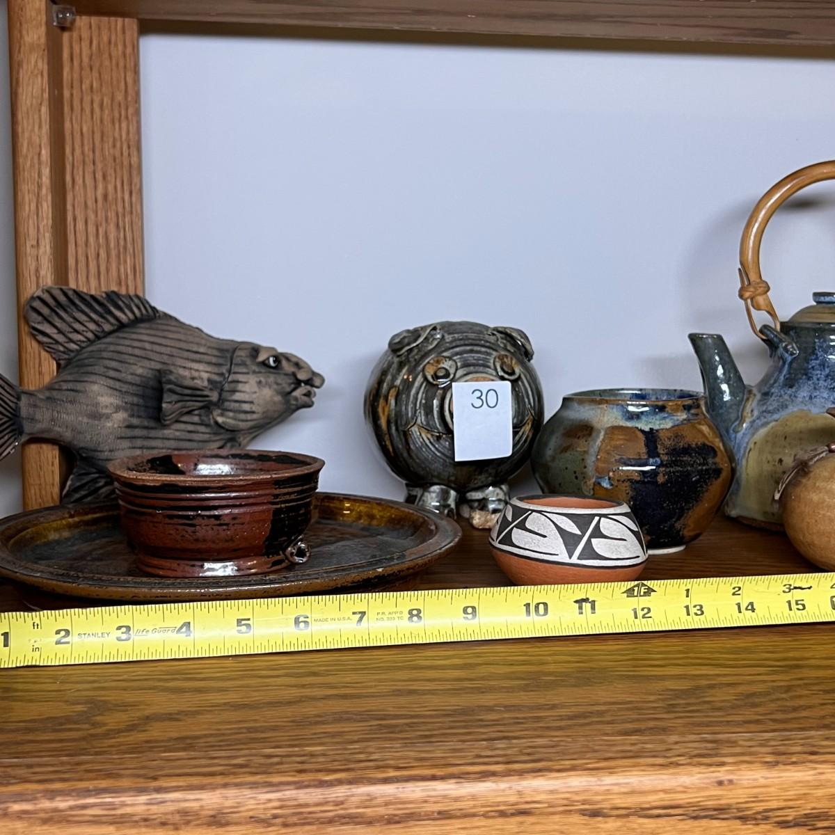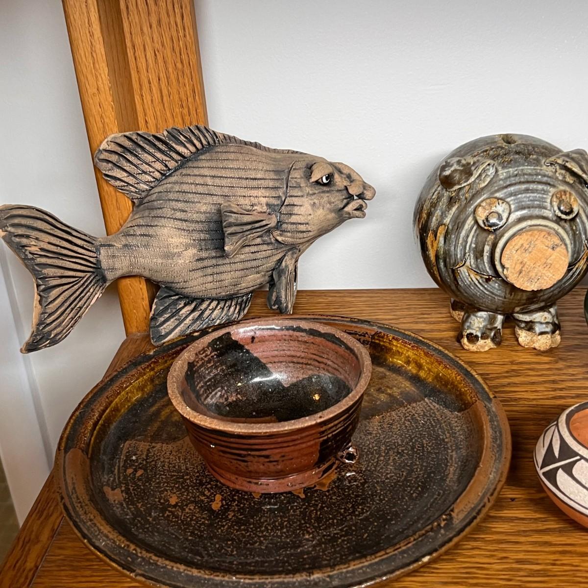 Mixed lot of bowls, kettle, pig bank, fish wall hanging