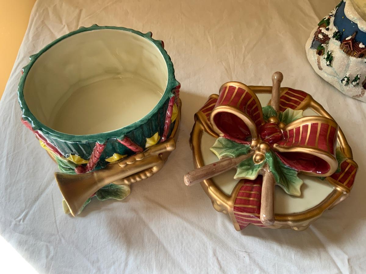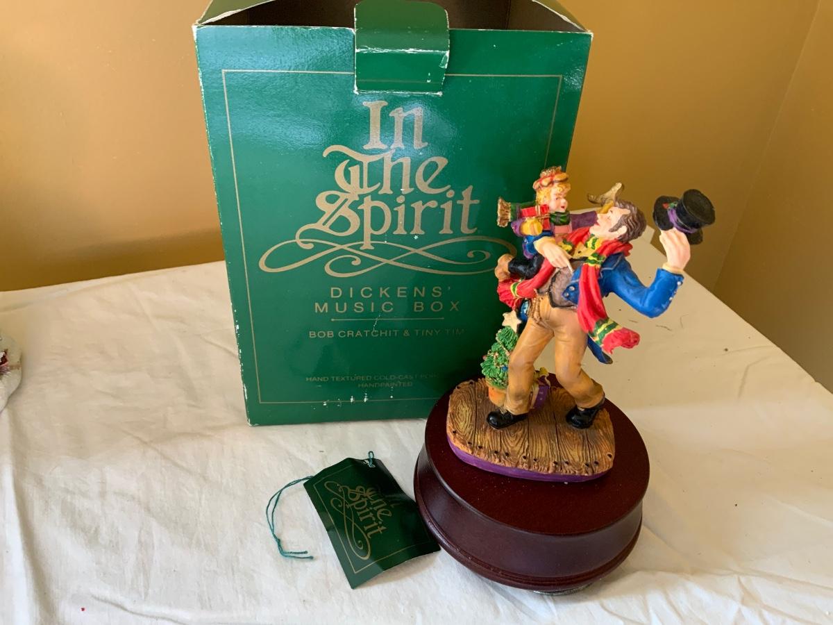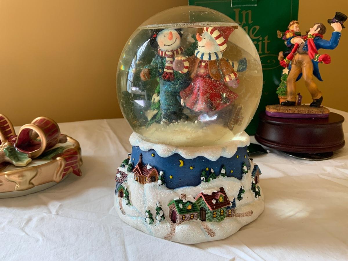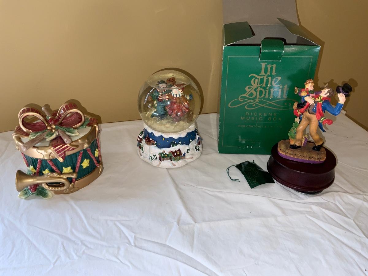 Nice a lot of vintage Christmas items which includes a snow snow globe, Candy dish and a music box.