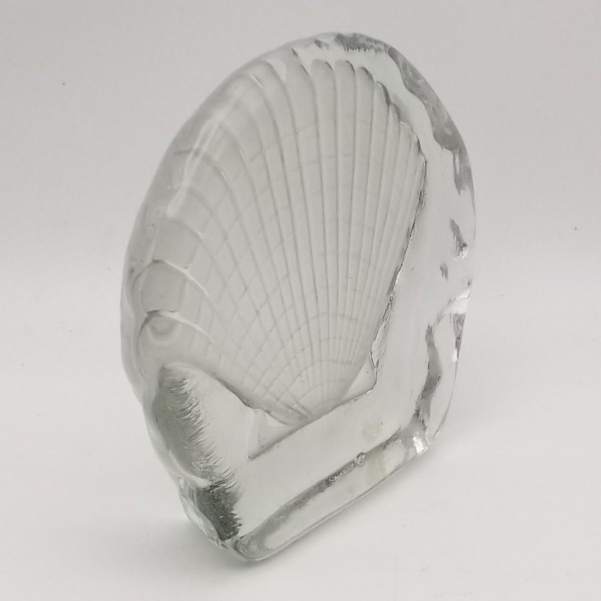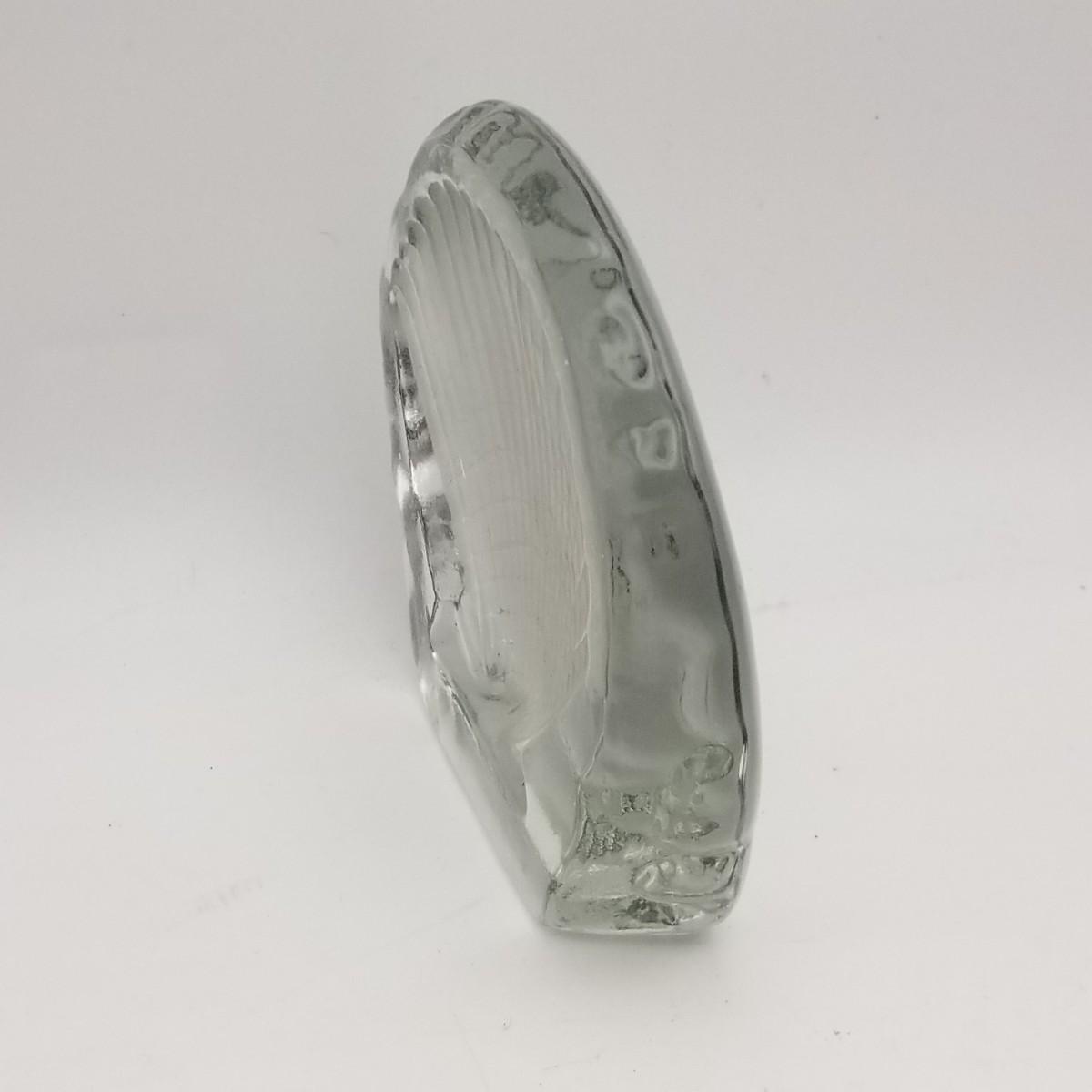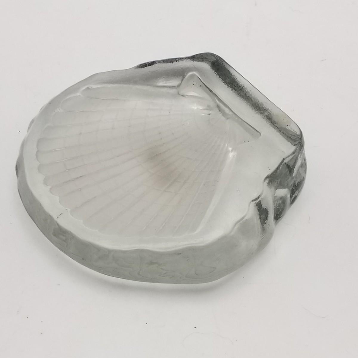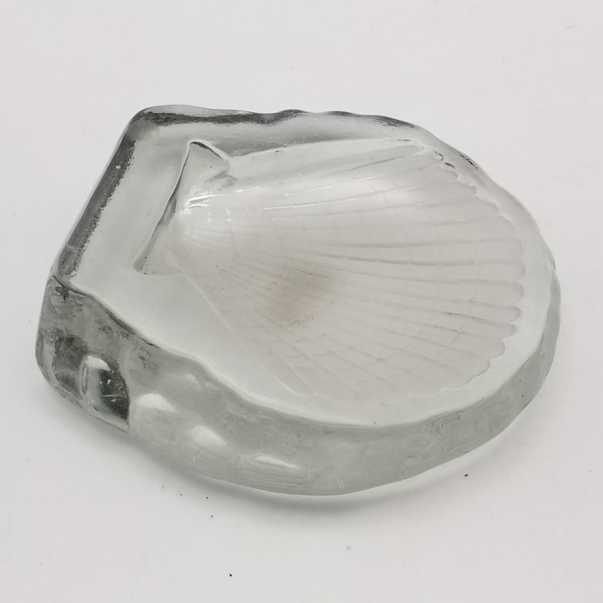 Clear Thick Glass Trinket Tray with Seashell / Clamshell design, approximately 4 wide x 4 x 1 inches.