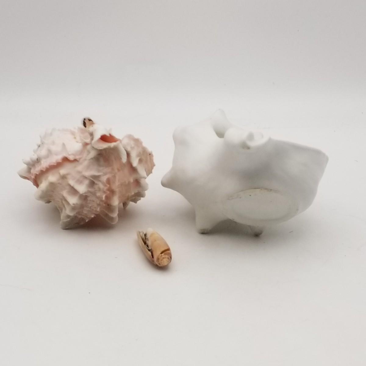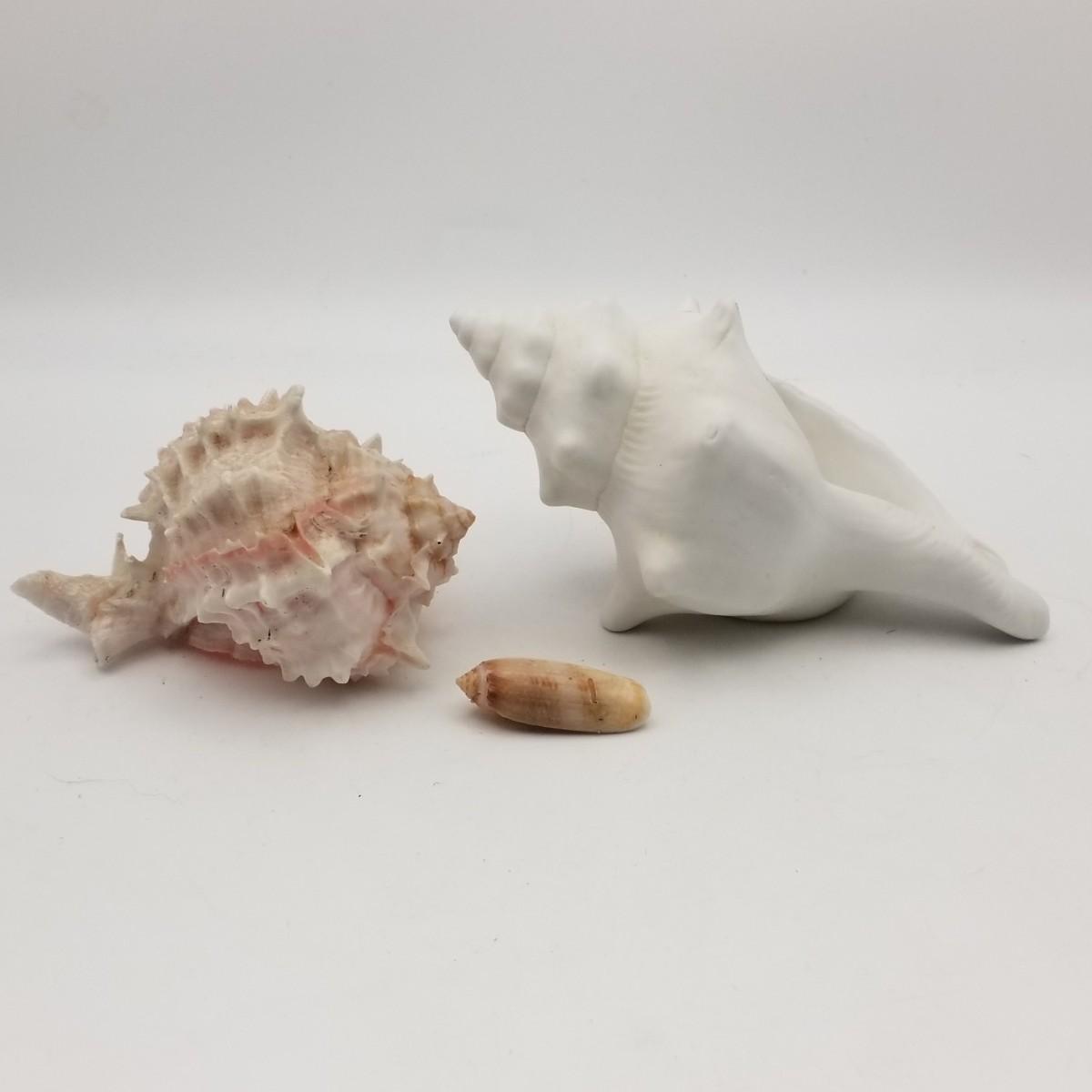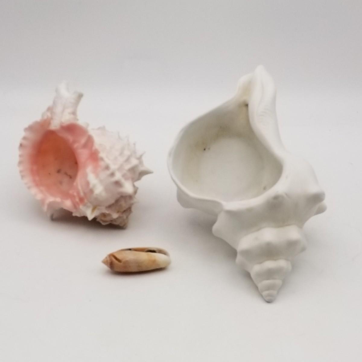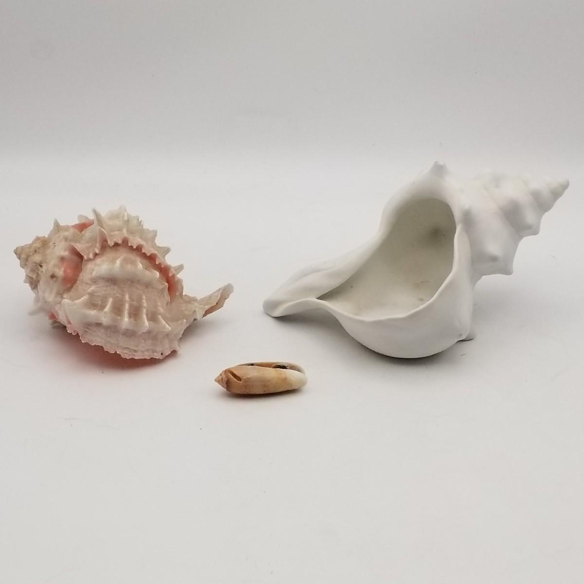 2 Seashells, various sizes: approximately 1/2 wide x 1 1/2 inches and Pink Murex Shell 3 wide x 4 inches.