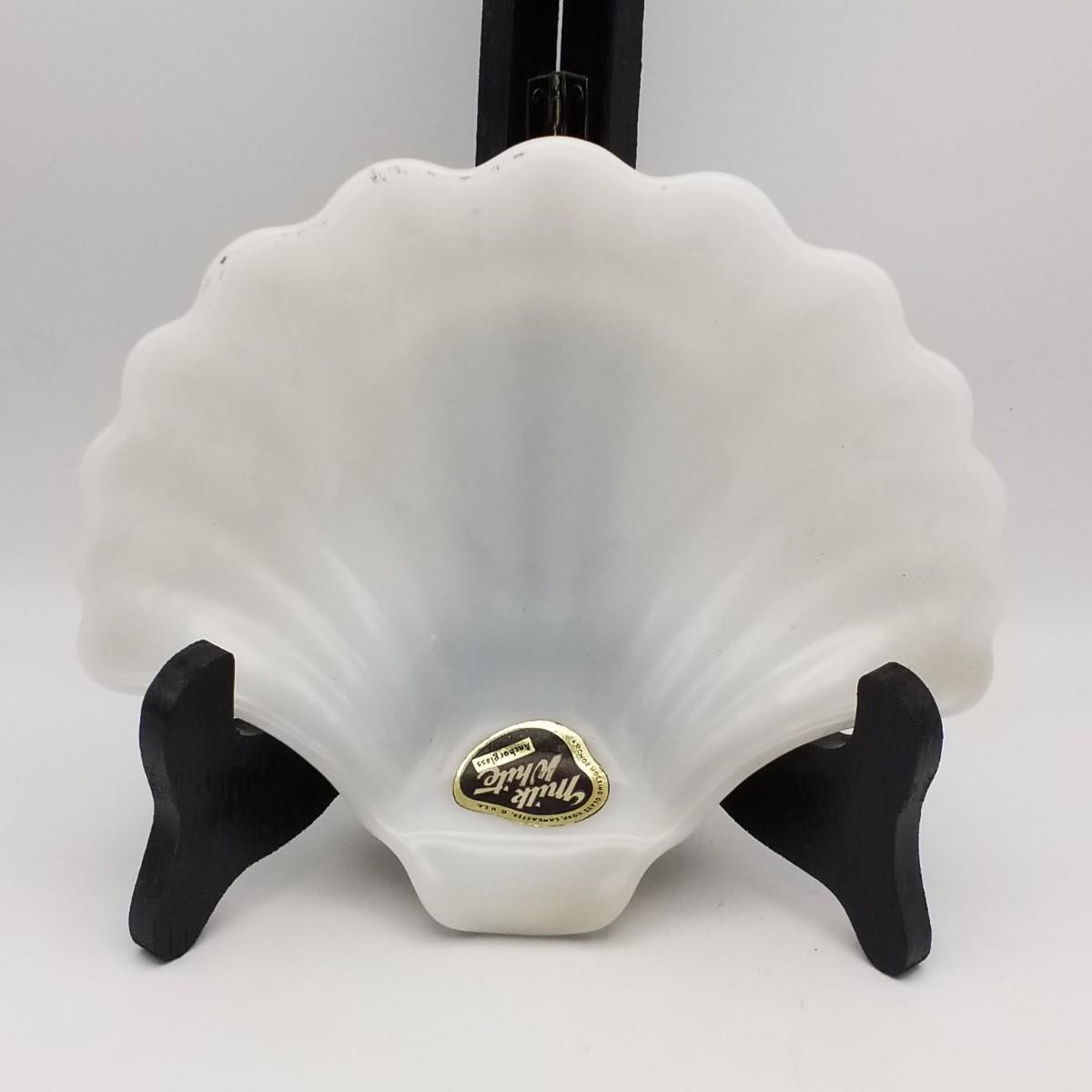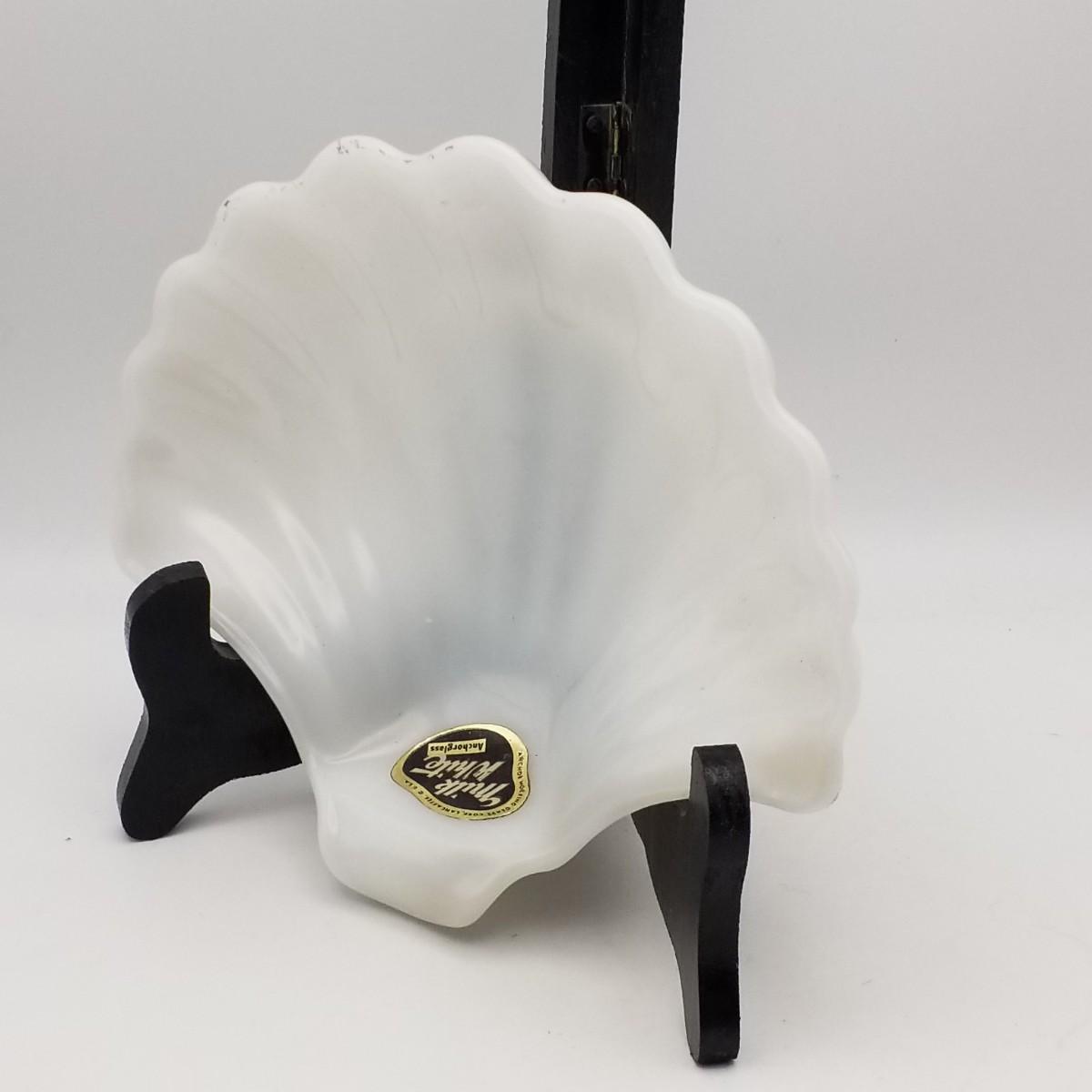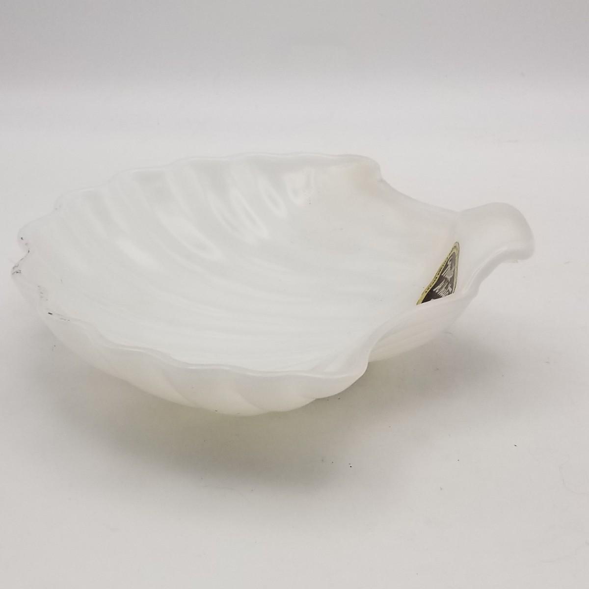Milk White Anchor Glass Sea Shell / Clam Shaped Tray / Bowl, by Anchor Hocking Glass Corp, Lancaster, Ohio, USA, approximately 7 wide x 6 x 1 1/2 inches. Has original label: see photo for detail.