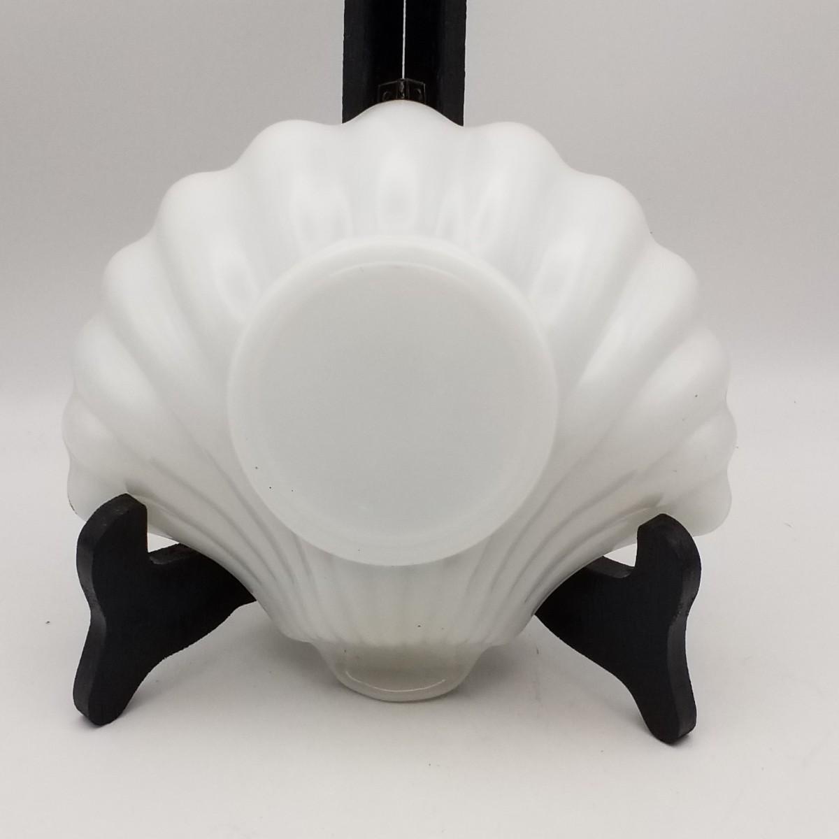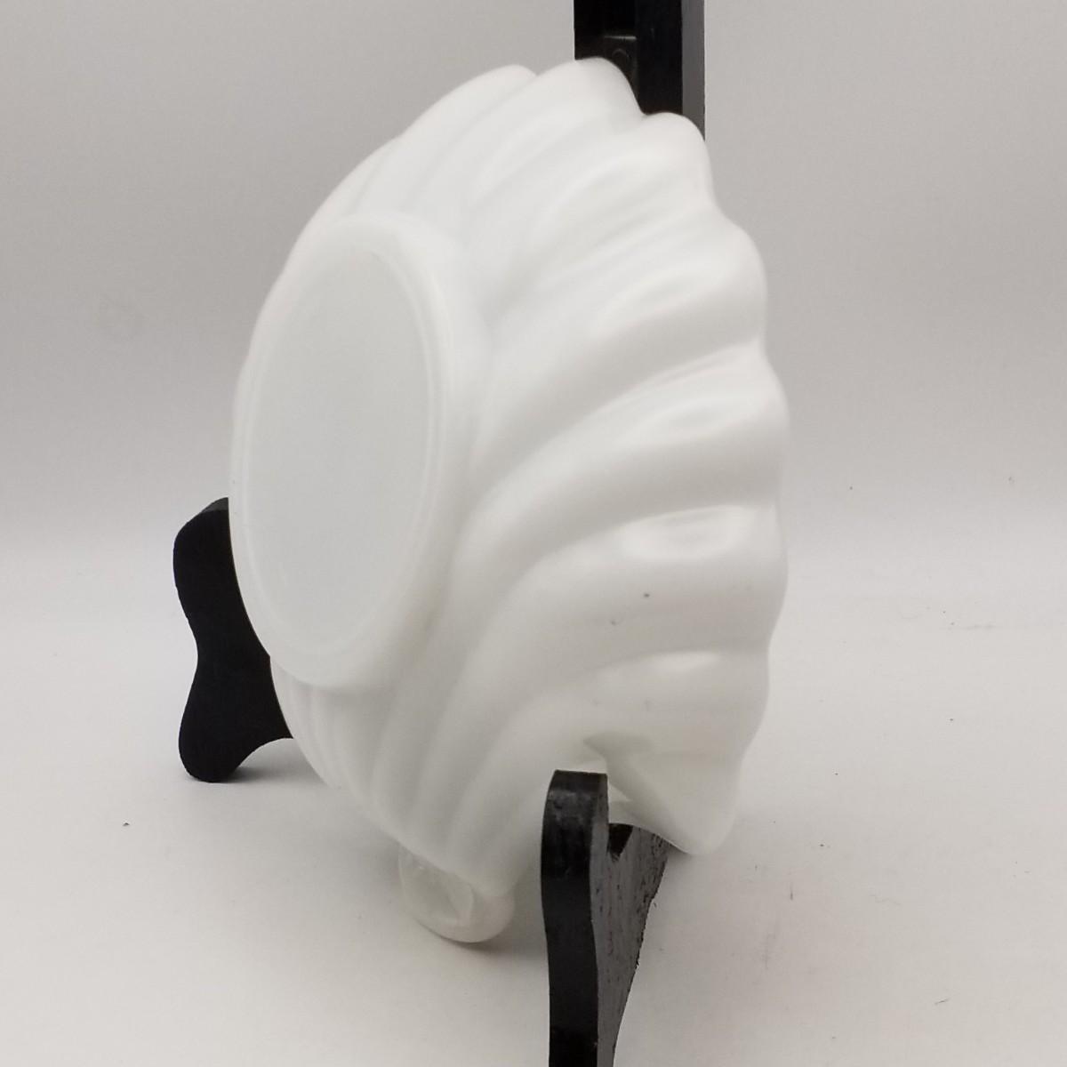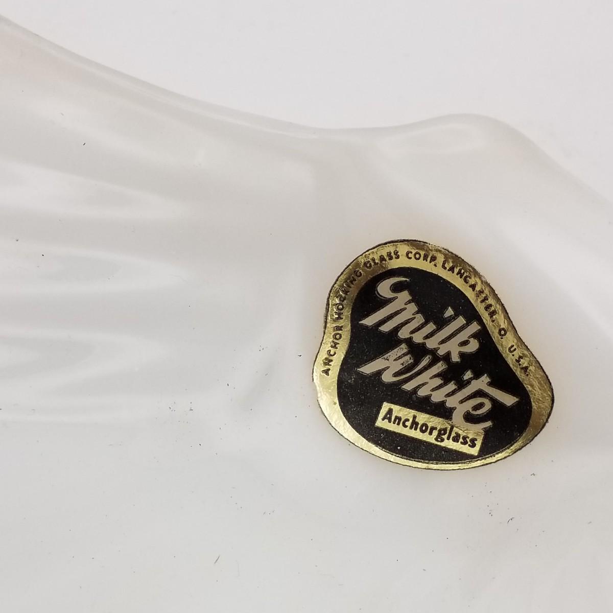 Milk White Anchor Glass Sea Shell / Clam Shaped Tray / Bowl, by Anchor Hocking Glass Corp, Lancaster, Ohio, USA, approximately 7 wide x 6 x 1 1/2 inches. Has original label: see photo for detail.