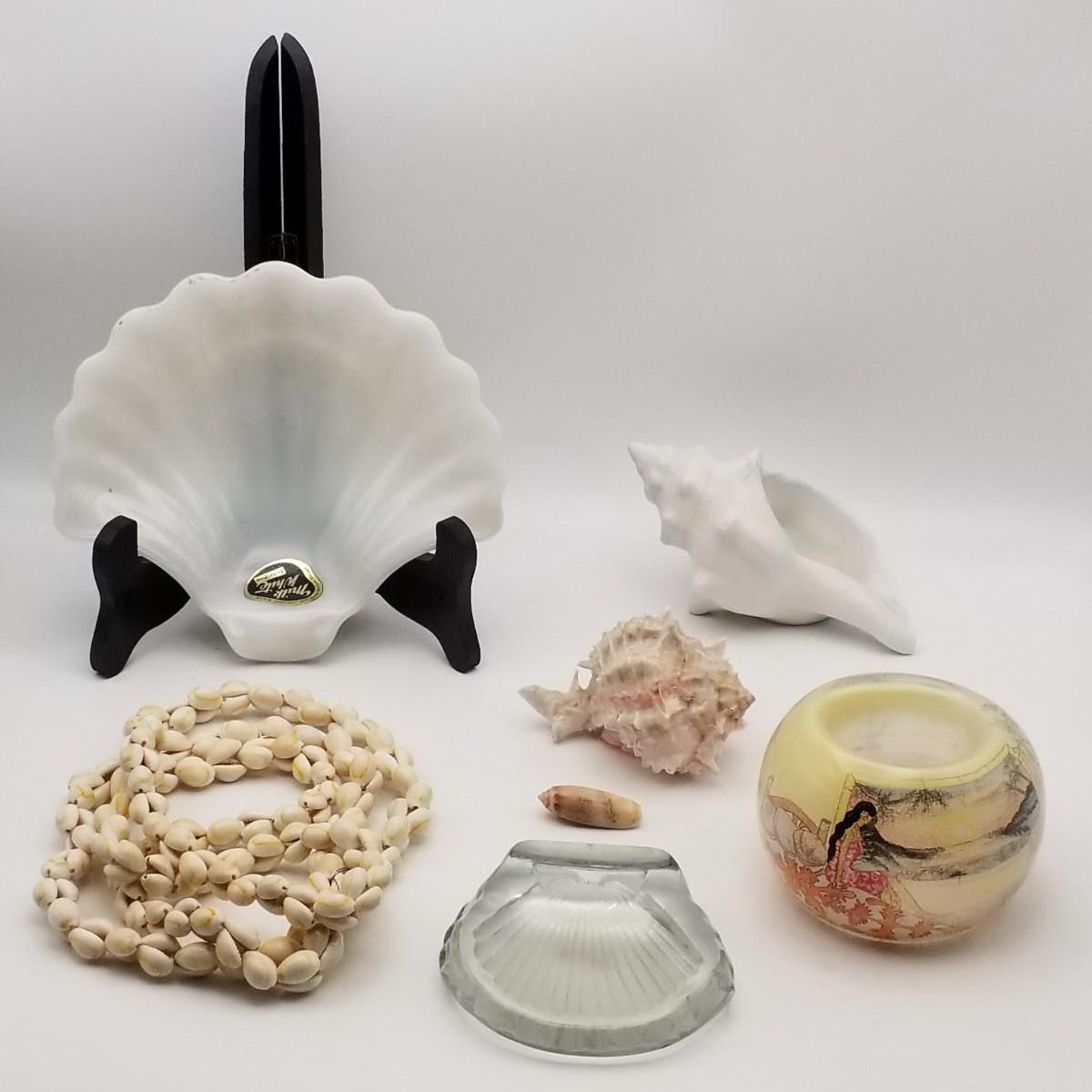 Title: Lot of Vintage Seashell Theme: Clear Glass and Milk White Anchor Glass Tray / Bowl, Long Cowrie Shell Necklace Lei 52", Shells, Tropical Theme Illustrated Votive Candle Holder
