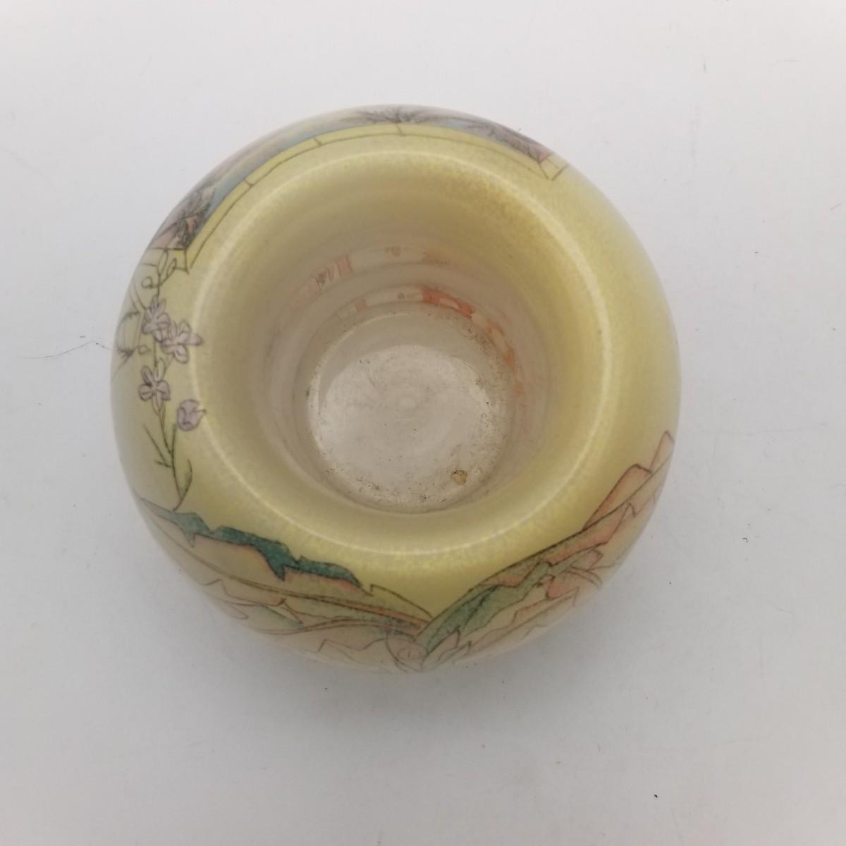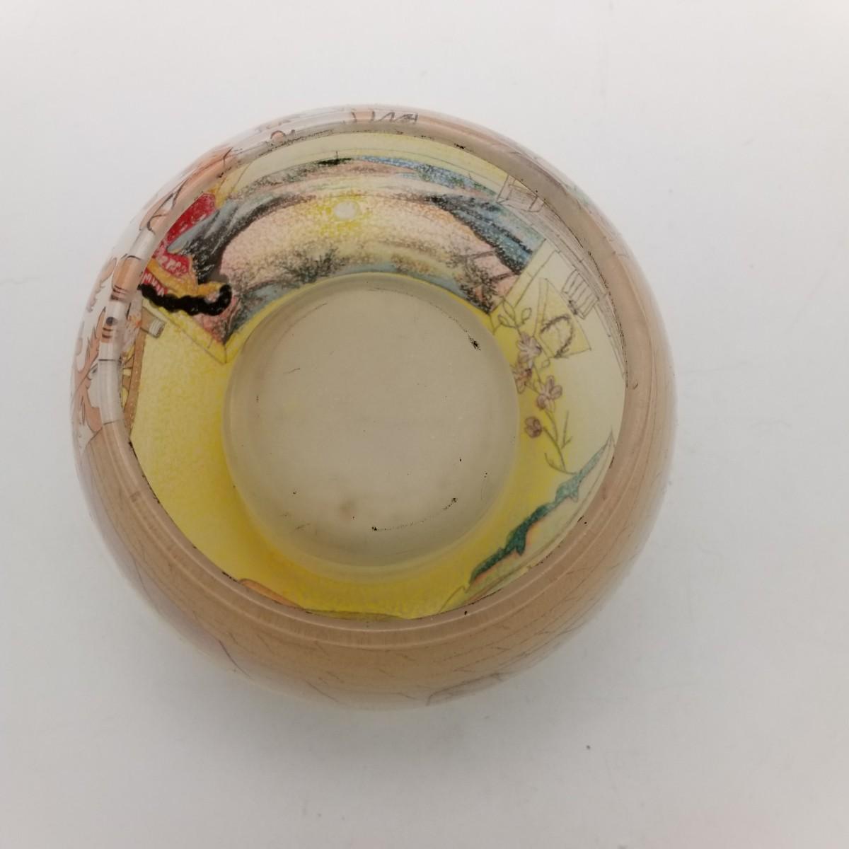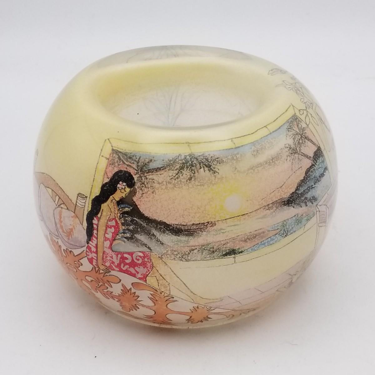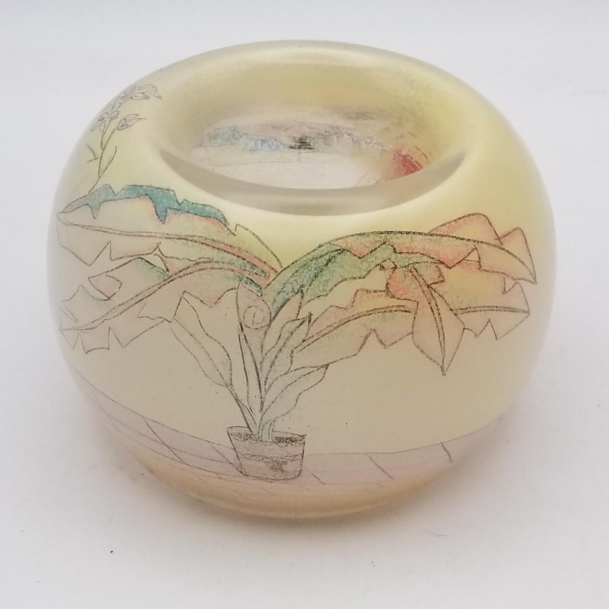 Yellow Glass Tea Light Candle Votive/ Holder with applied Reverse Glass Illustration/Decoration (looks similar to Reverse glass painting), approximately 4 wide x 3 inches.