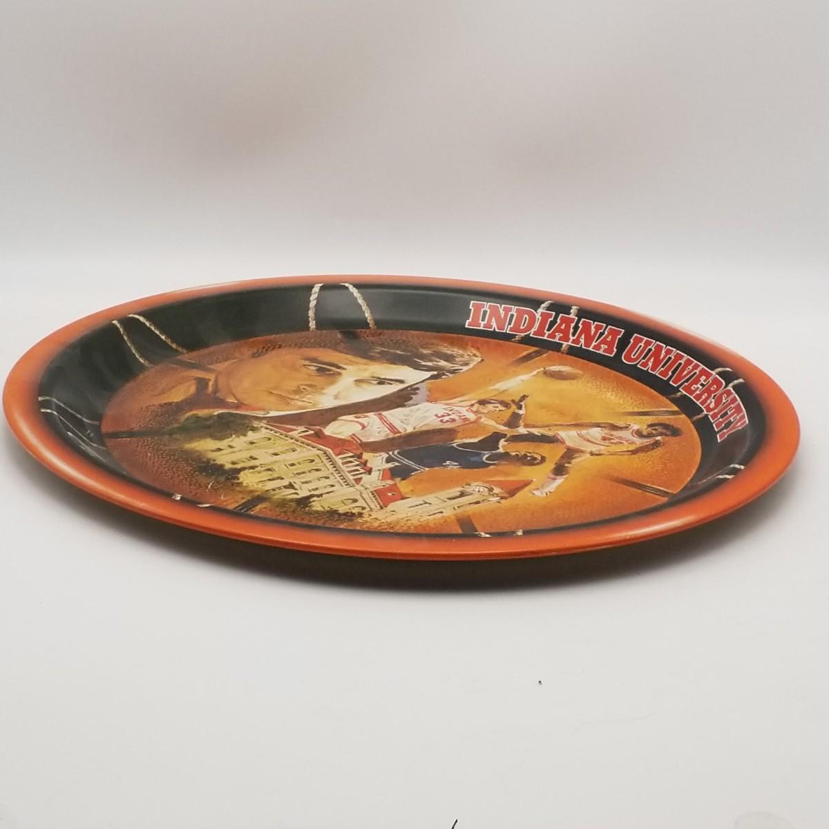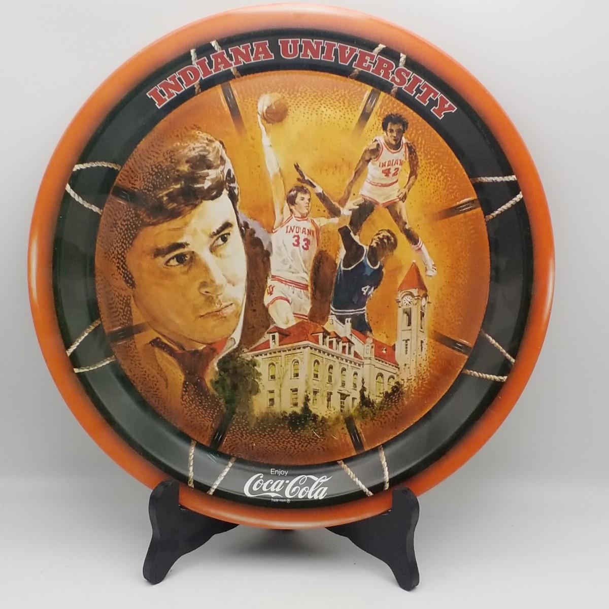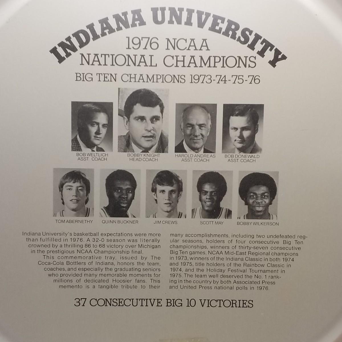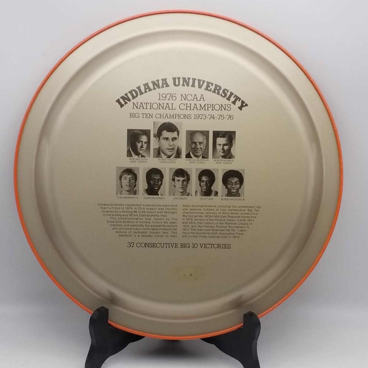 1976 Indiana University Basketball & Coca-Cola Commemorative Metal Tray, approximately 12 inches wide. Coaches and players listed on back of commemorative metal tray includes: Head Coach Bobby Knight, Assistant Coach Bob Weltlich, Assistant Coach Harold Andreas, Assistant Coach Bob Donewald, Tom Abernathy, Quinn Buckner, Jim Crews, Scott May, Bobby Wilkerson. Does not include plate stand.