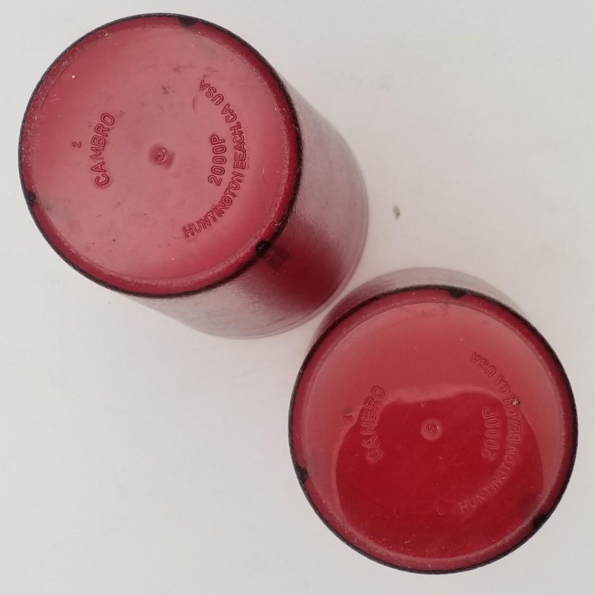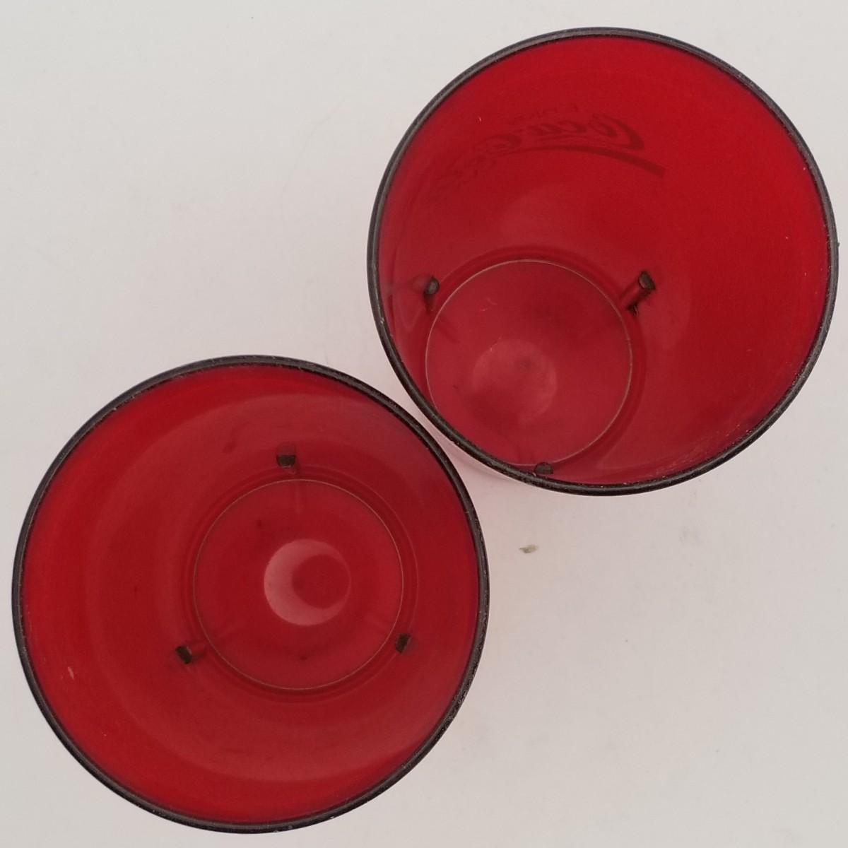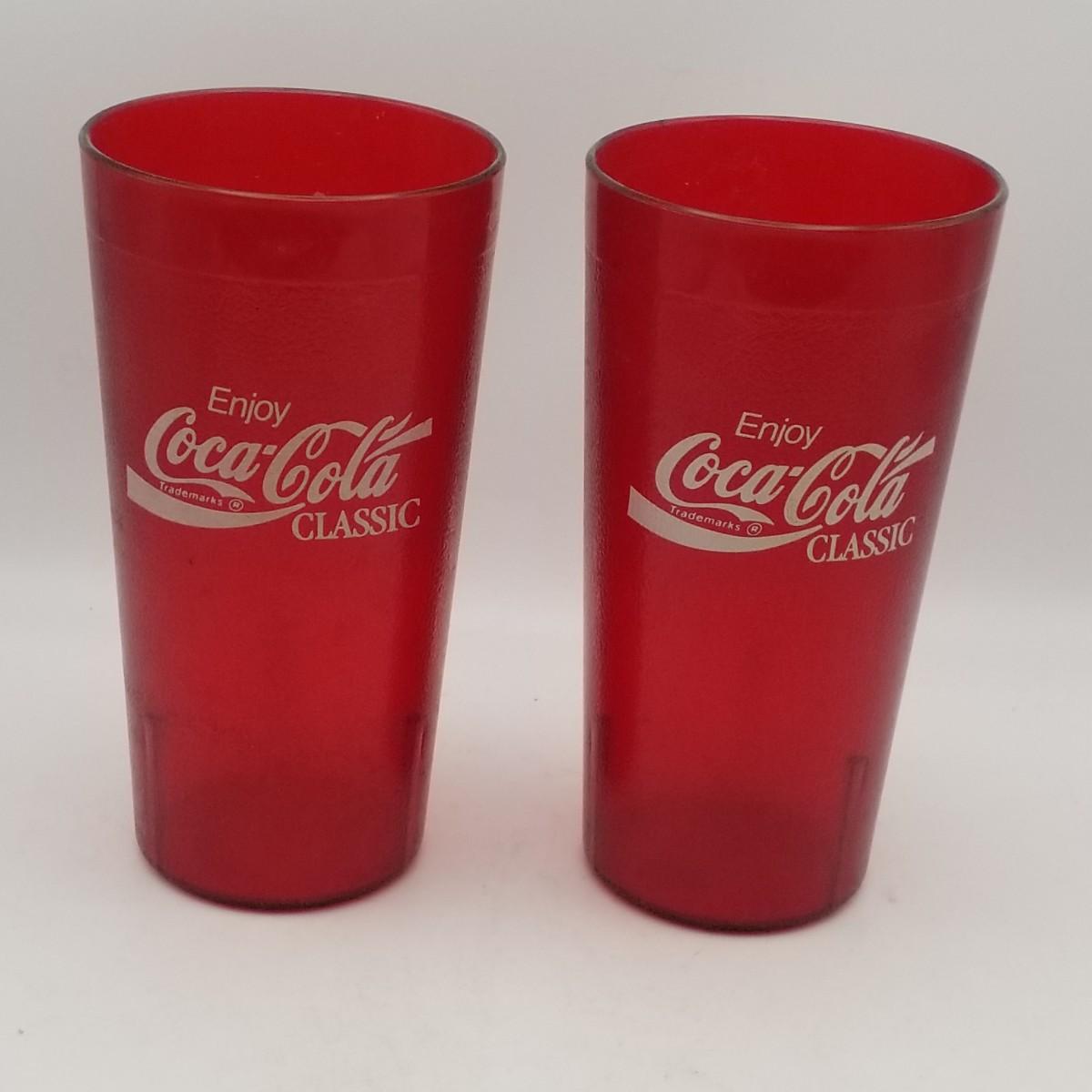 Set of 2 Red Plastic Coca Cola Classic Cups, approximately 3 wide x 6 1/2 inches.