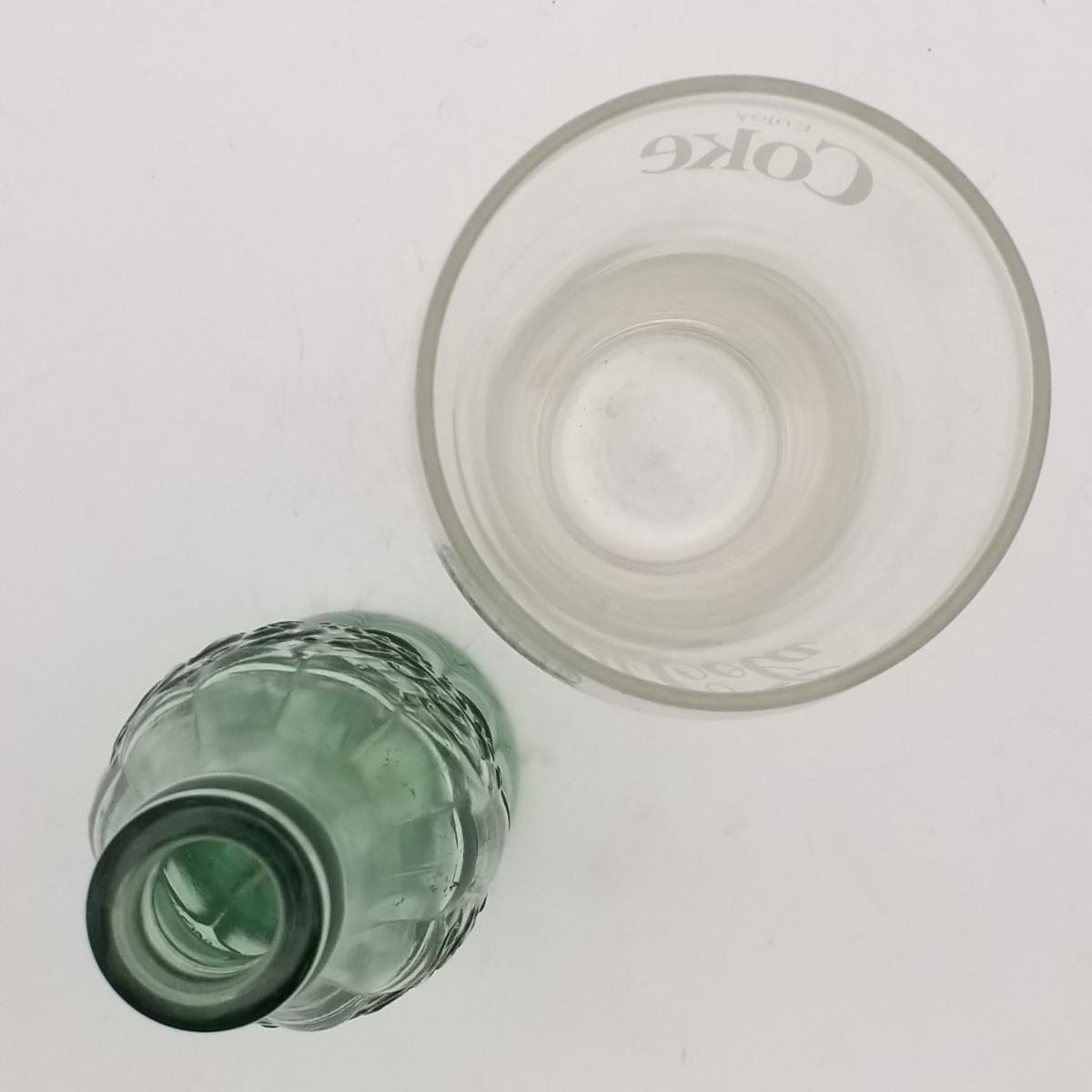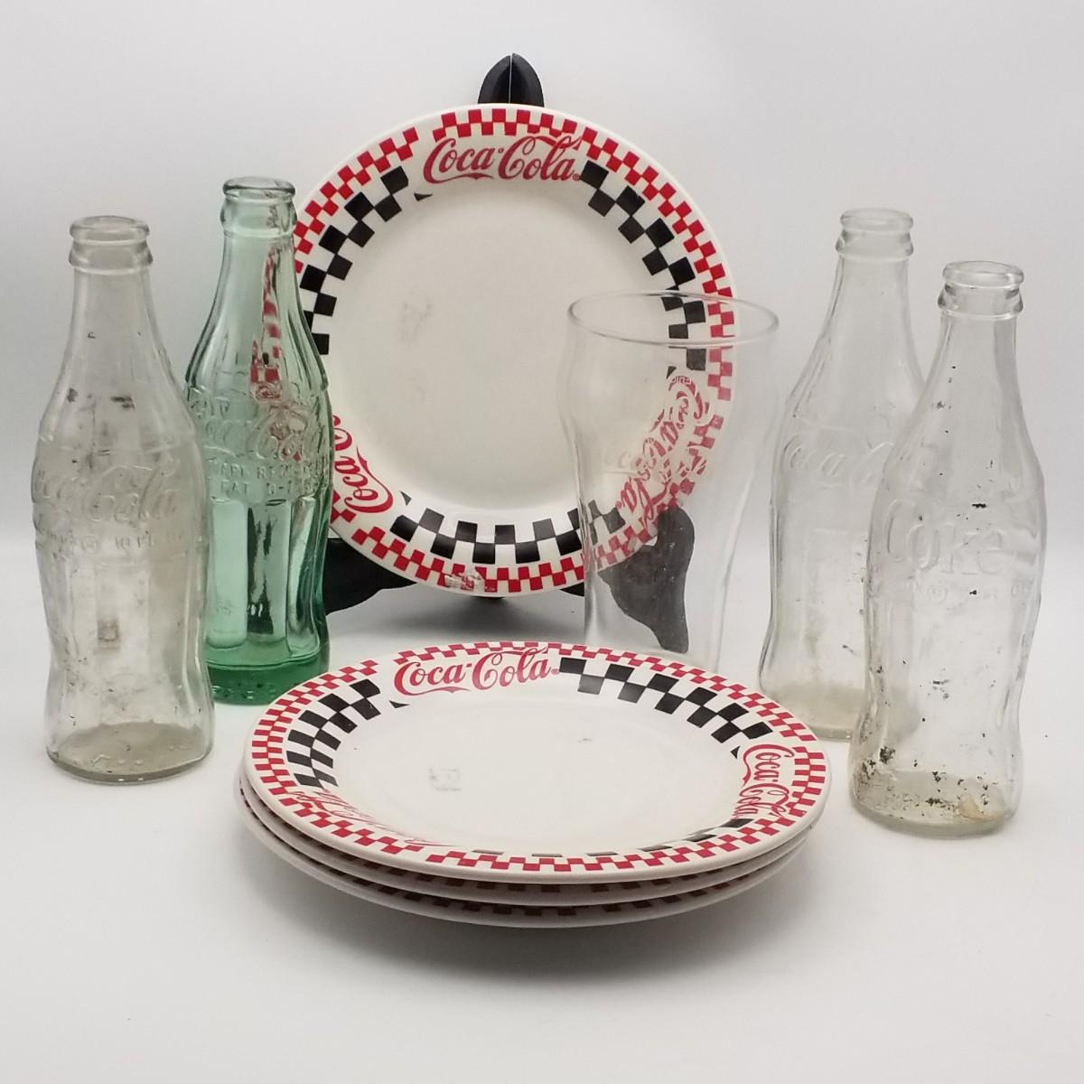 Title: Lot of Vintage Coca-Cola: Set of 4 Glass Soda Pop Bottles (Green, Clear), Set of 4 Red And Black Checkered Ceramic Plates Saucers, 1 Coca Cola Clear Fountain Glass