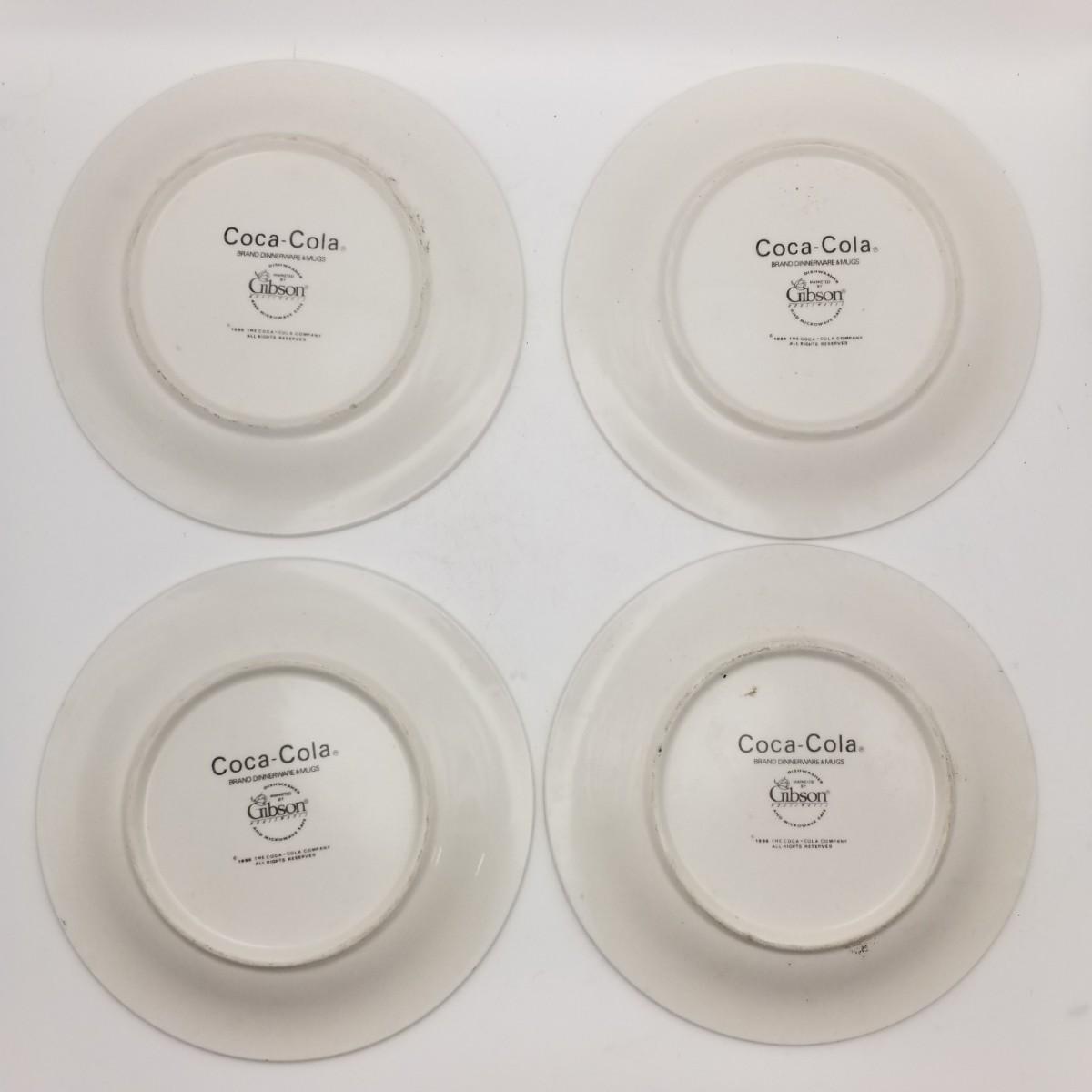 Lot of Vintage Coca-Cola: Set of 4 Glass Soda Pop Bottles (Green - Rockville Ind Indiana, Clear), Set of 4 Red And Black Checkered Ceramic Gibson 1996 Plates Saucers, 1 Coca Cola Clear Fountain Glass