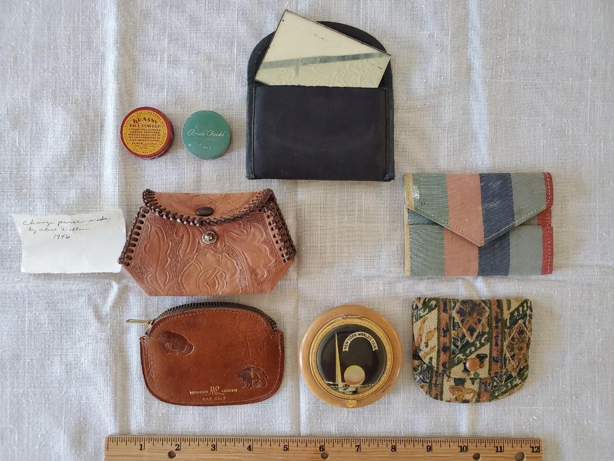 4 coin purses, 1 compact, 2 tiny face powder tins (that still have some powder in them!).
