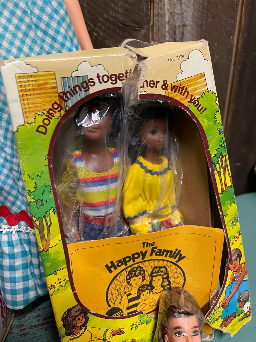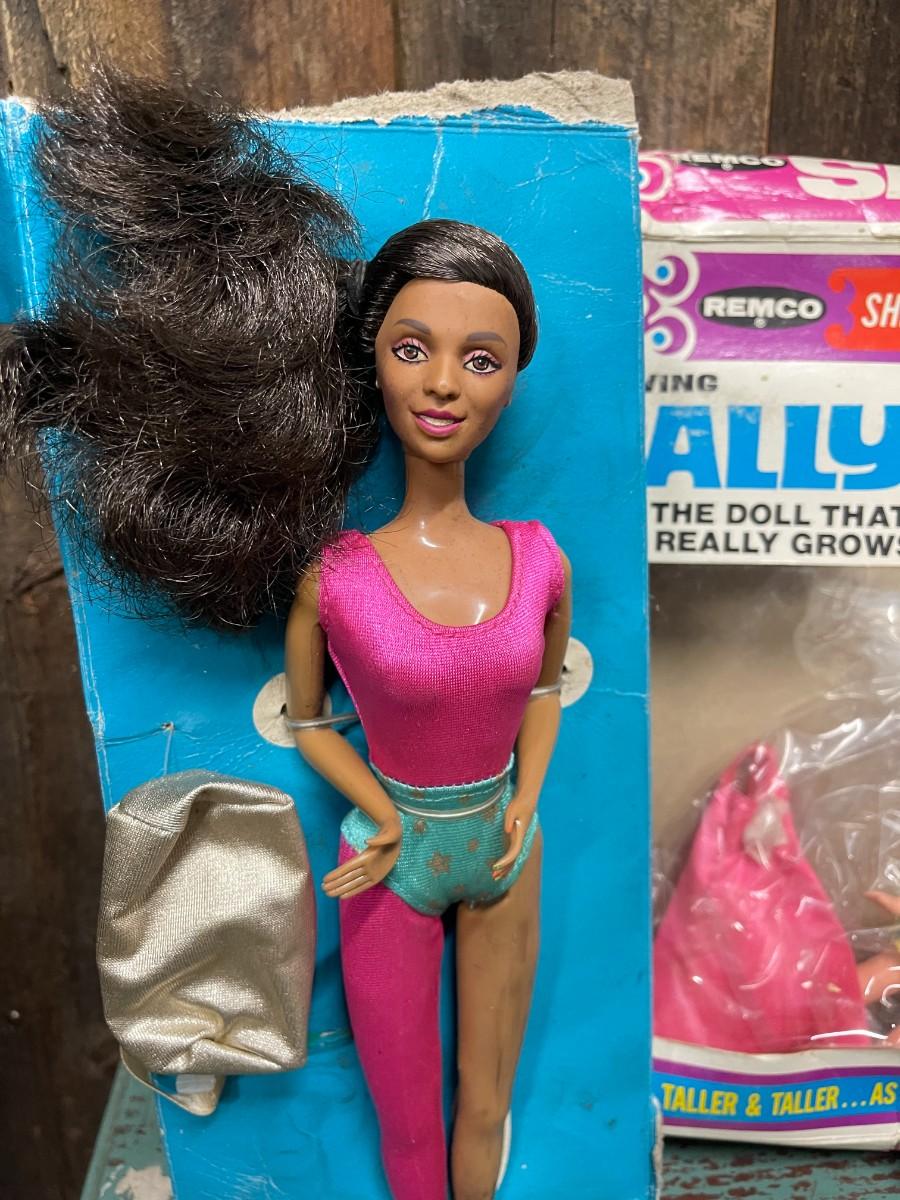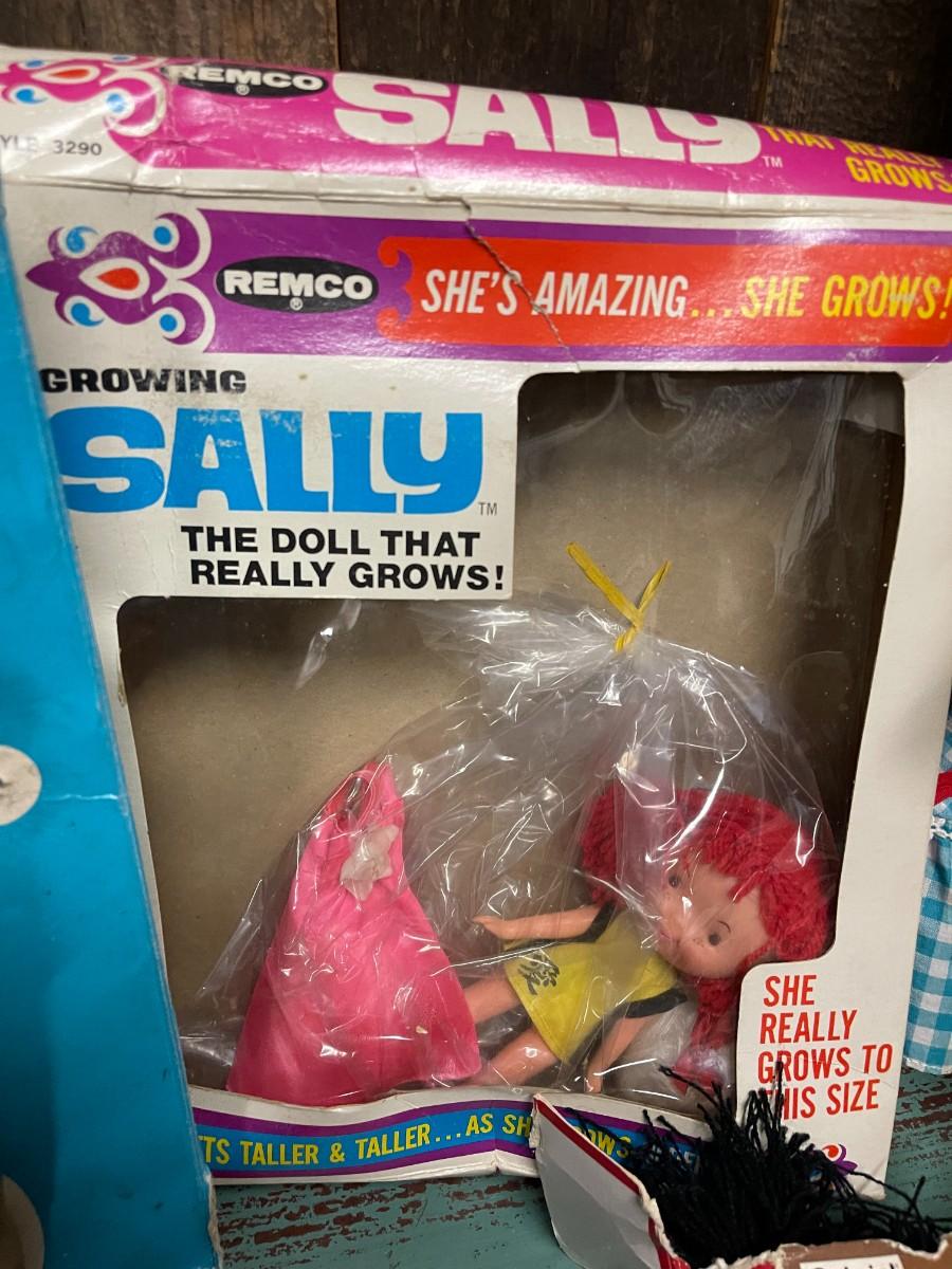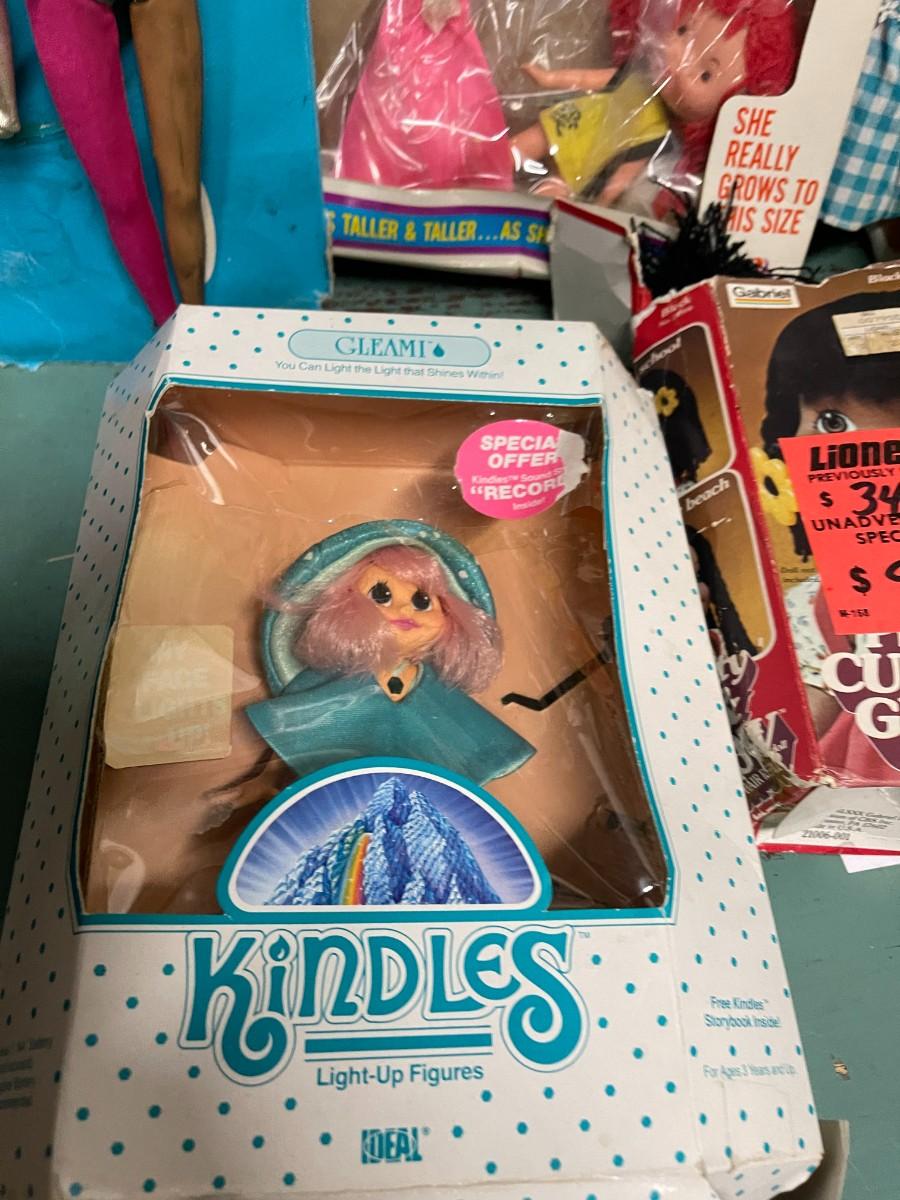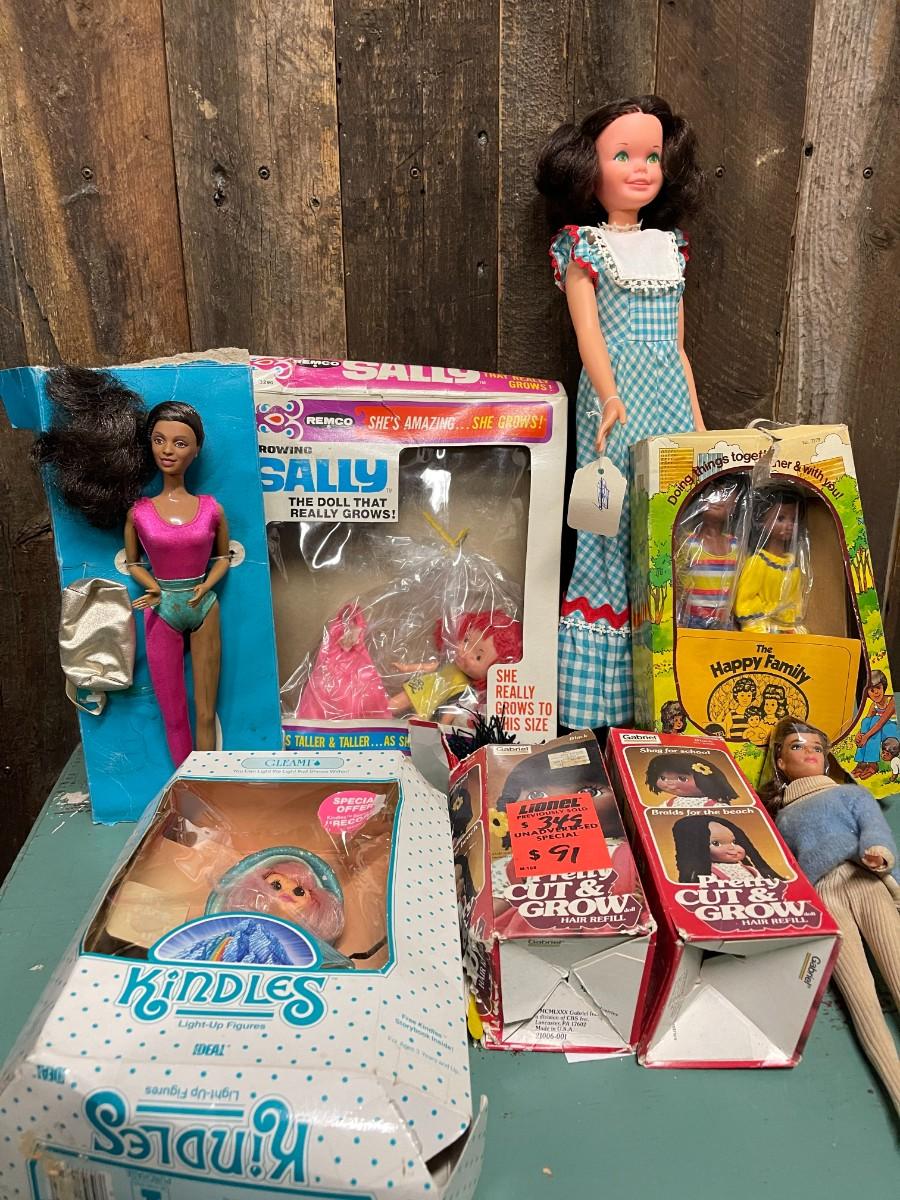 Lot of Vintage Collectible Toys: Kindles Gleami, new in box (box is damaged), Remco Growing Sally, vintage 1989 Flojo Doll, Quick Curl Casey, Pretty Cut & Grow Dolls, Happy Family, 1982 Brook Shields Doll