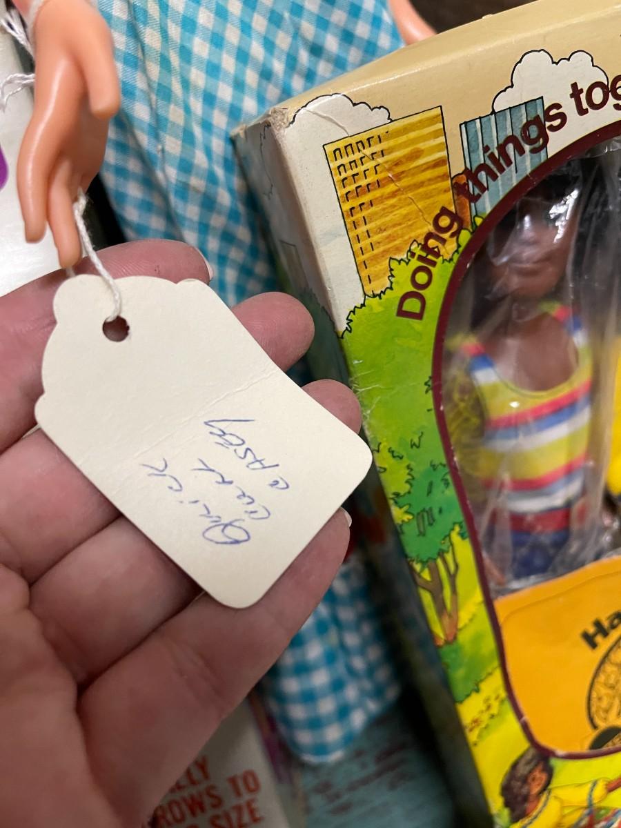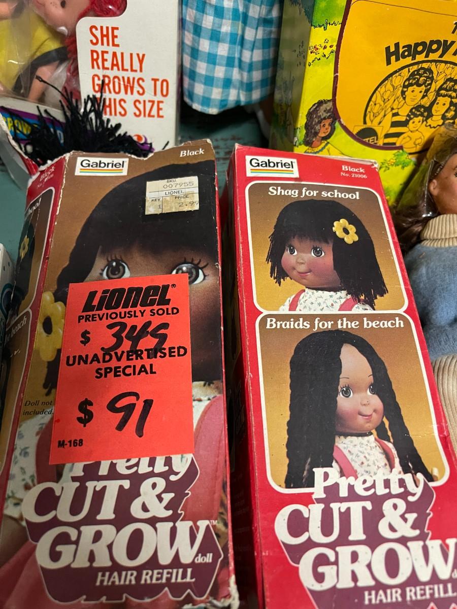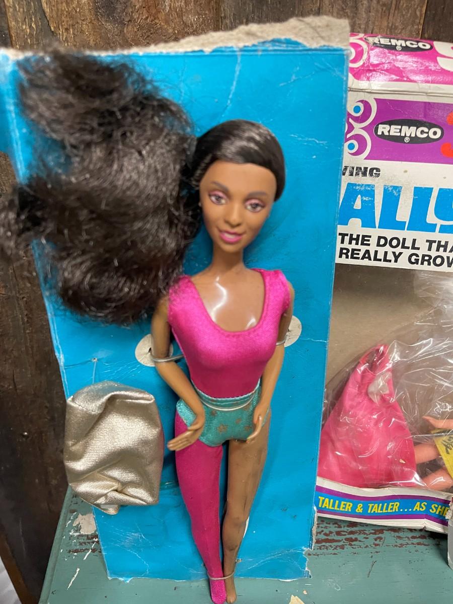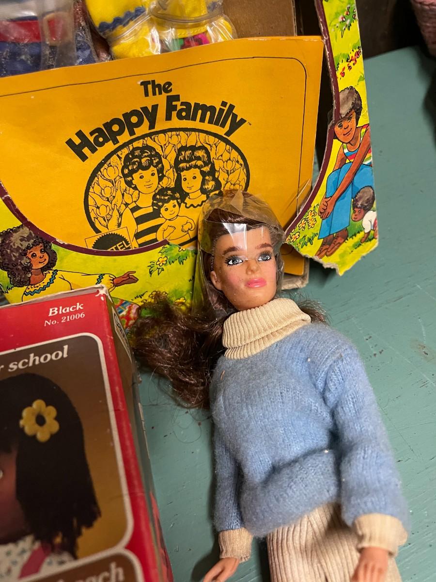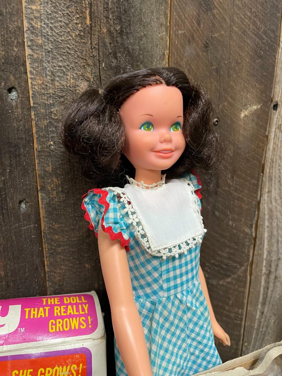 Lot of Vintage Collectible Toys: Kindles Gleami, new in box (box is damaged), Remco Growing Sally, vintage 1989 Flojo Doll, Quick Curl Casey, Pretty Cut & Grow Dolls, Happy Family, 1982 Brook Shields Doll