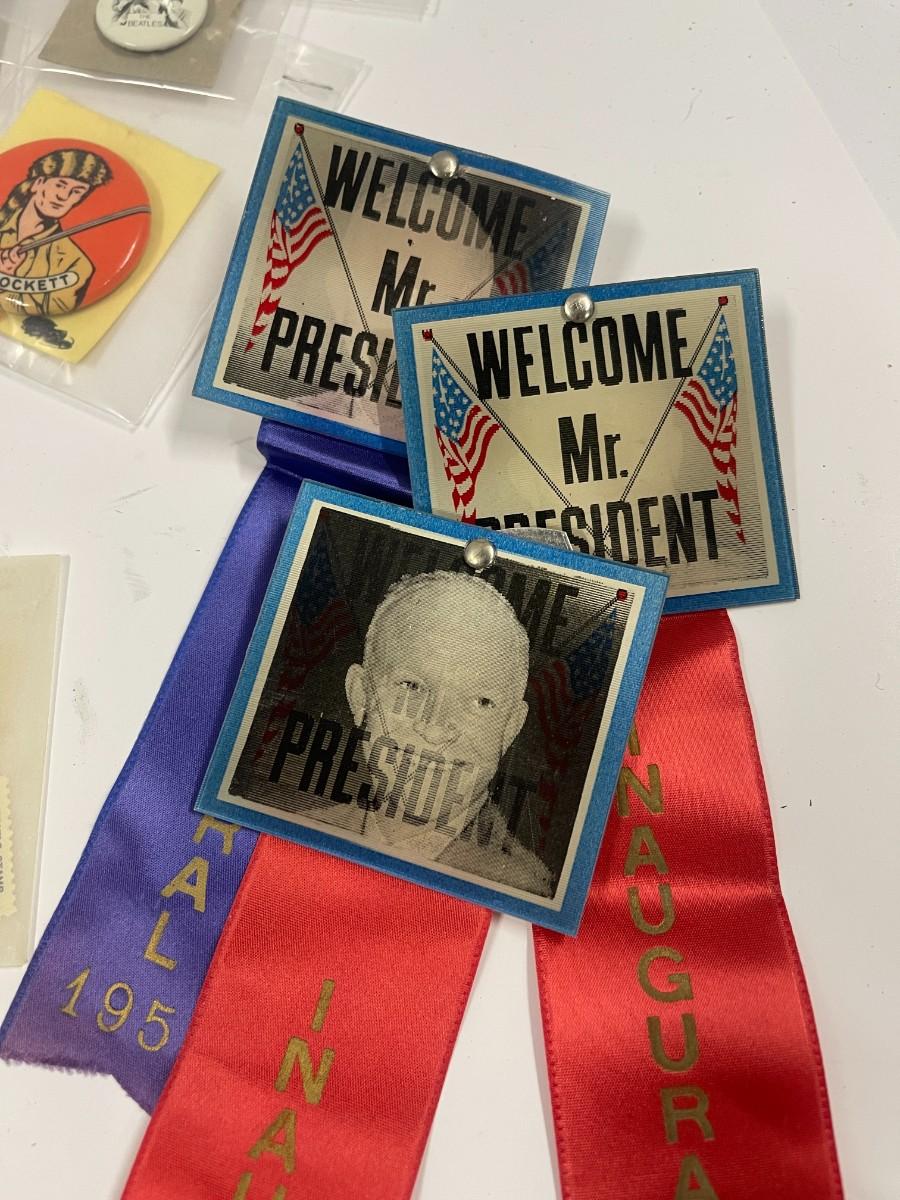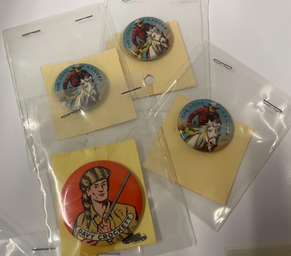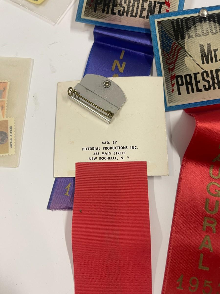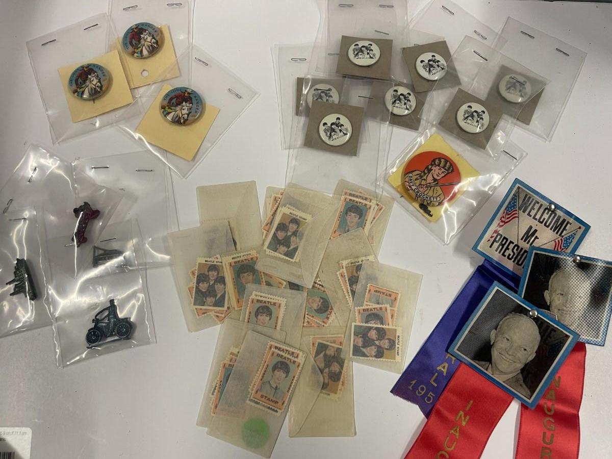 Lot of vintage collectibles. Includes: 7 Beatles pins, a lot of Beatles collector stamps, 3 Lone Ranger pins, 1 Davy Crockett pin, lot of Cracker Jack prize toys, lot of 5 Eisenhower inauguration lenticular pins.