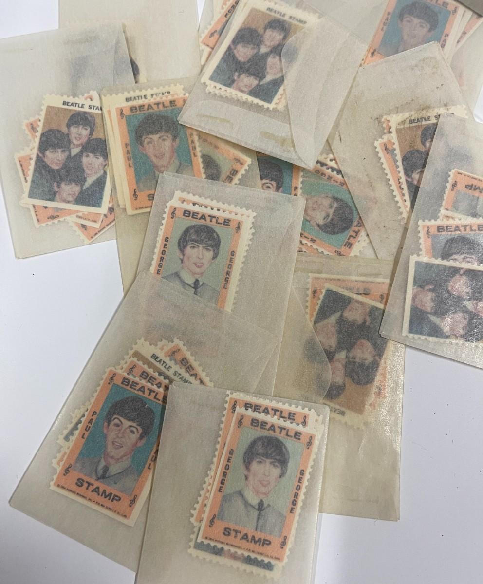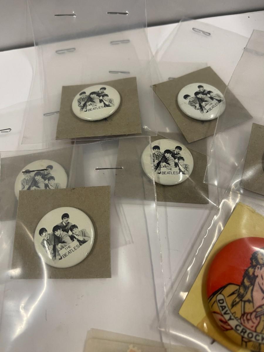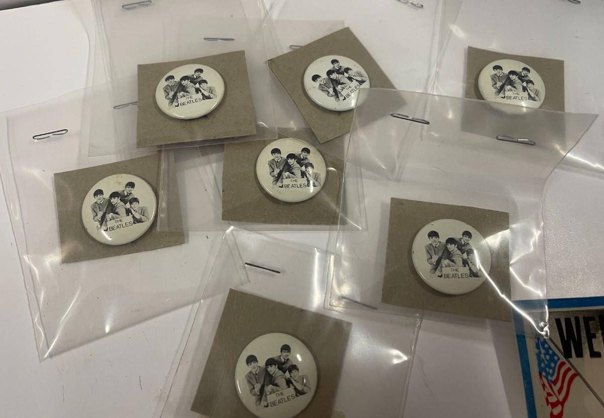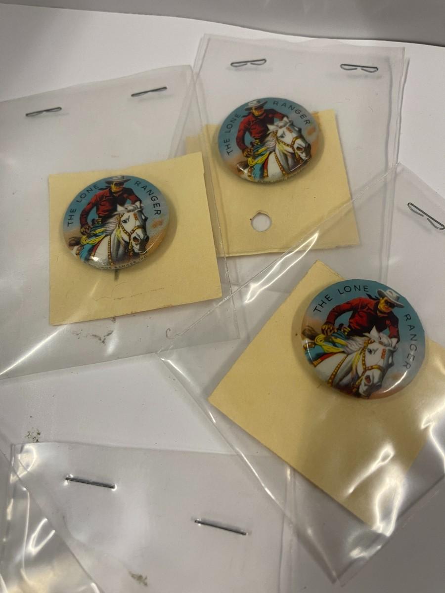 Lot of vintage collectibles. Includes: 7 Beatles pins, a lot of Beatles collector stamps, 3 Lone Ranger pins, 1 Davy Crockett pin, lot of Cracker Jack prize toys, lot of 5 Eisenhower inauguration lenticular pins.