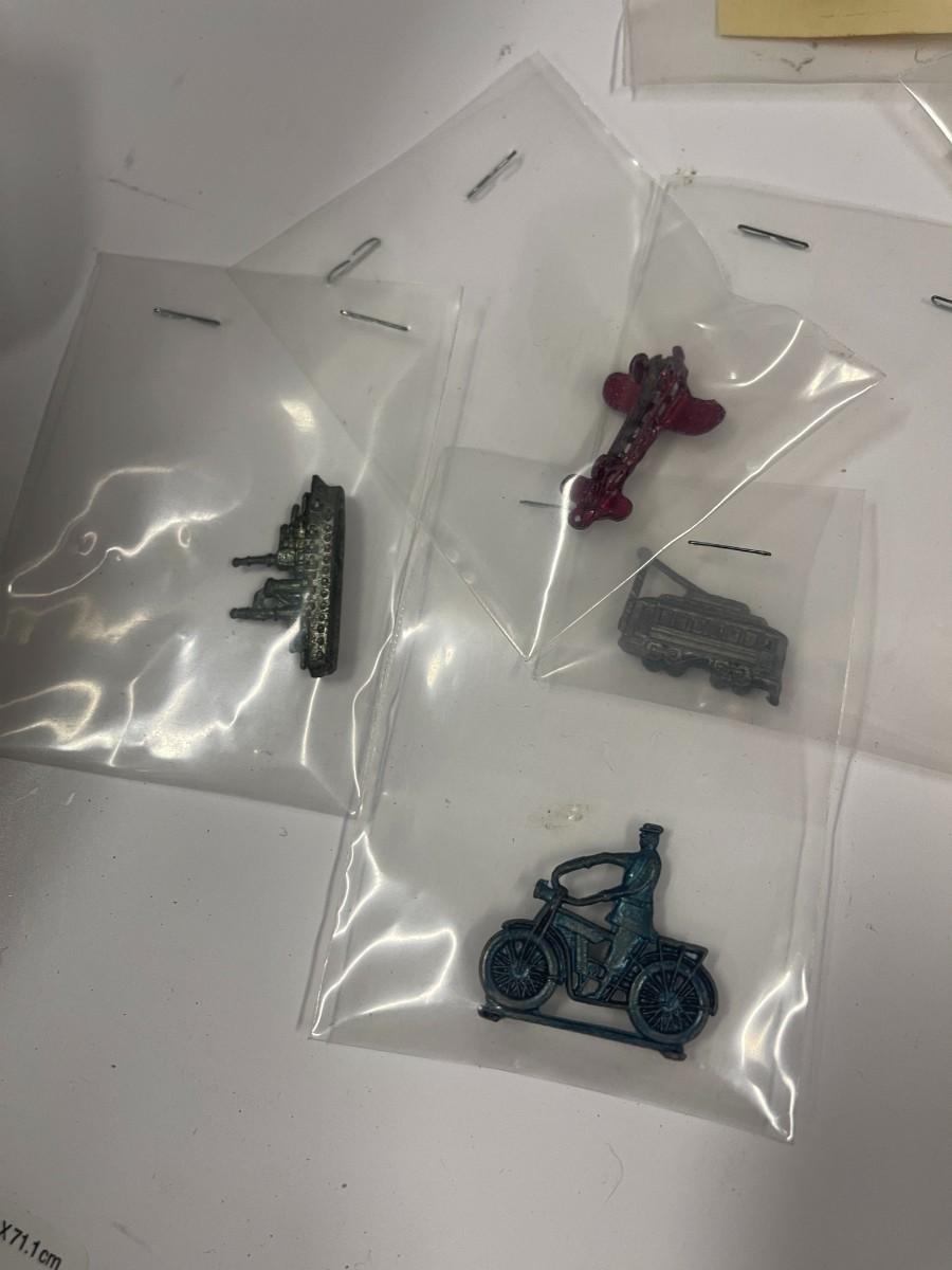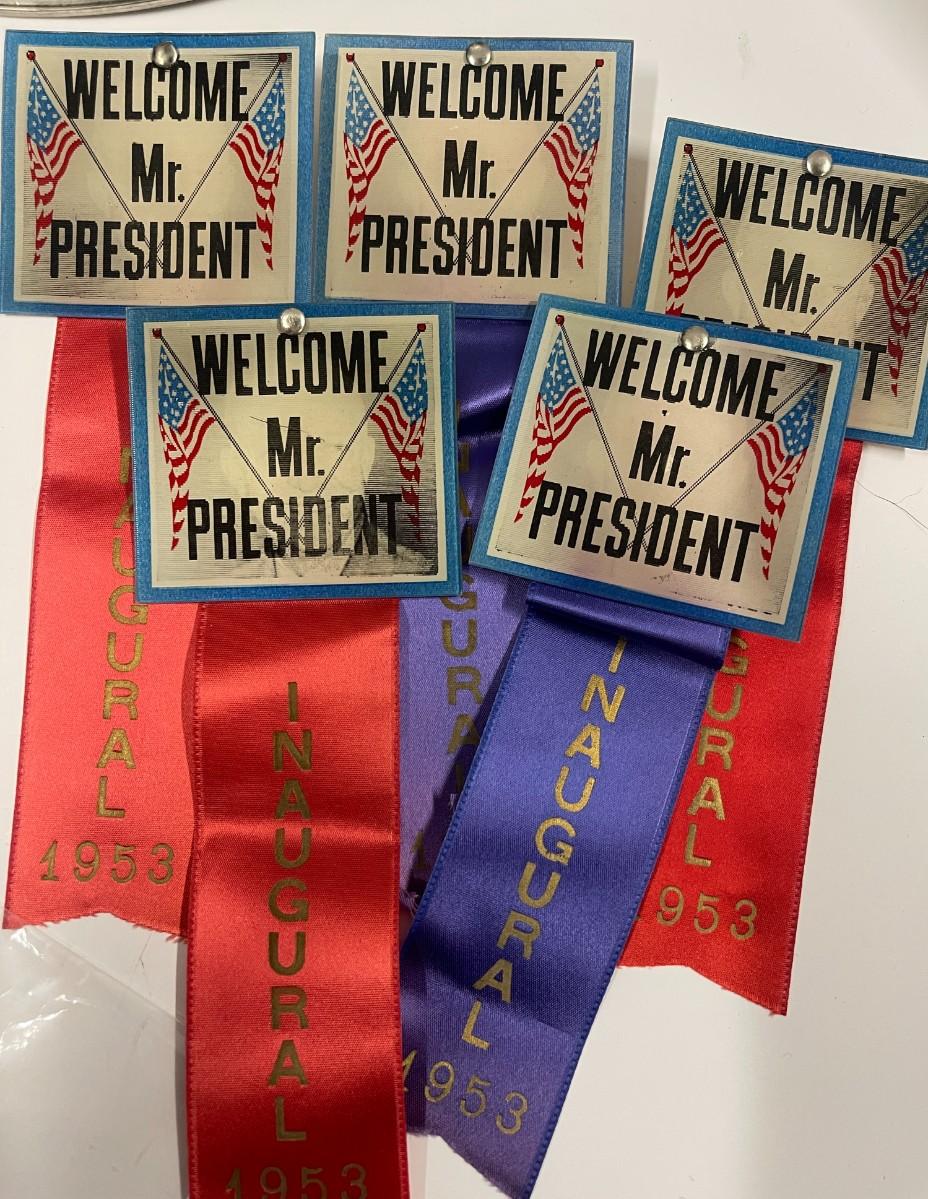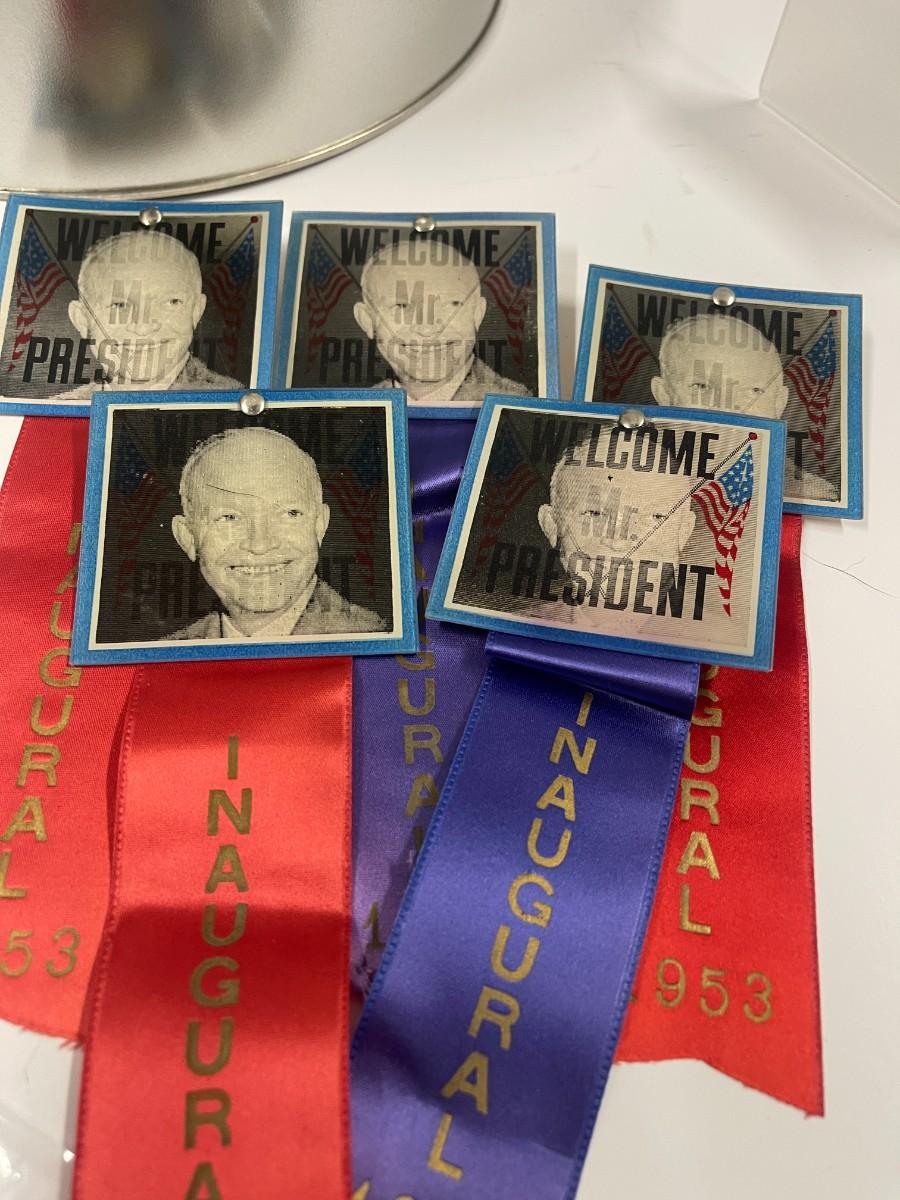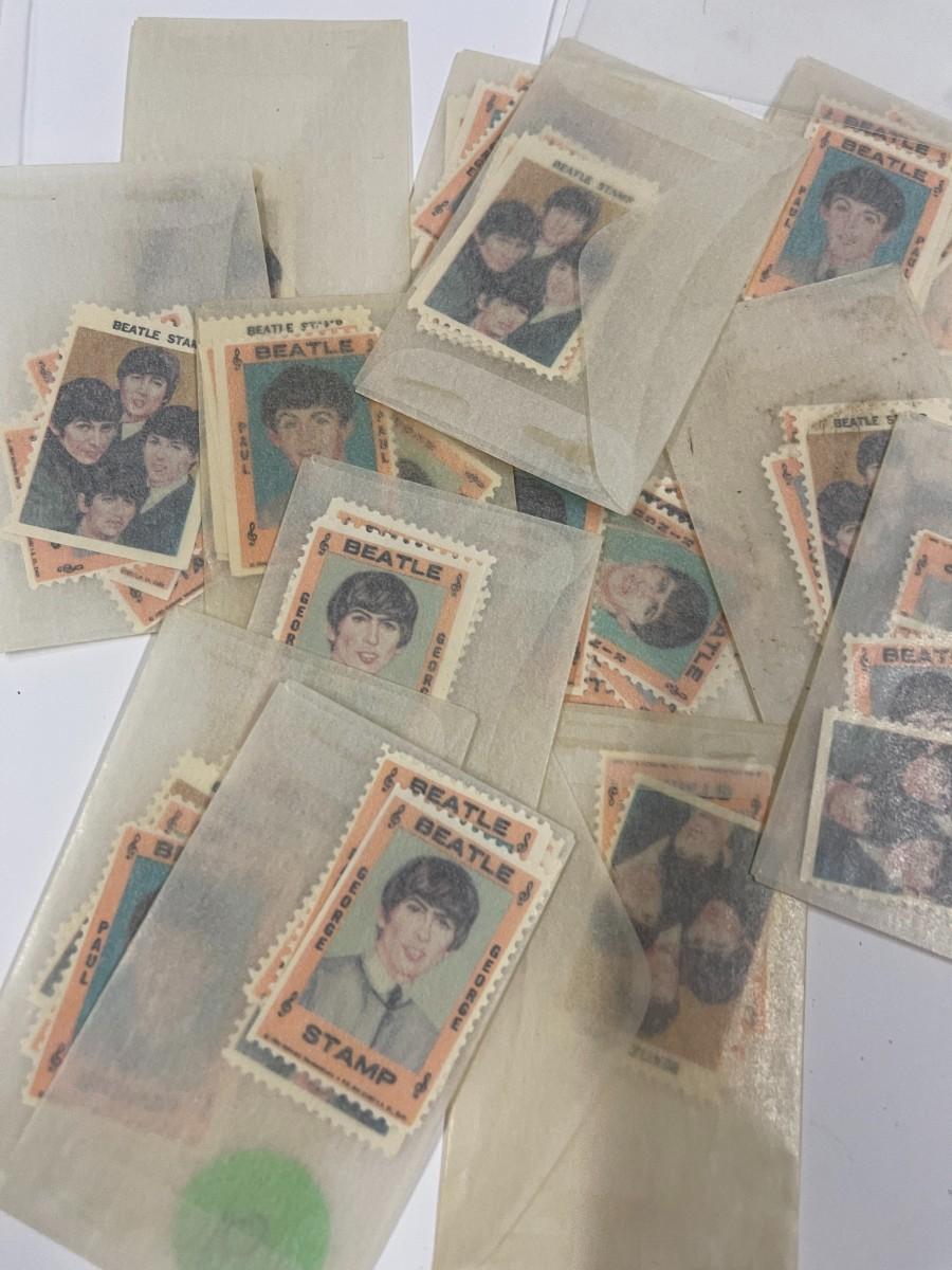 Lot of vintage collectibles. Includes: 7 Beatles pins, a lot of Beatles collector stamps, 3 Lone Ranger pins, 1 Davy Crockett pin, lot of Cracker Jack prize toys, lot of 5 Eisenhower inauguration lenticular pins.