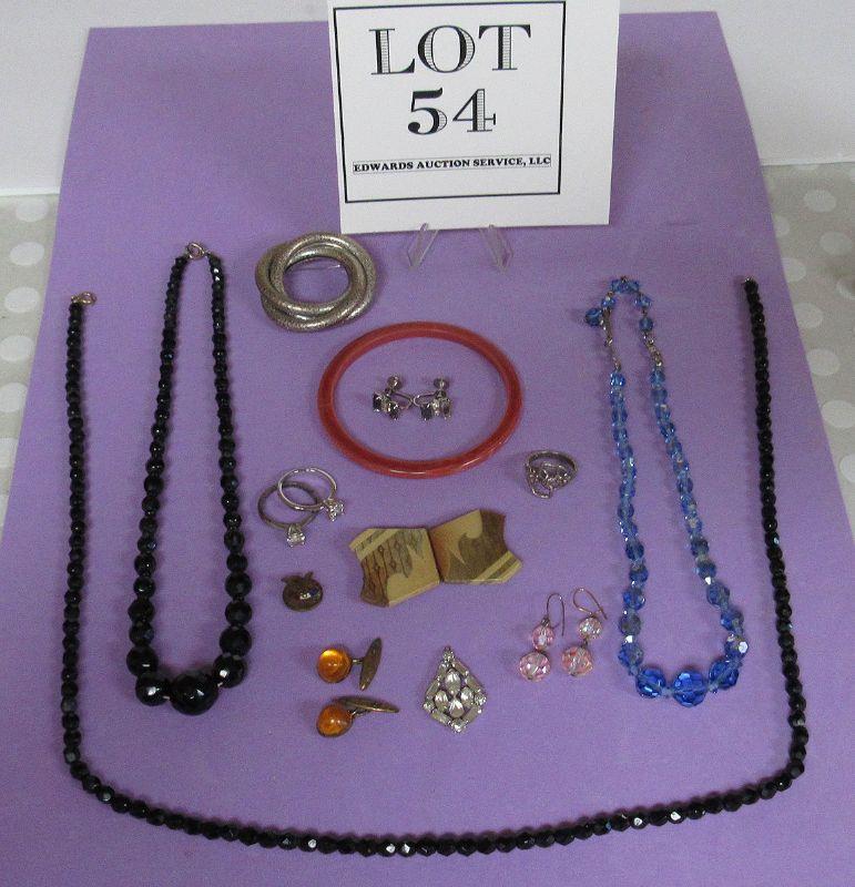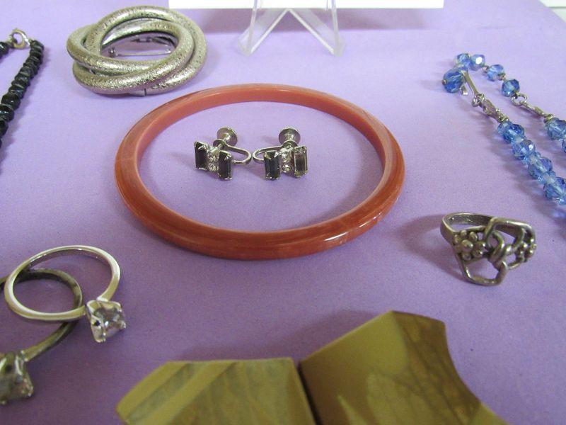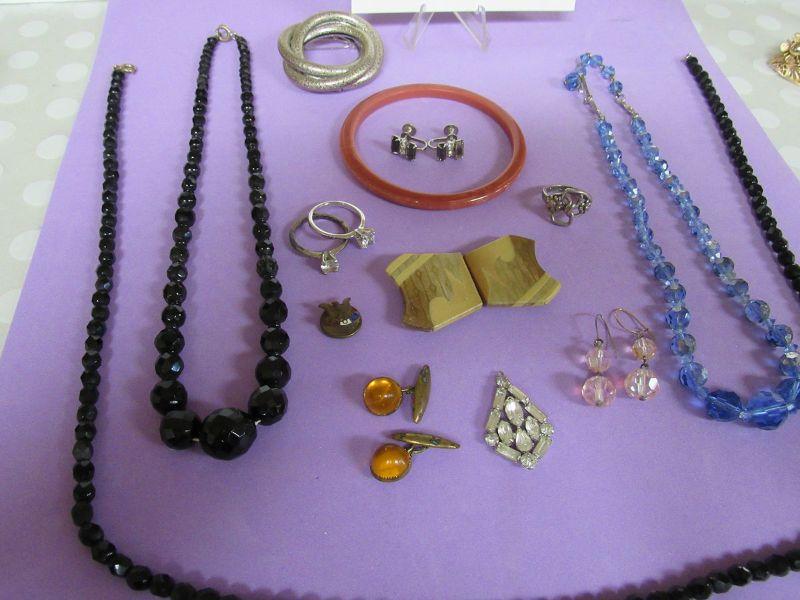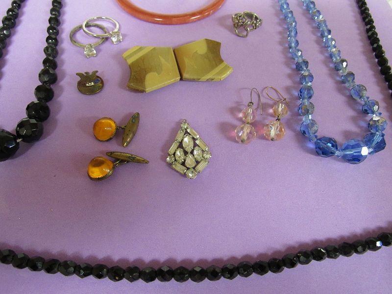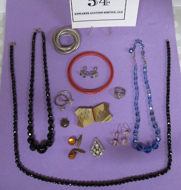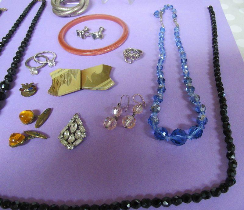 All in good condition overall. The smaller black stone necklace largest bead has some damage on one side, see last photo. Included is a bracelet, pin, earrings, rhinestone pendant, 2 sterling Avon rings, 1 freeform sterling ring, German plastic and metal belt buckle. The larger black necklace hangs down 13 1/2". Shipping is available on this lot at actual shipping cost plus a $5.00 handling fee.
